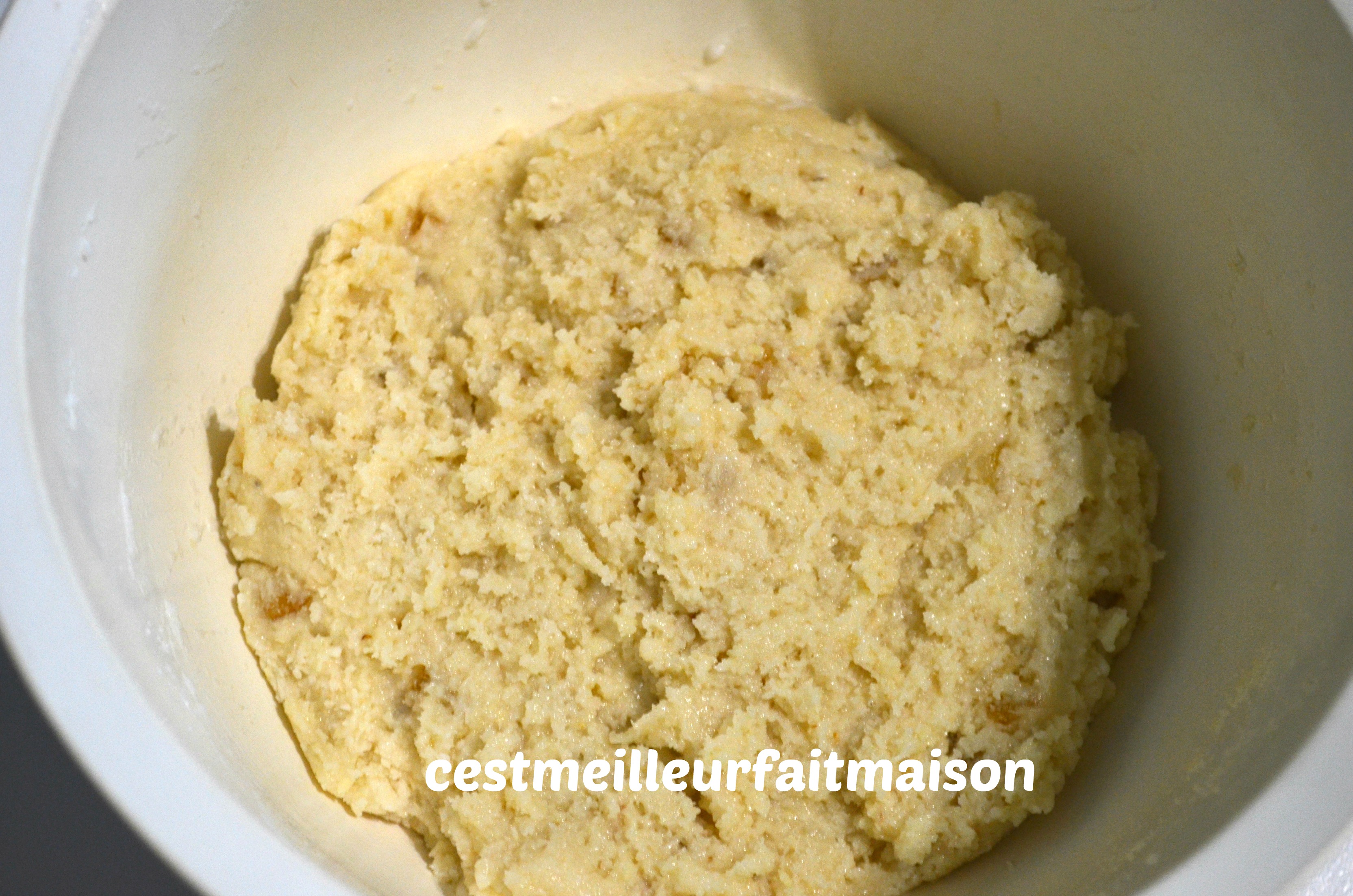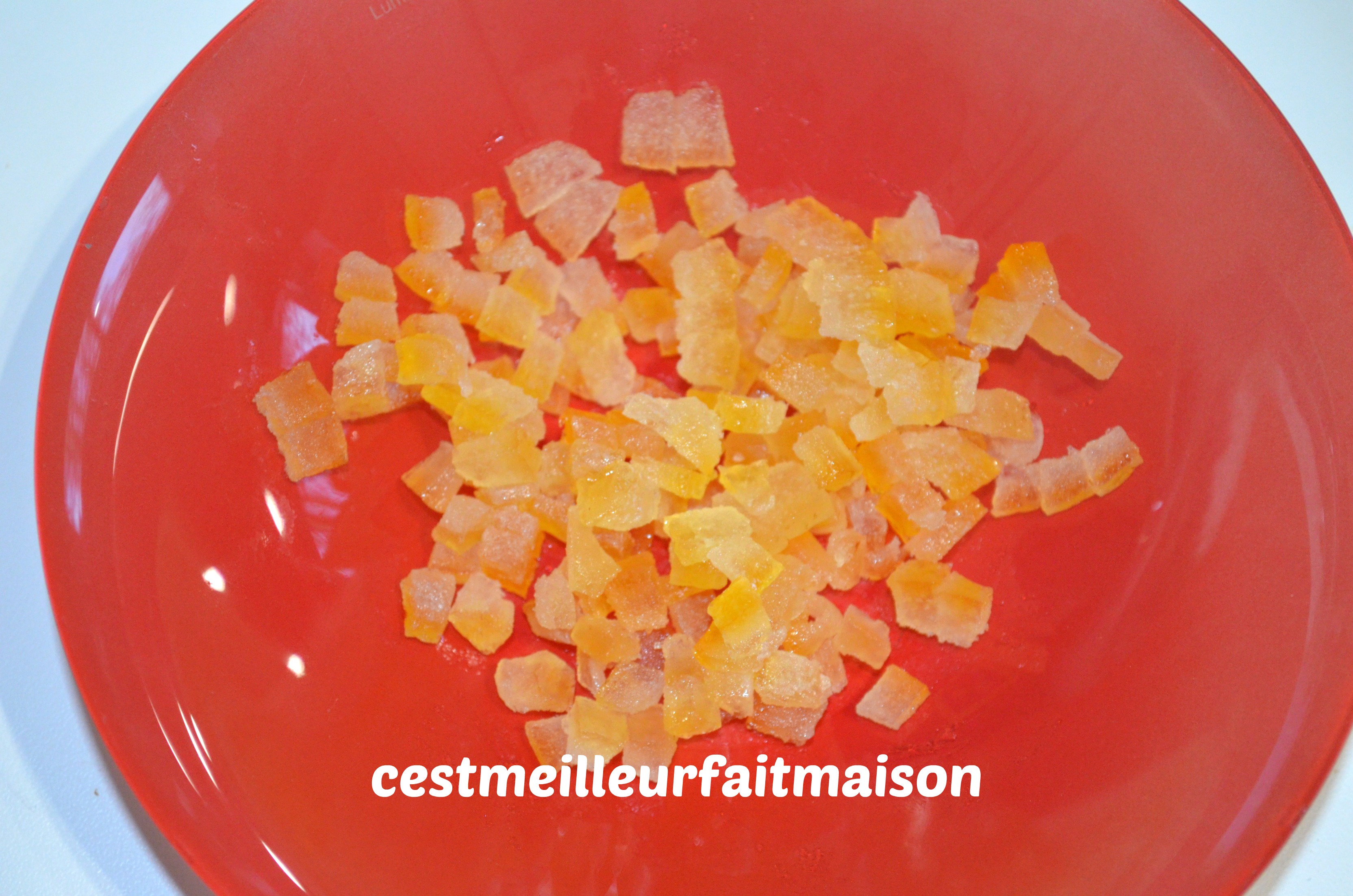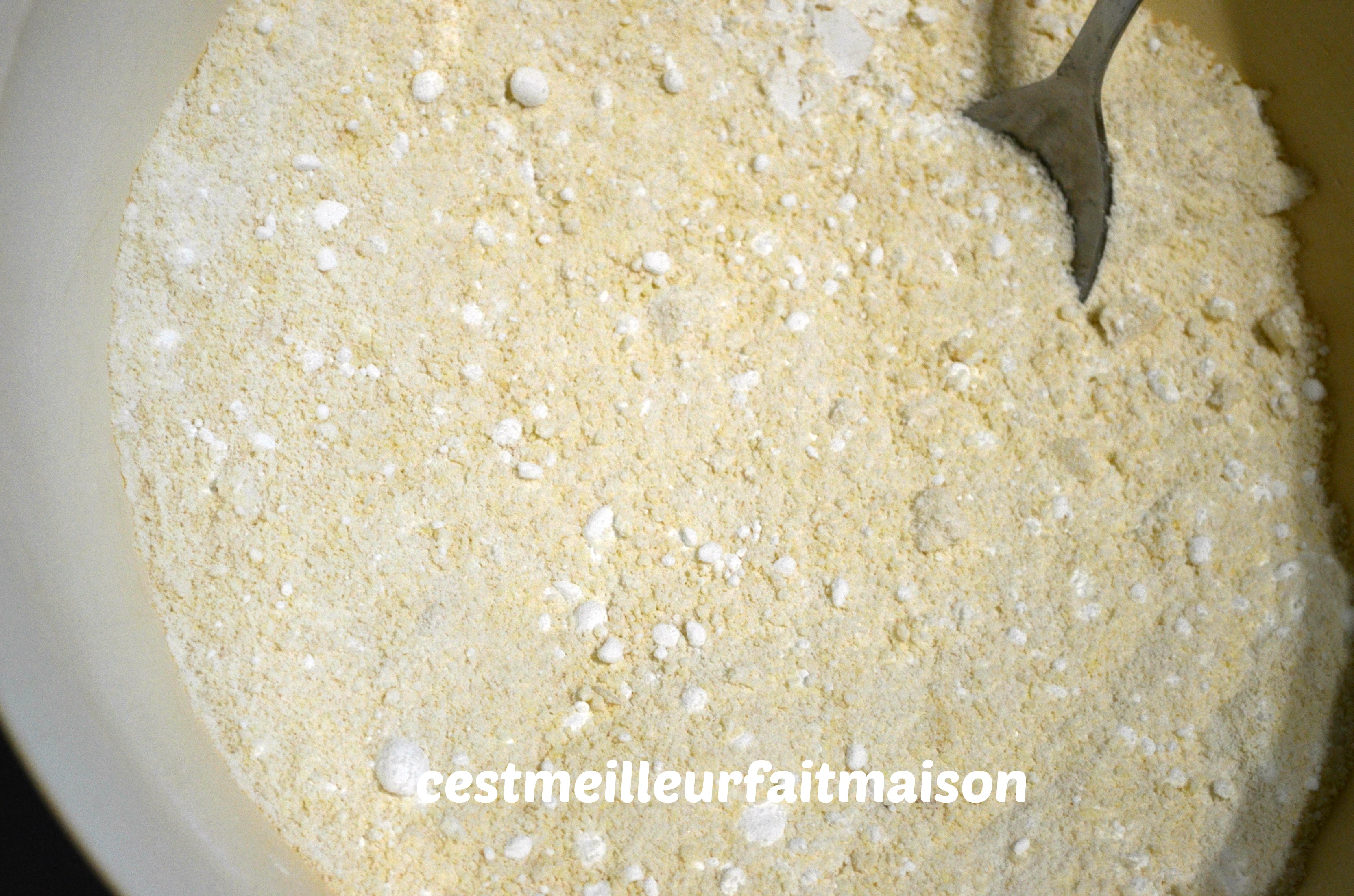 2- Dans un saladier, mélanger le sucre glace, la poudre d’amande, la levure, l’extrait d’amande amère et les oranges confites.
