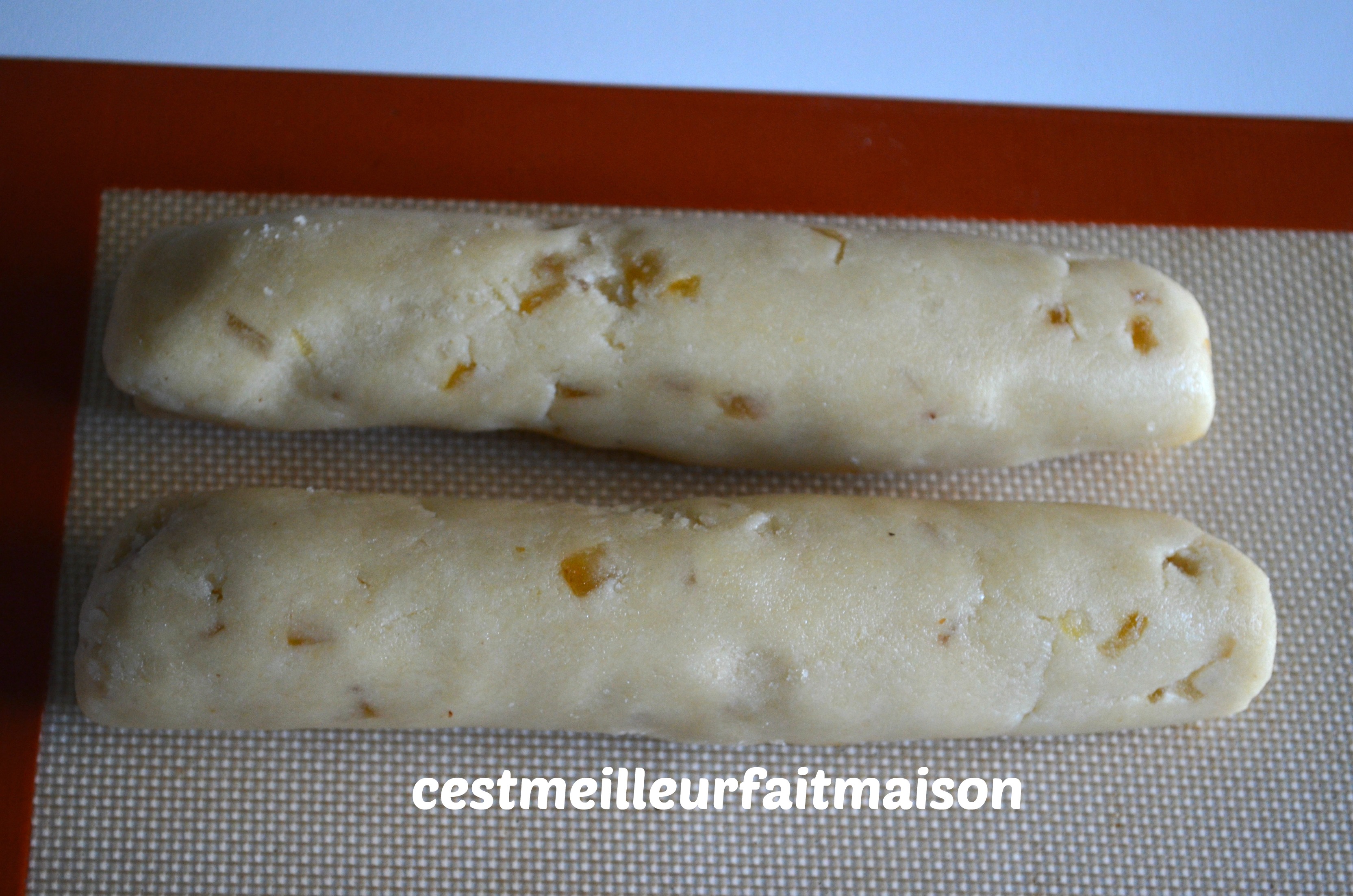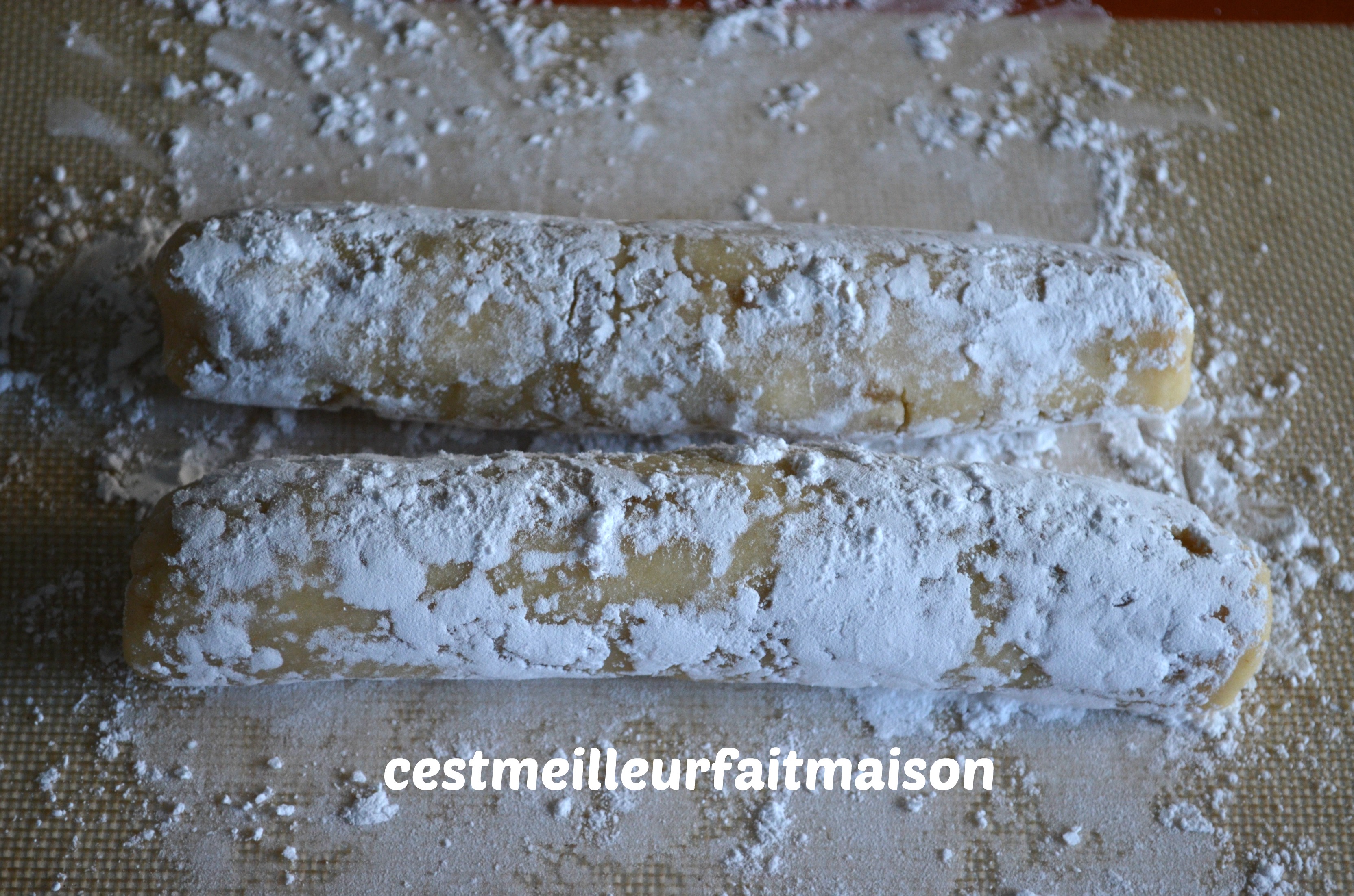 Avec la pâte, confectionner deux boudins d’environ 5 cm de diamètre. Les rouler dans du sucre glace.