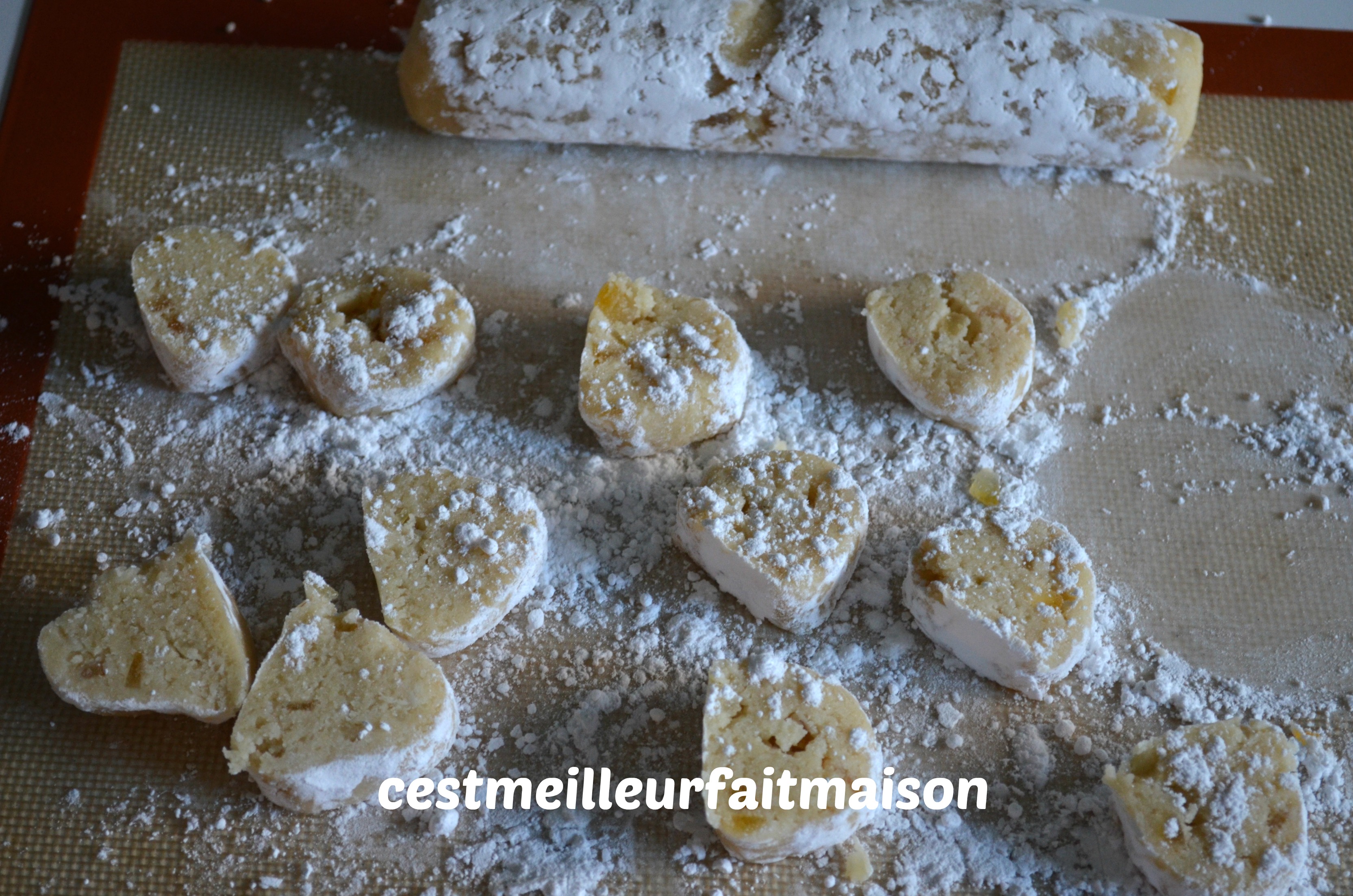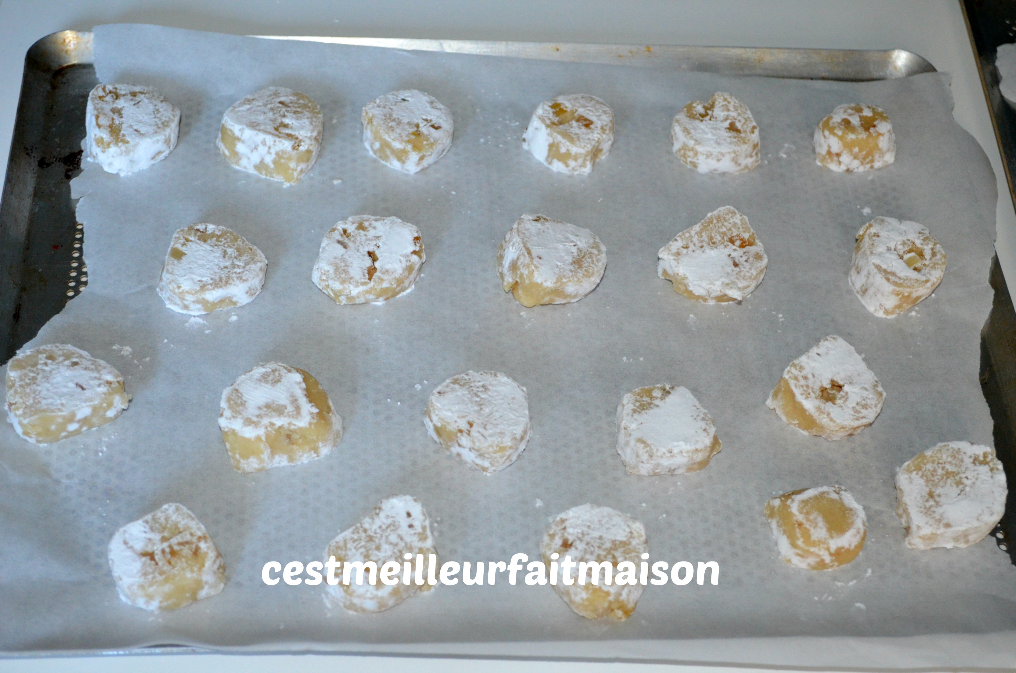 5- Couper des tranches d’un centimètre d’épaisseur et les enrober de sucre glace. Déposer les tranches sur une plaque de cuisson recouverte de papier cuisson.