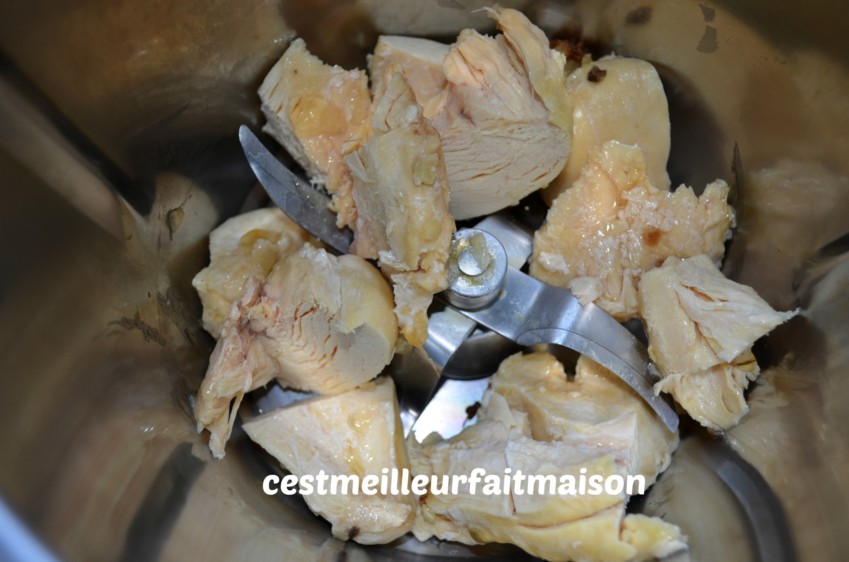 Il me restait deux blancs de poulet trop secs pour être mangé comme ça, alors j’ai eu l’idée de les transformer en rillettes. J’ai trouvé la recette chez PtitChef et c’était parfait. J’ai adapté la recette au Thermomix.
