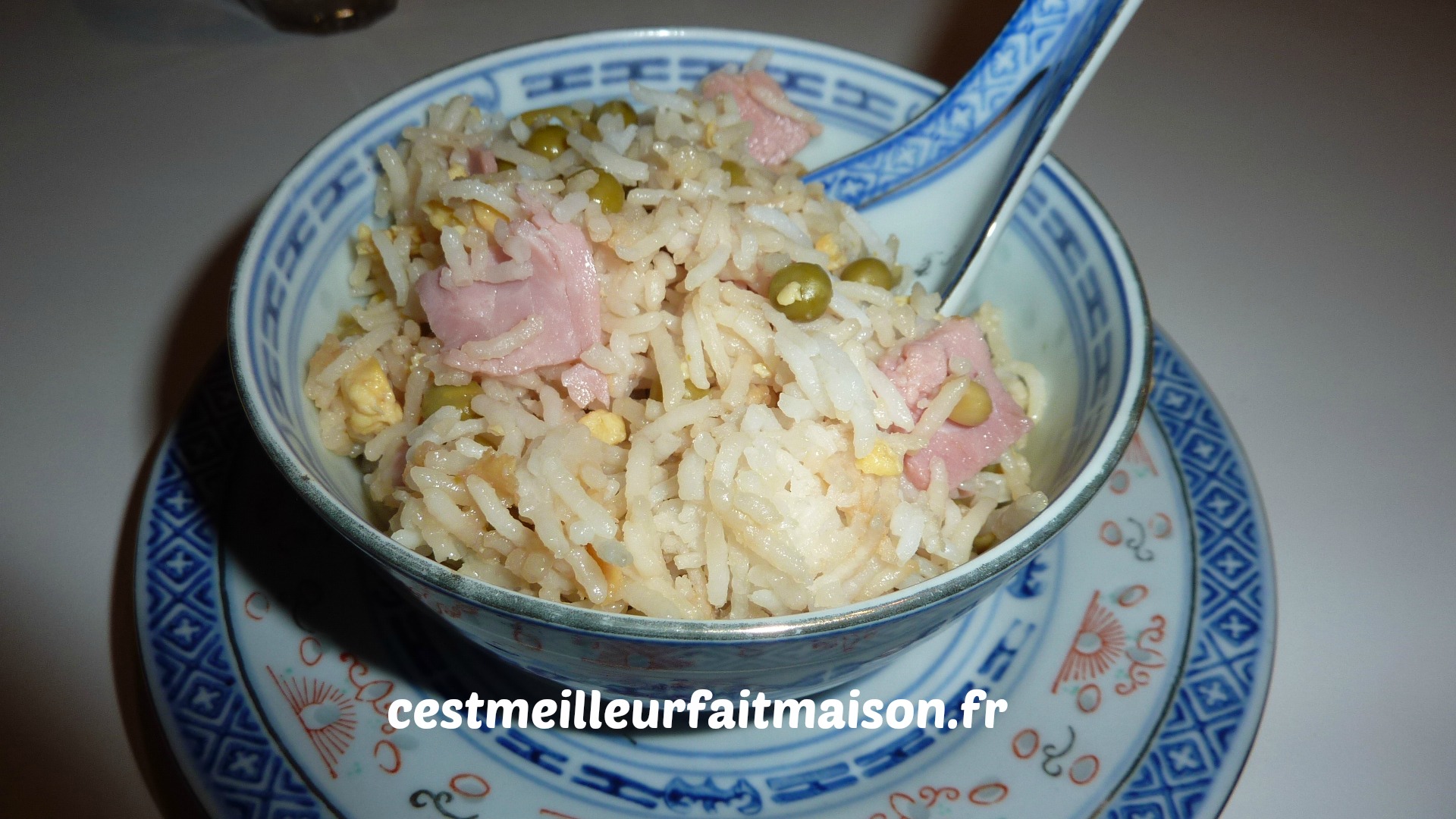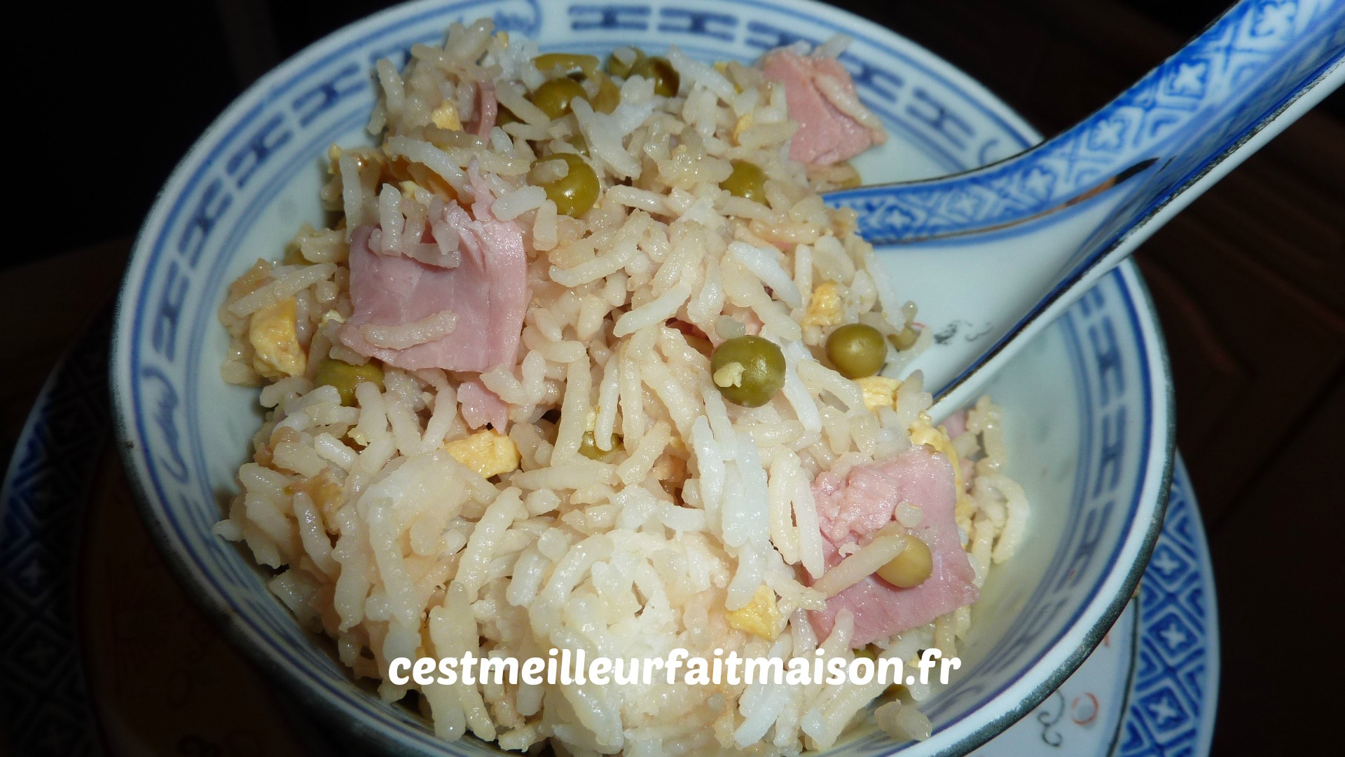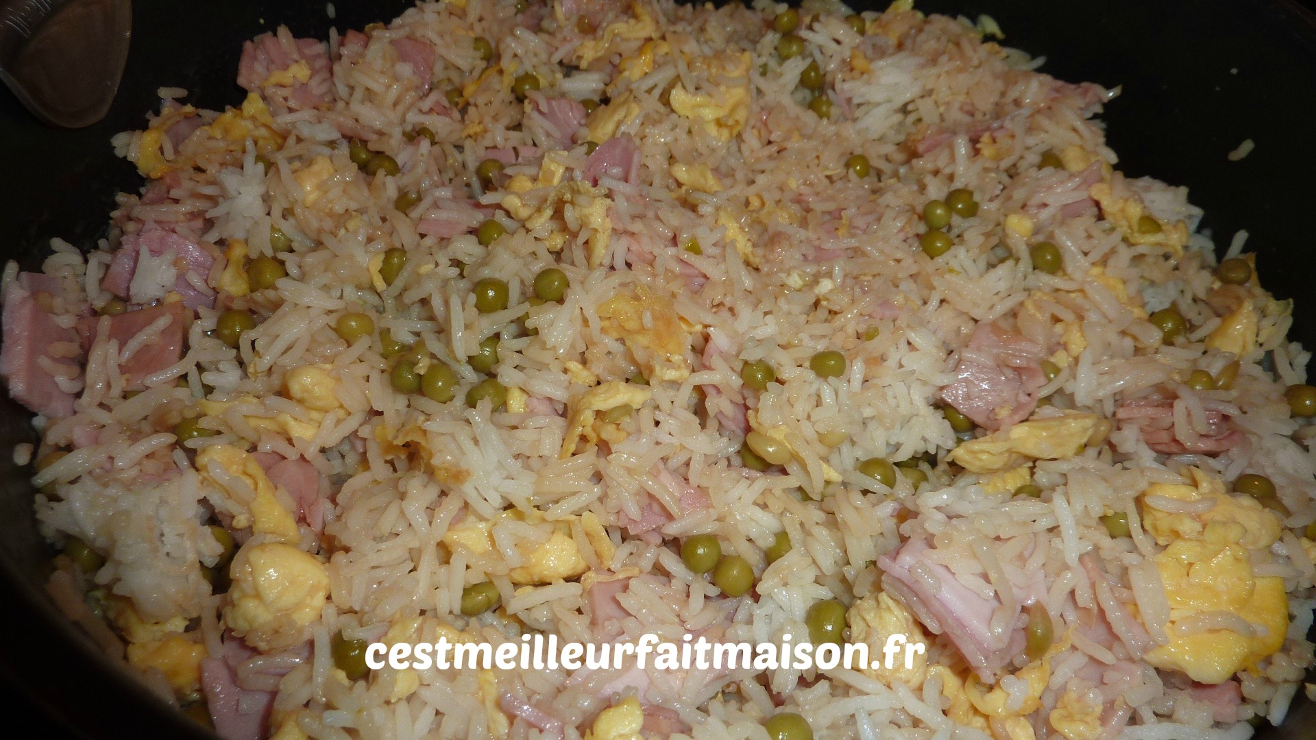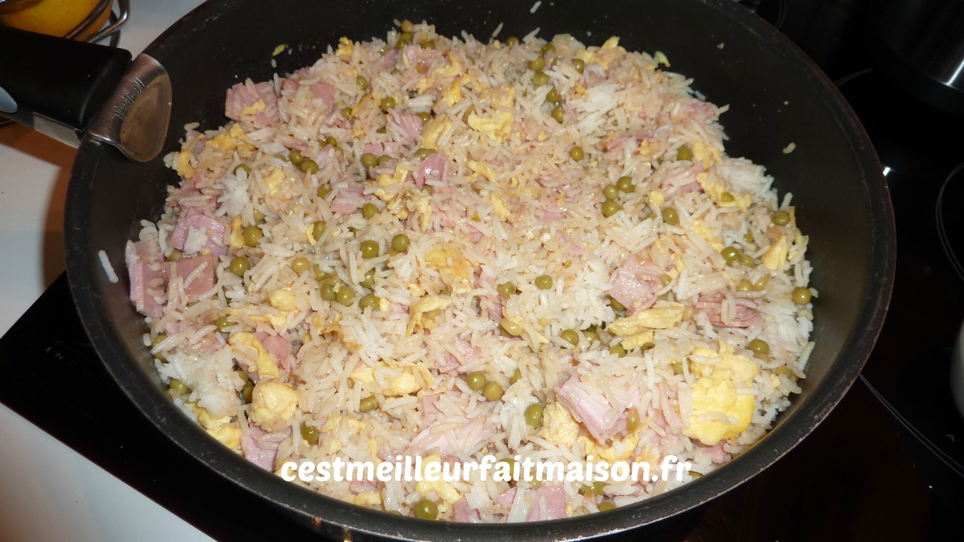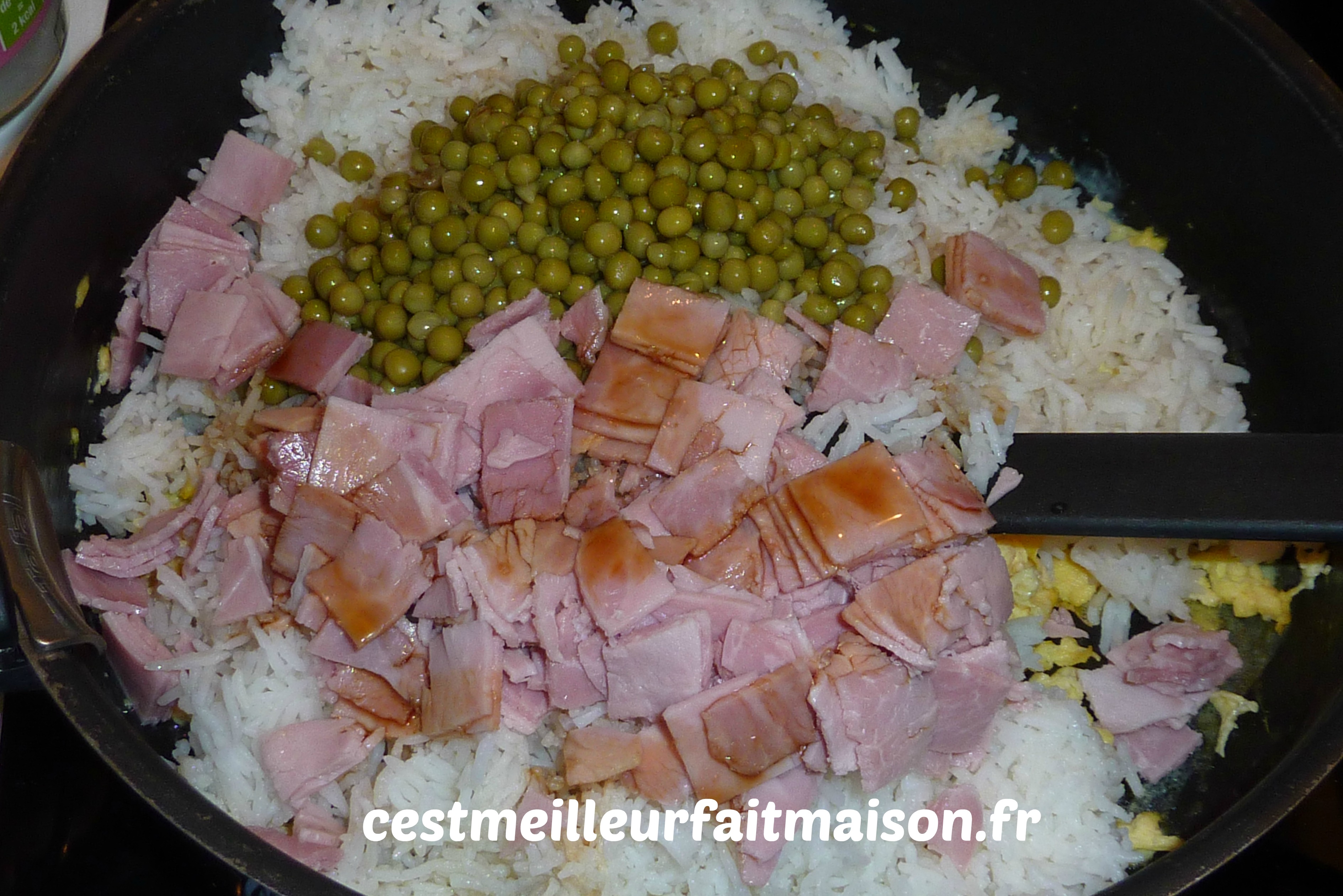 4- Dans la sauteuse, ajouter le riz, le jambon, les petits pois avec le jus et les sauces. Bien mélanger. Goûter et ajouter du sel et du poivre si besoin. Réchauffer avant de passer à table.