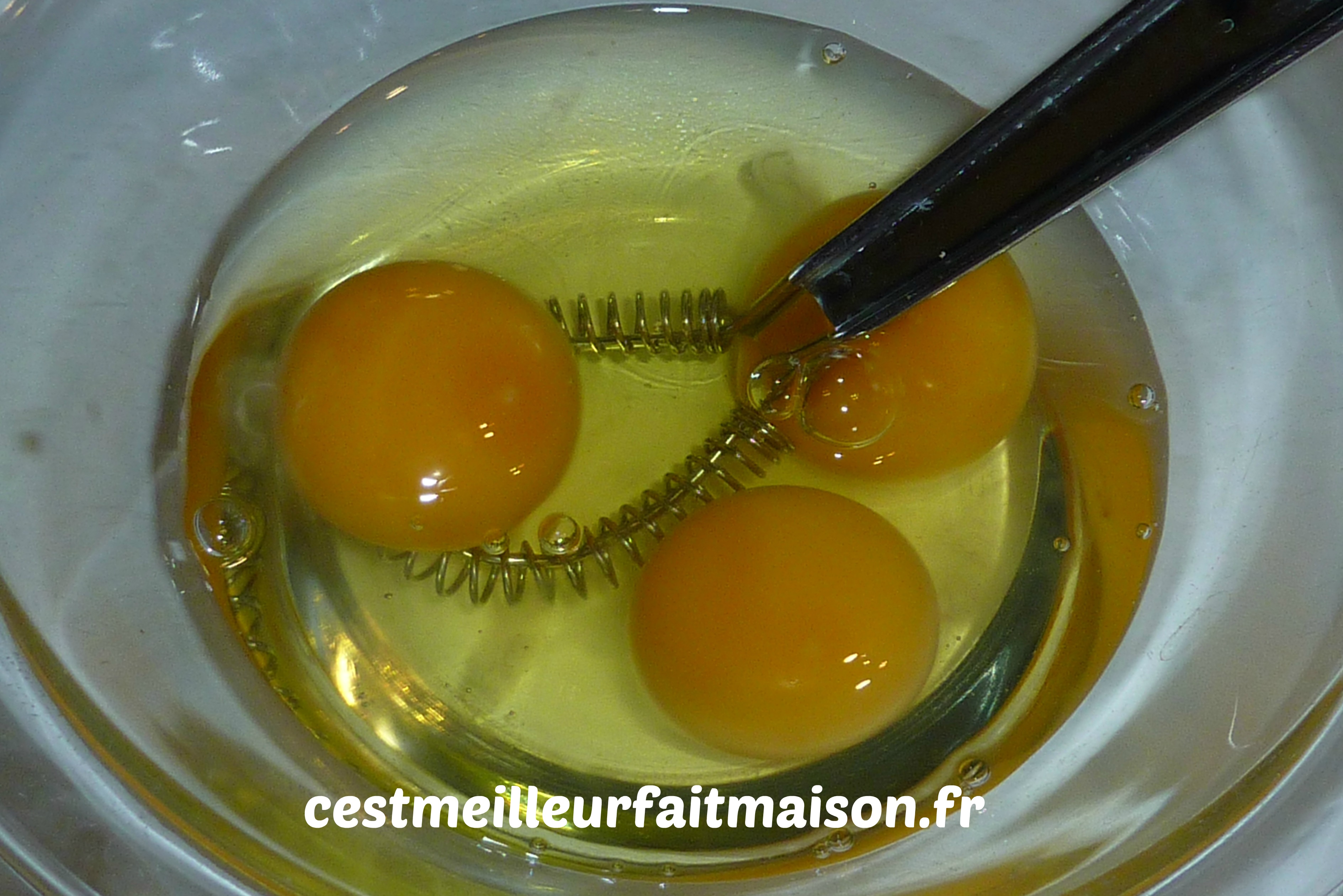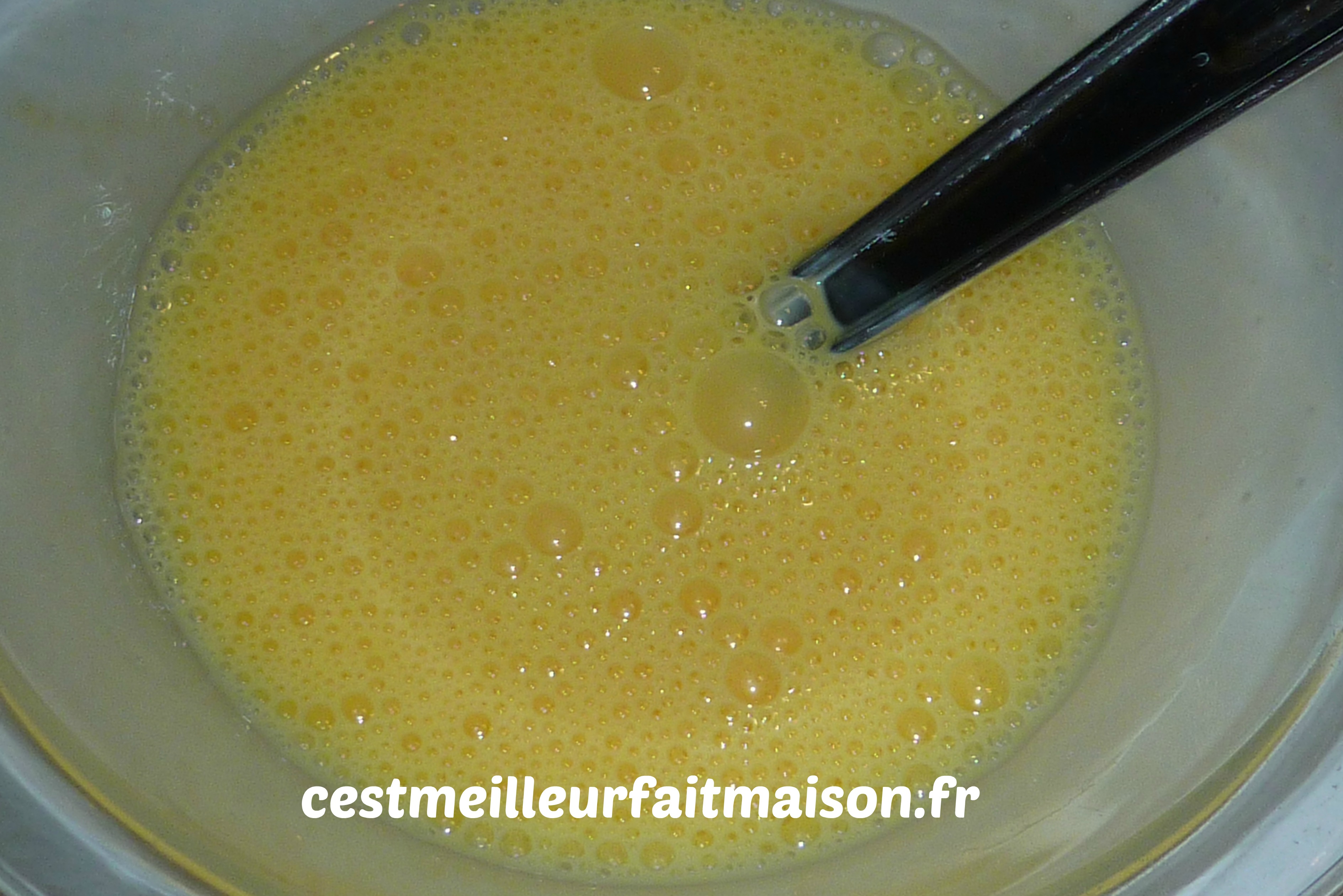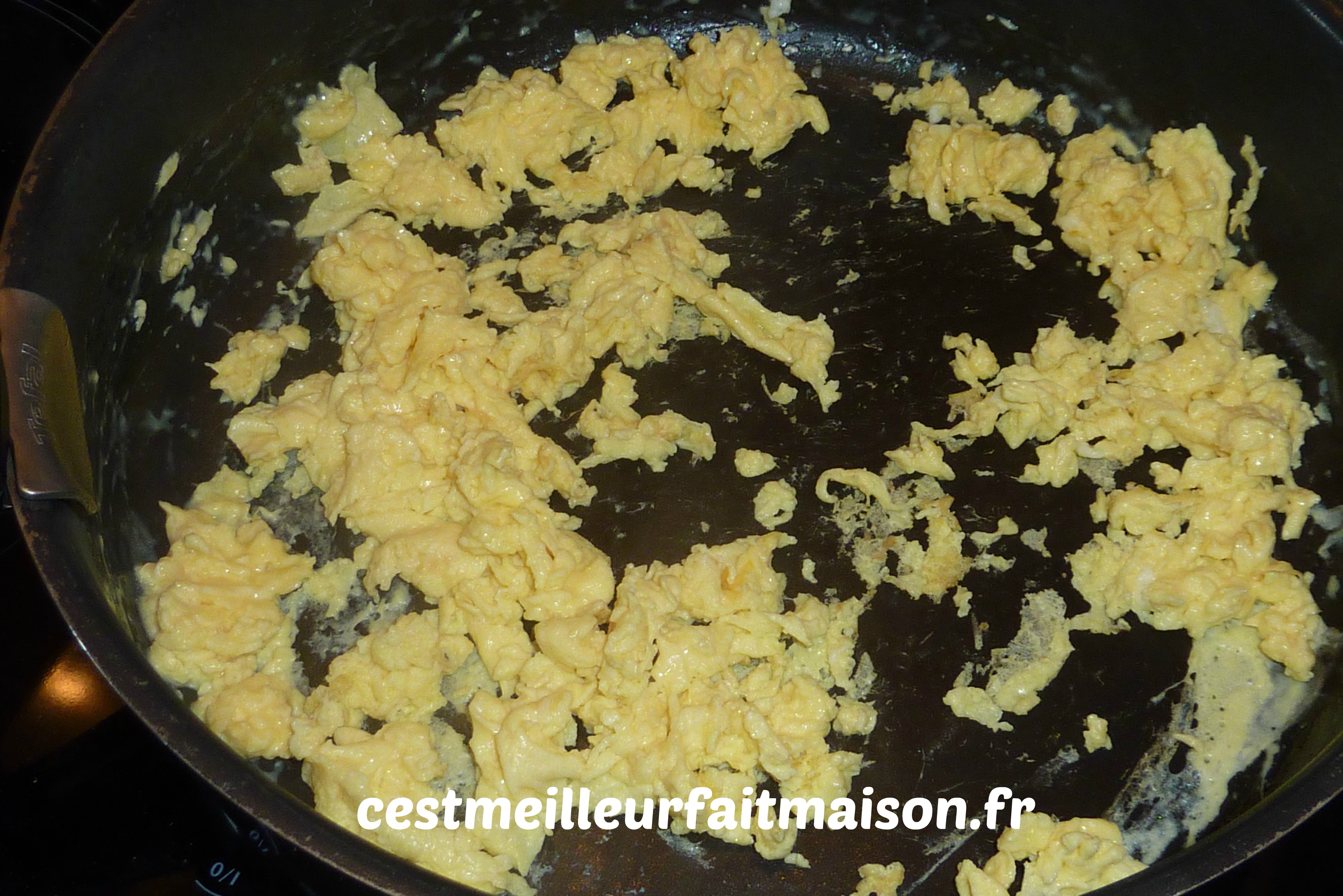 2- Fouetter les œufs dans un saladier et les cuire en brouillade dans une sauteuse avec un peu d’huile.