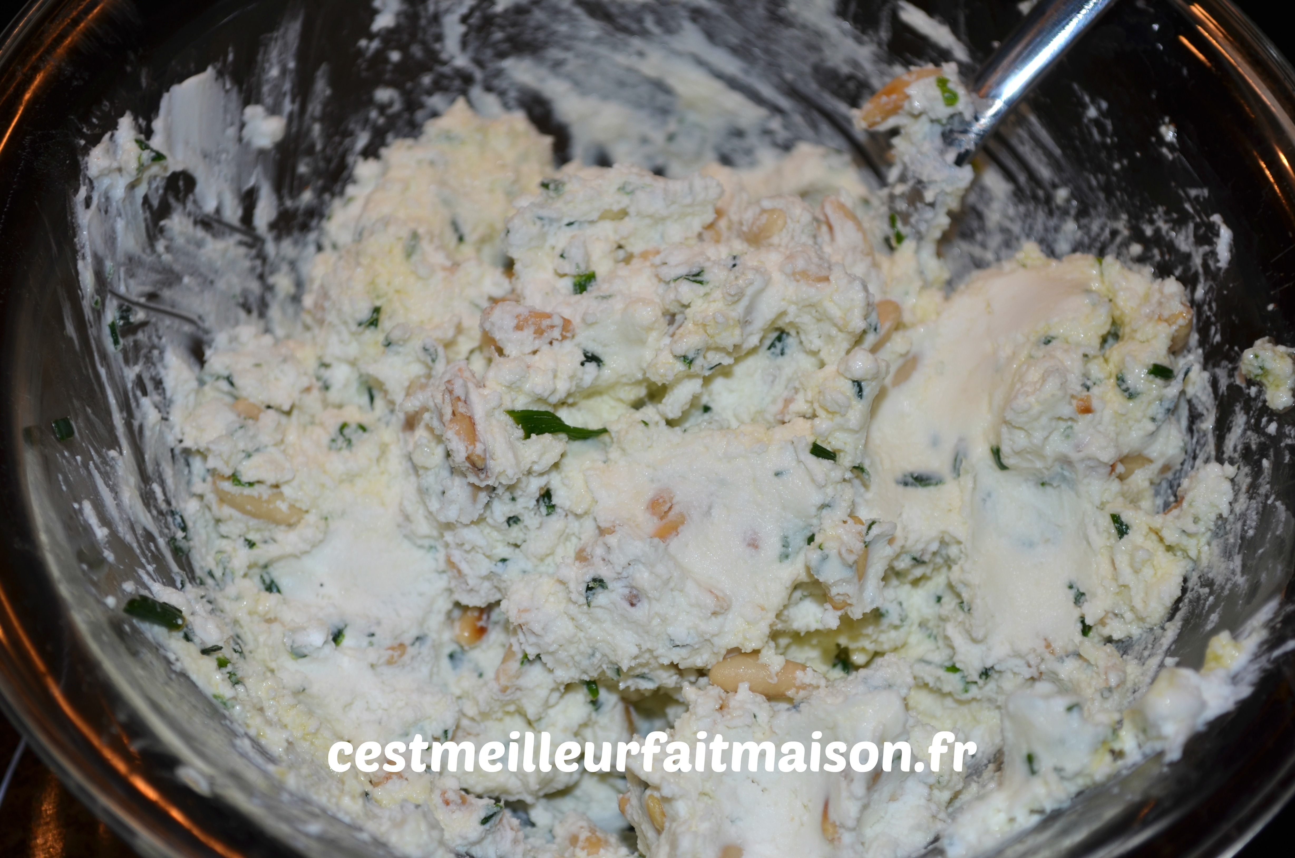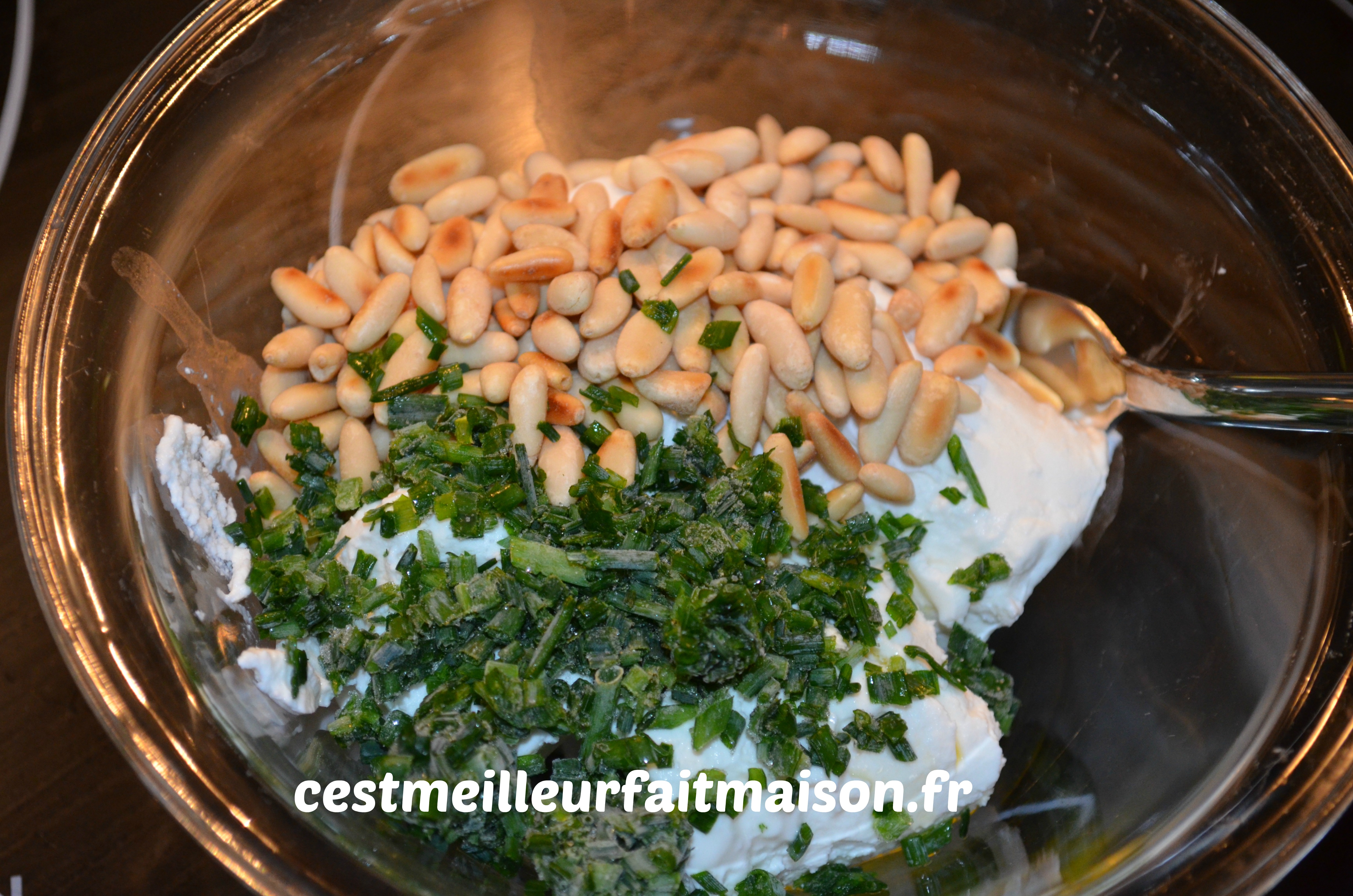 3- Mélanger ensemble le fromage de chèvre, les pignons, la ciboulette, l’huile d’olive, le sel et le poivre.