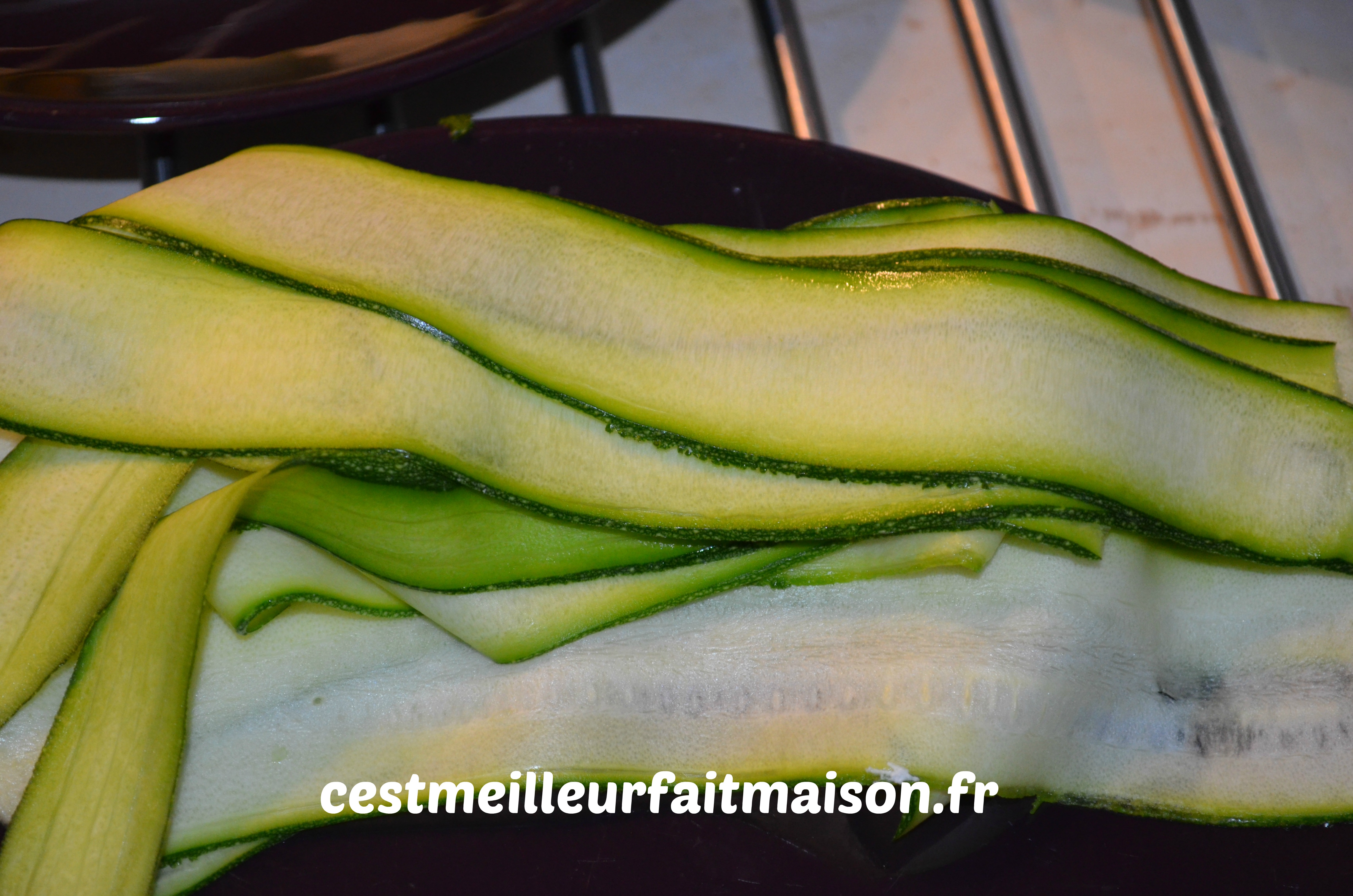 2- Laver la courgette et couper de larges bandes à l’aide d’un économe.