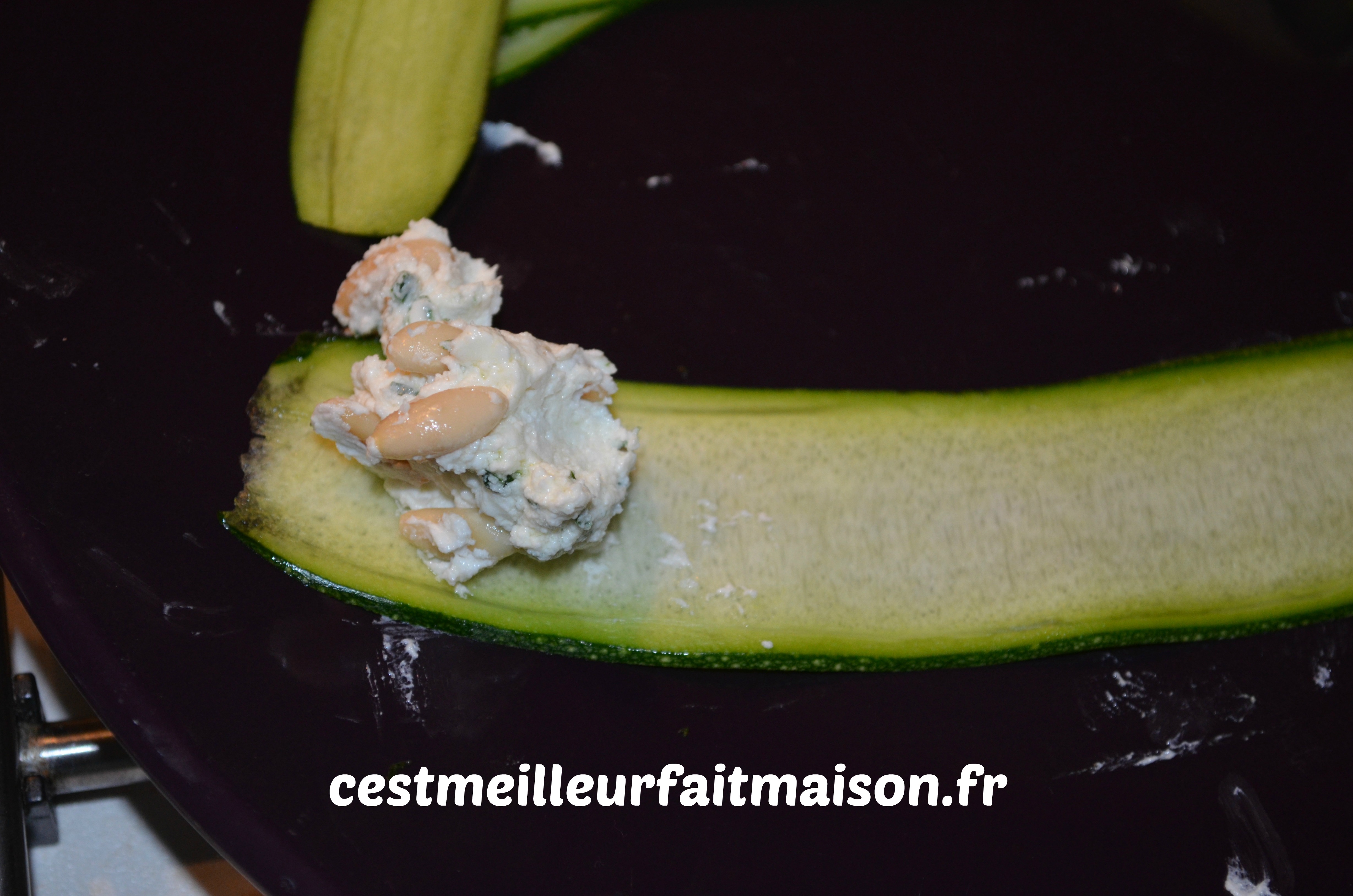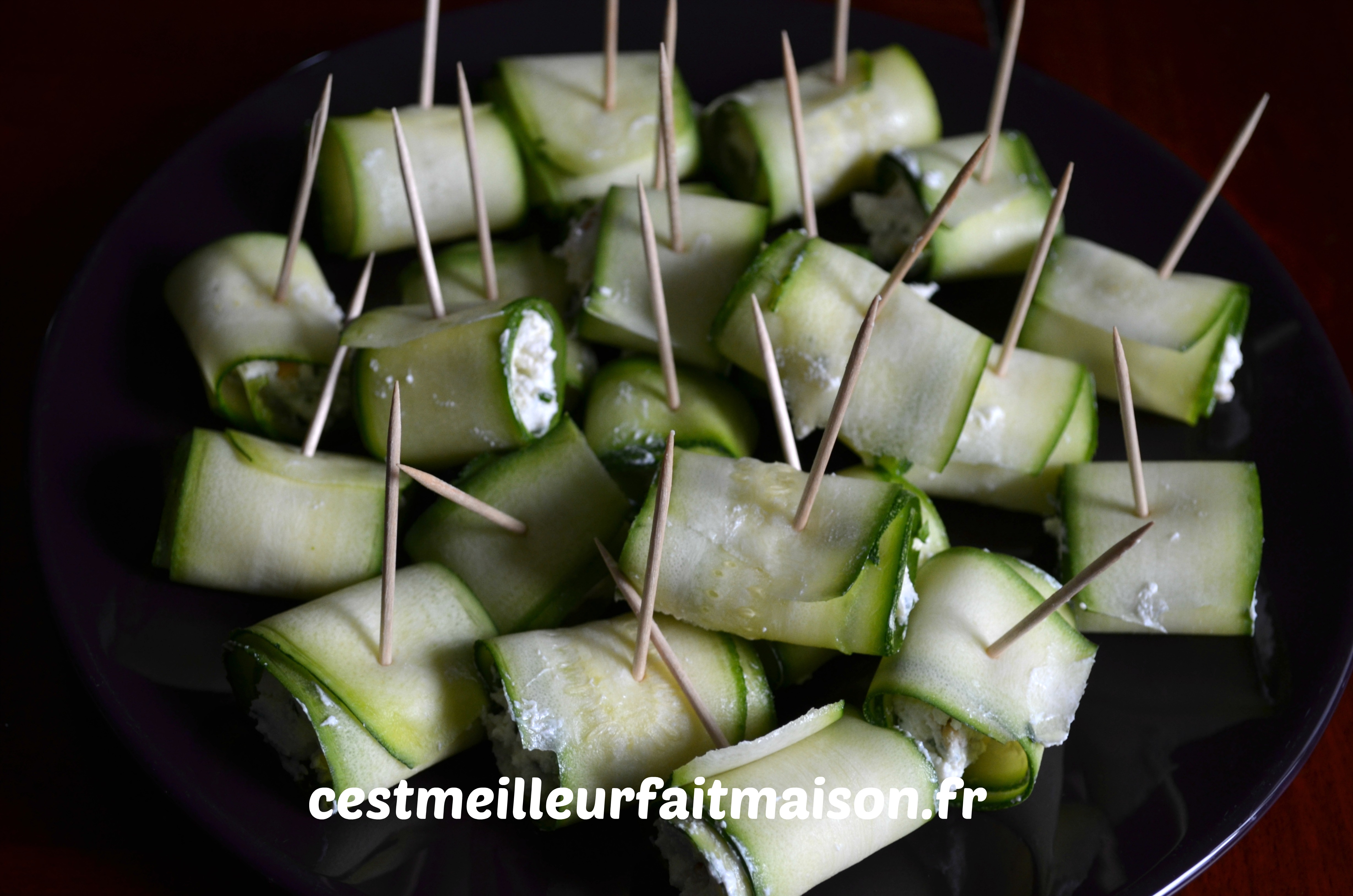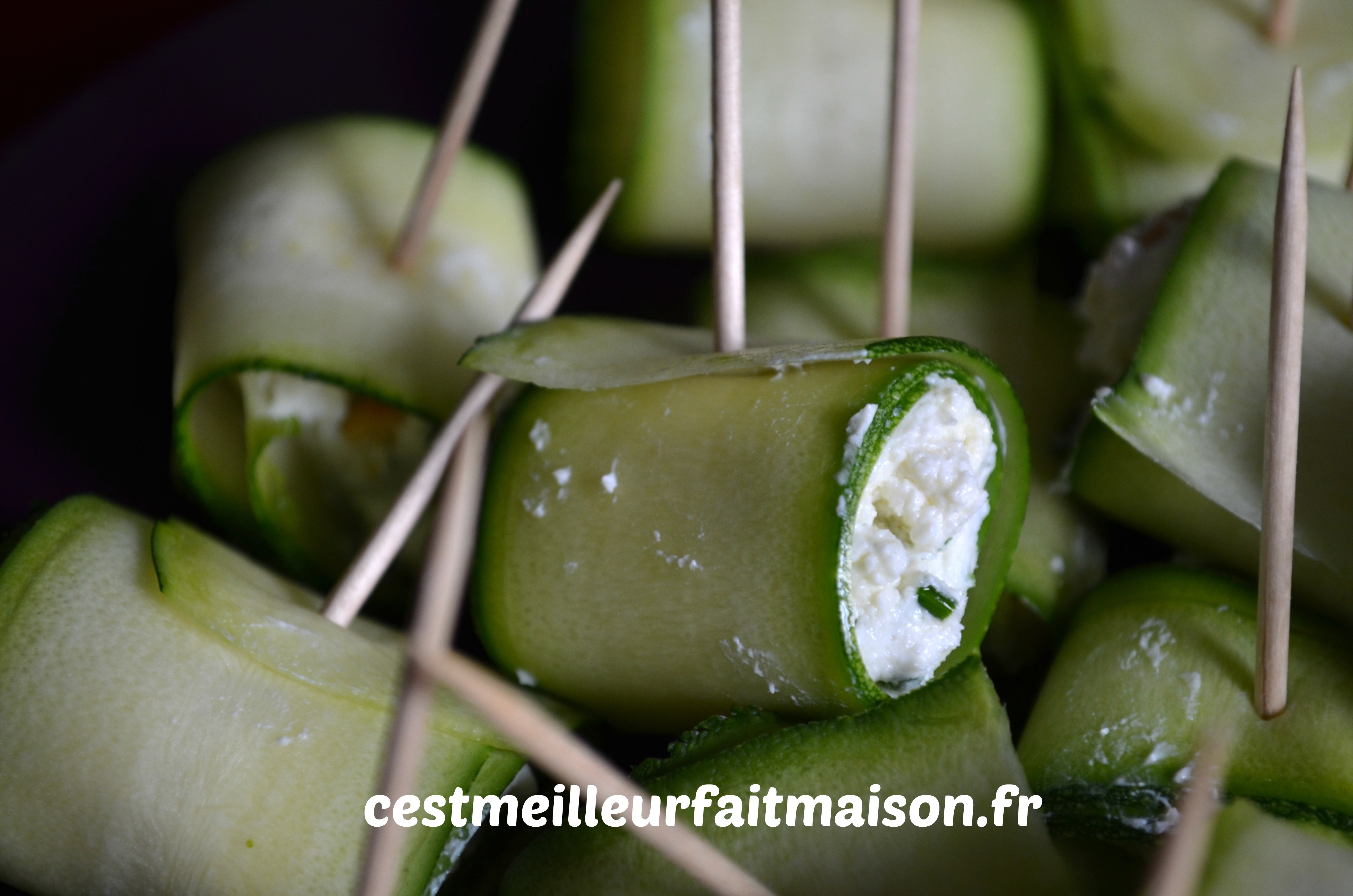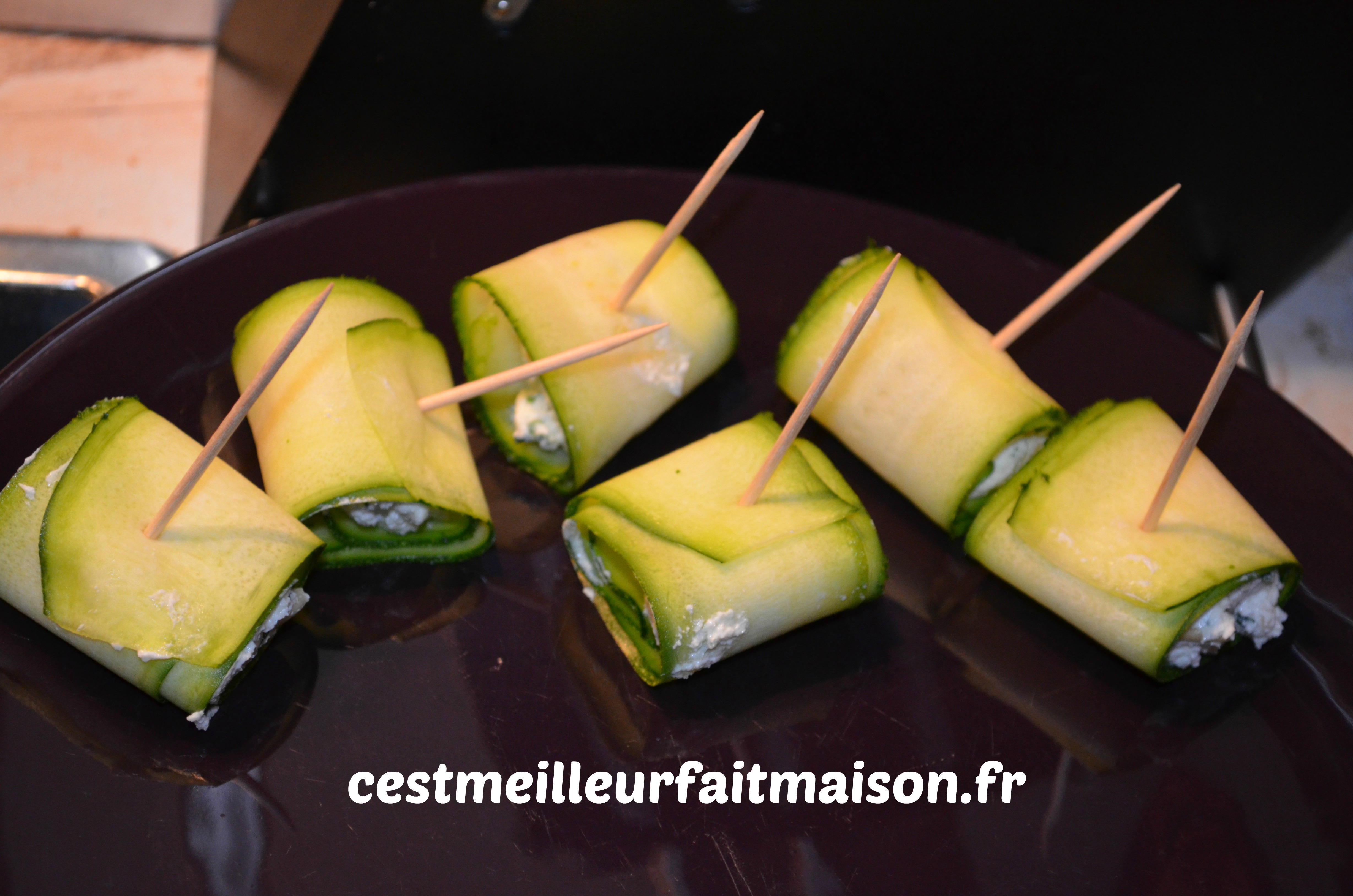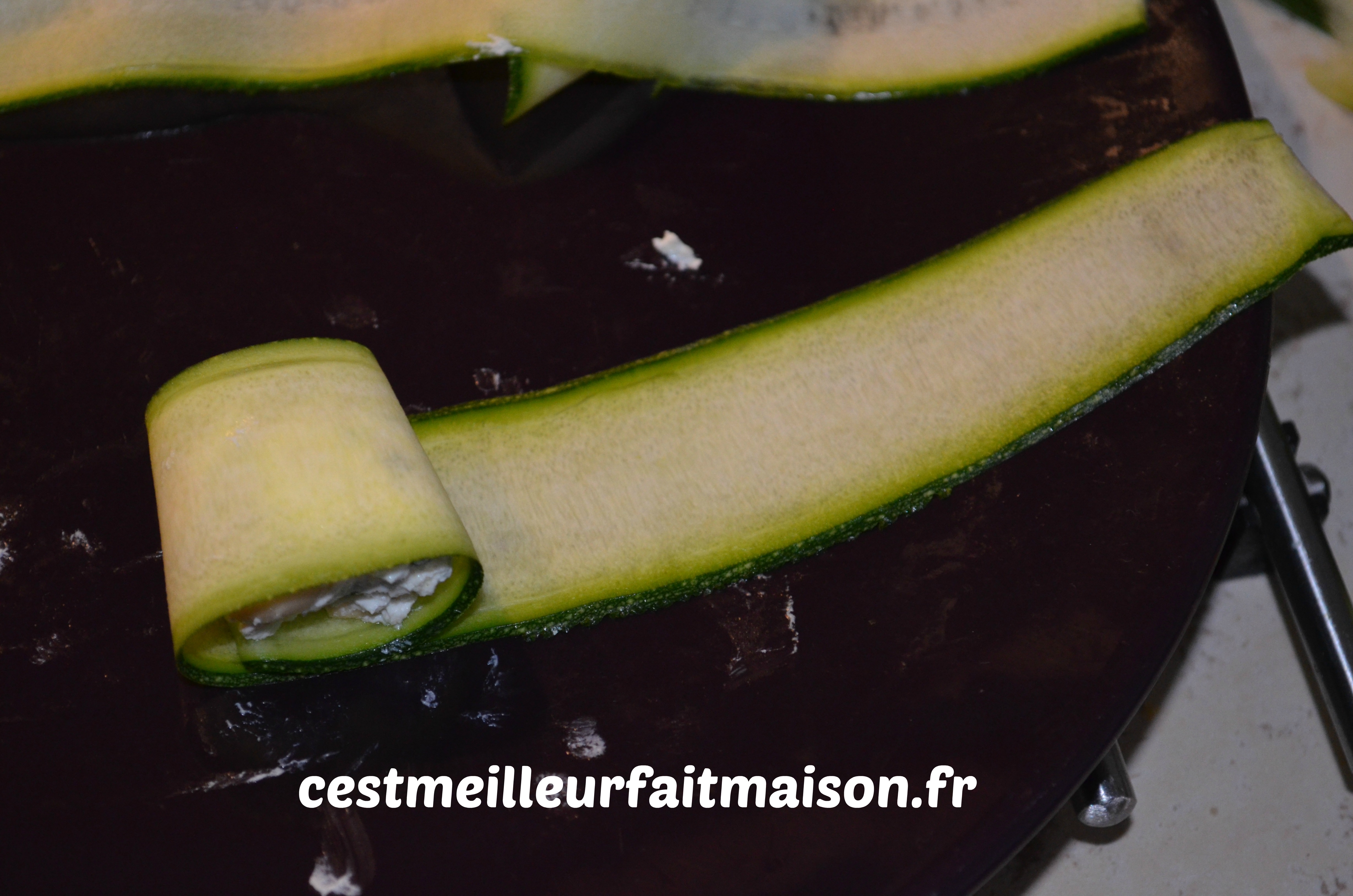 4- Déposer un petit tas de la préparation au chèvre au bout d’une bande de courgette et rouler. Faire tenir avec un pic en bois.