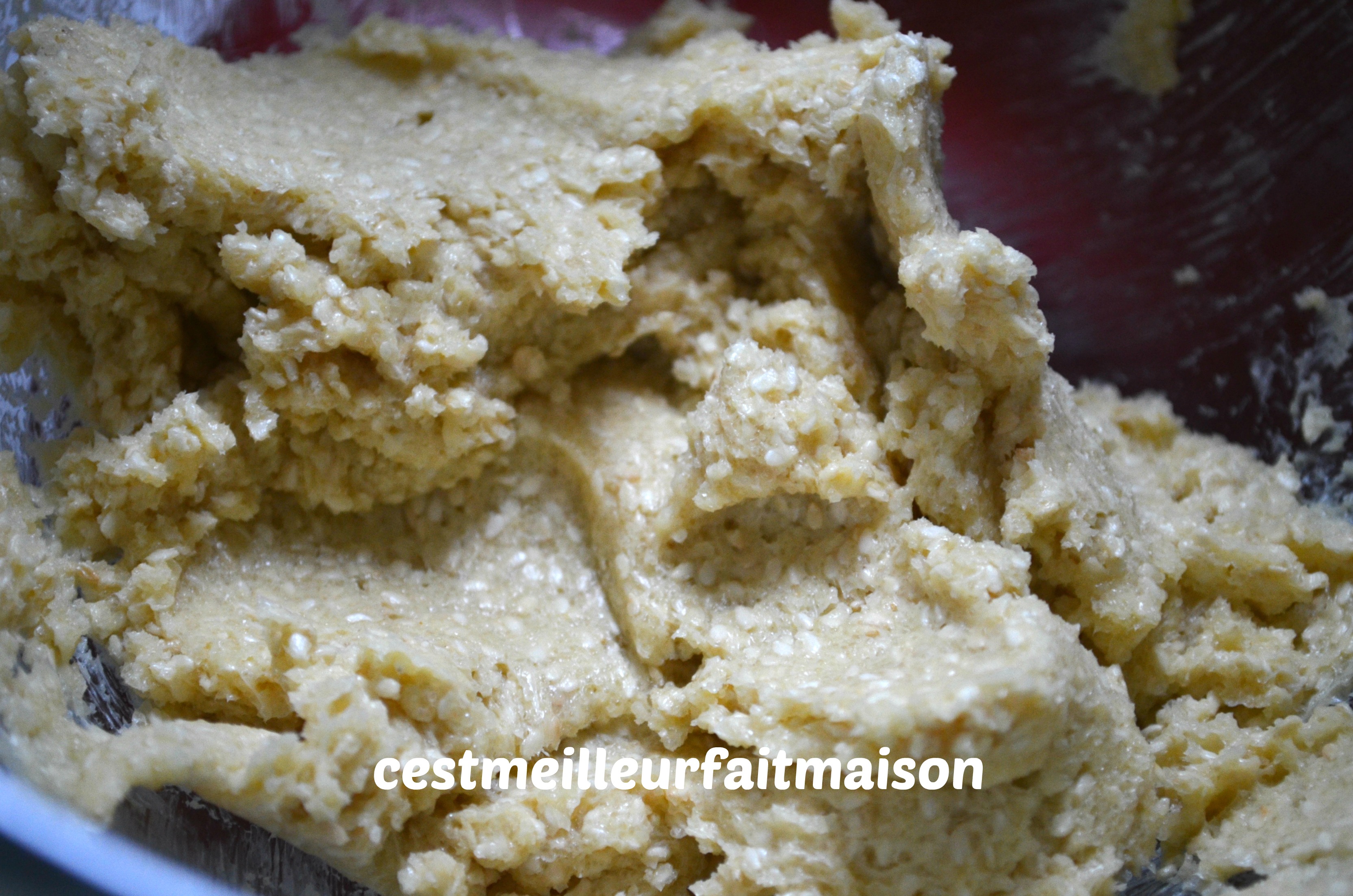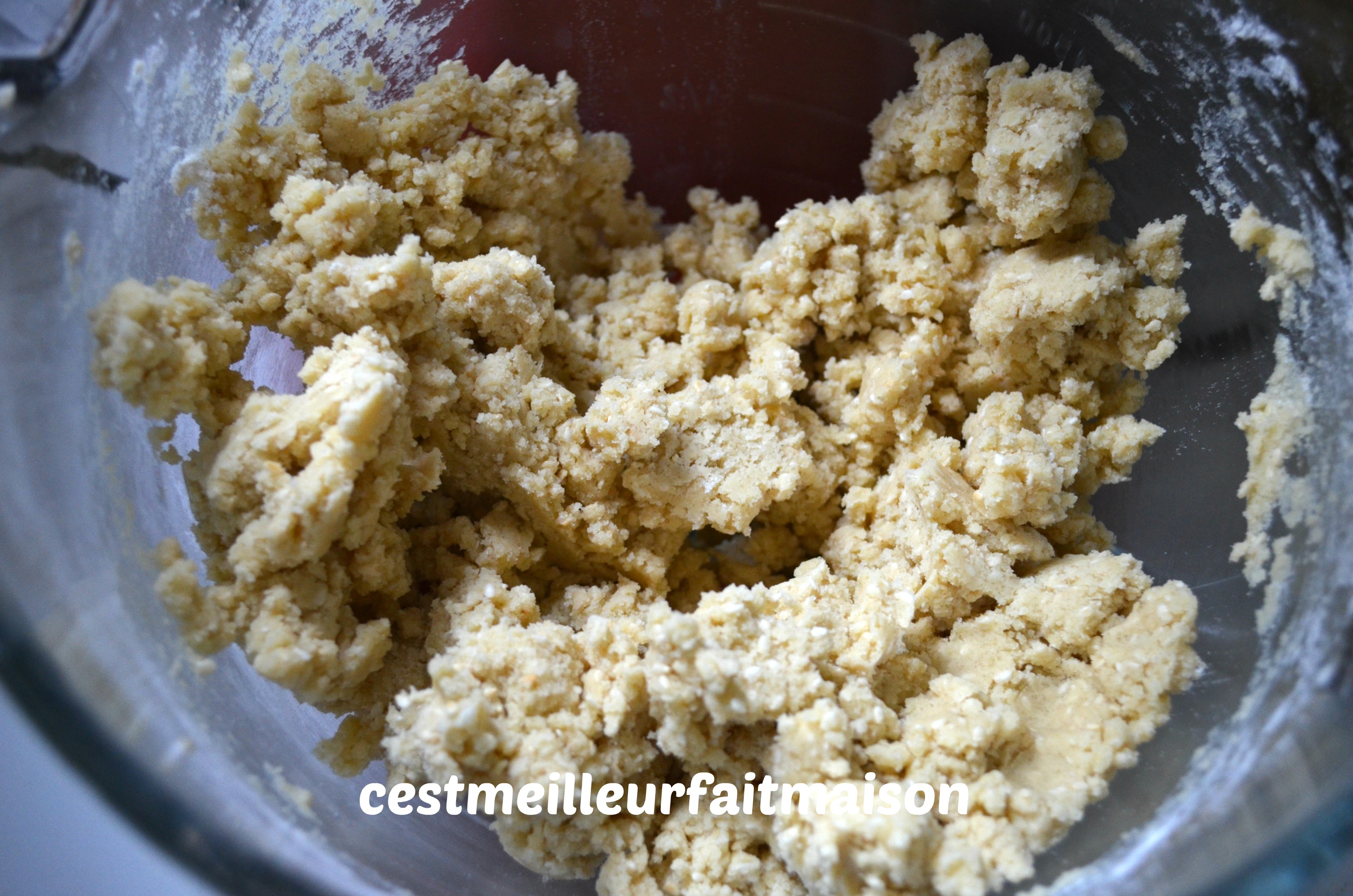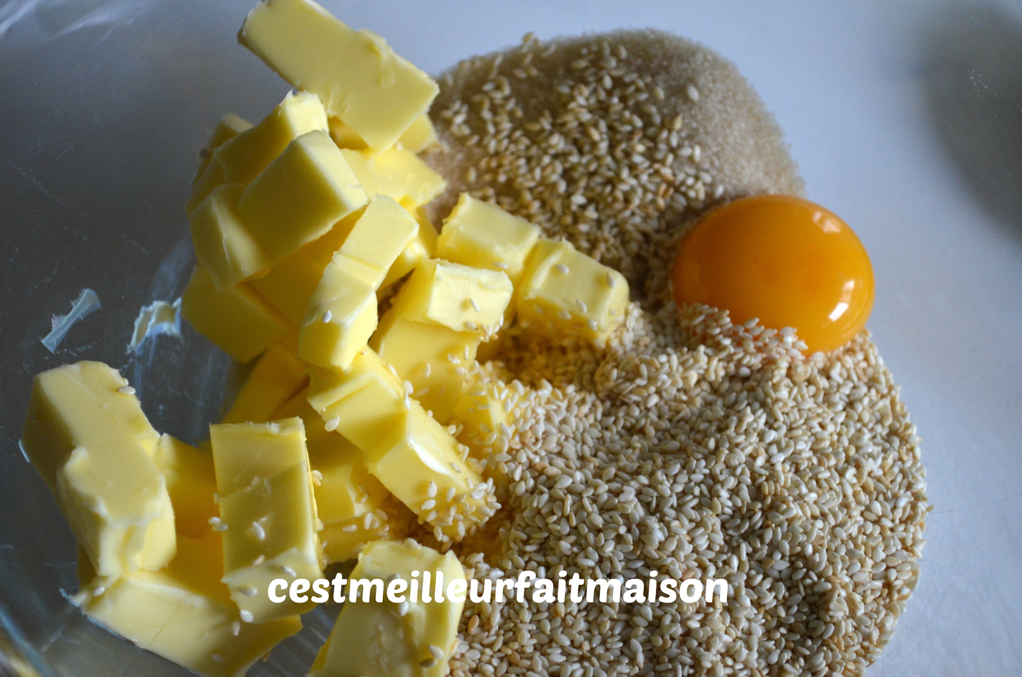 2- Dans le bol du robot, mettre le beurre, le sucre, les graines de sésame et le jaune d’œuf. Mélanger avec la feuille jusqu’à ce que le beurre soit bien mélangé aux restes des ingrédients.