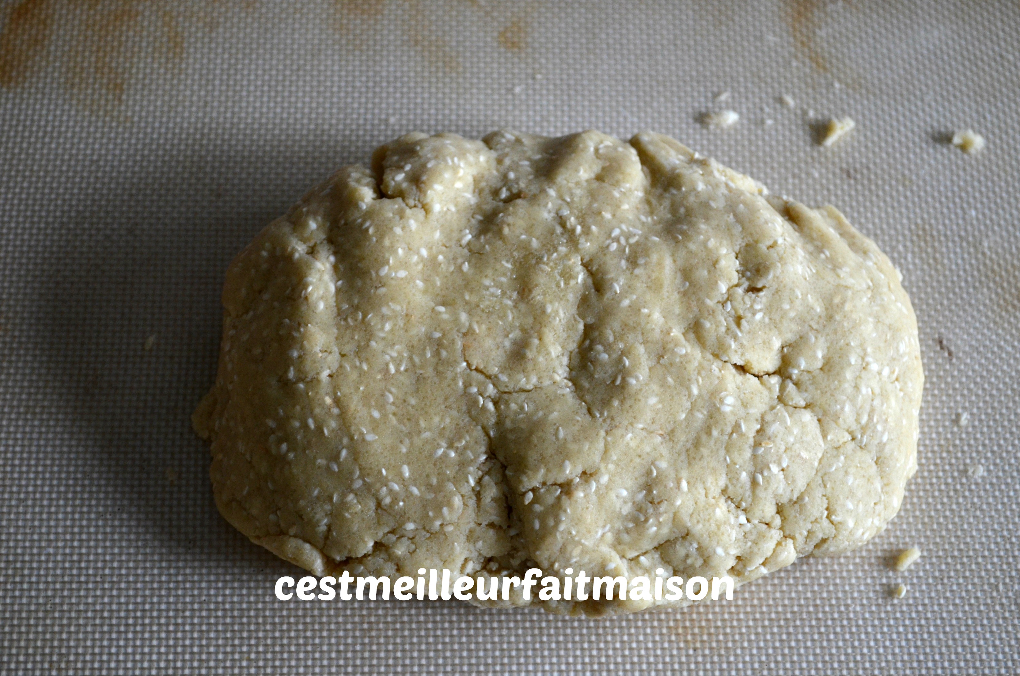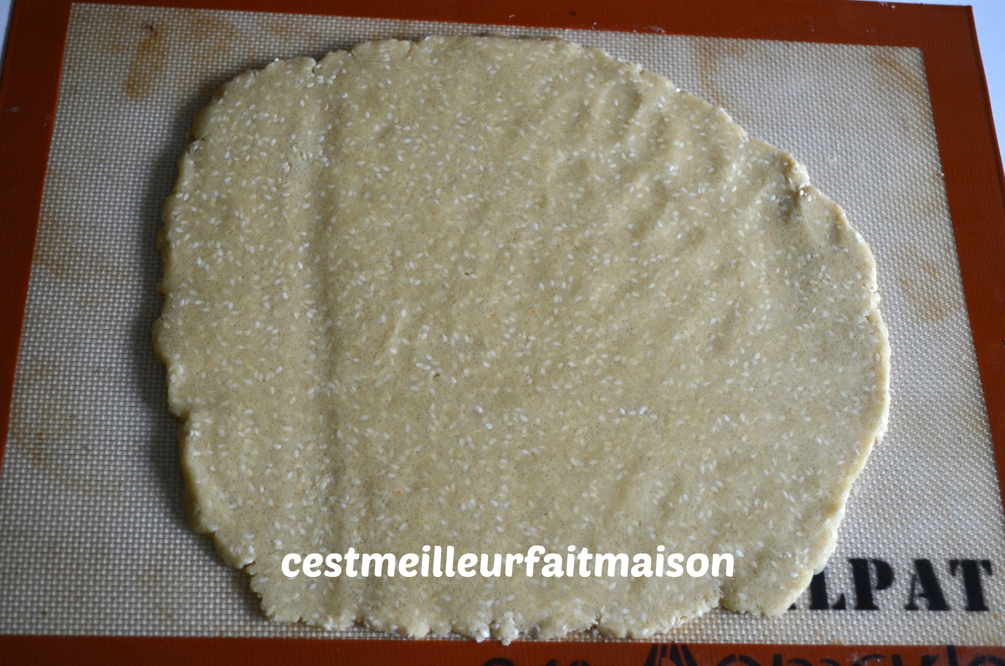 4- Avec les mains, ramener la pâte en boule. Couper le pâton en deux et étaler chaque pâton sur une feuille exopat, sur une épaisseur d’un centimètre. Mettre au réfrigérateur pour au moins 30 min.