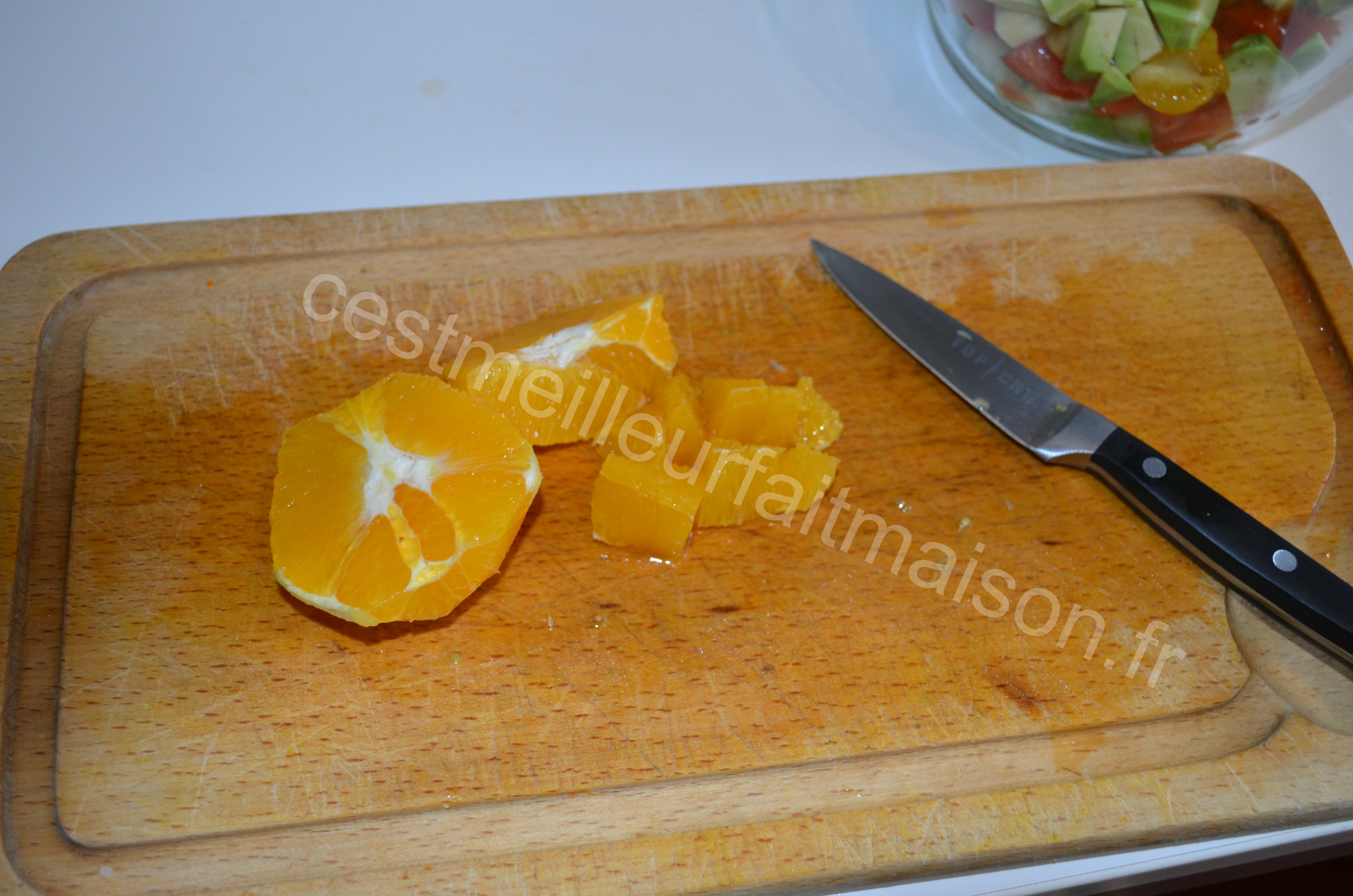 2- Eplucher l’orange à vif, la couper en rondelles puis en petits cubes.
