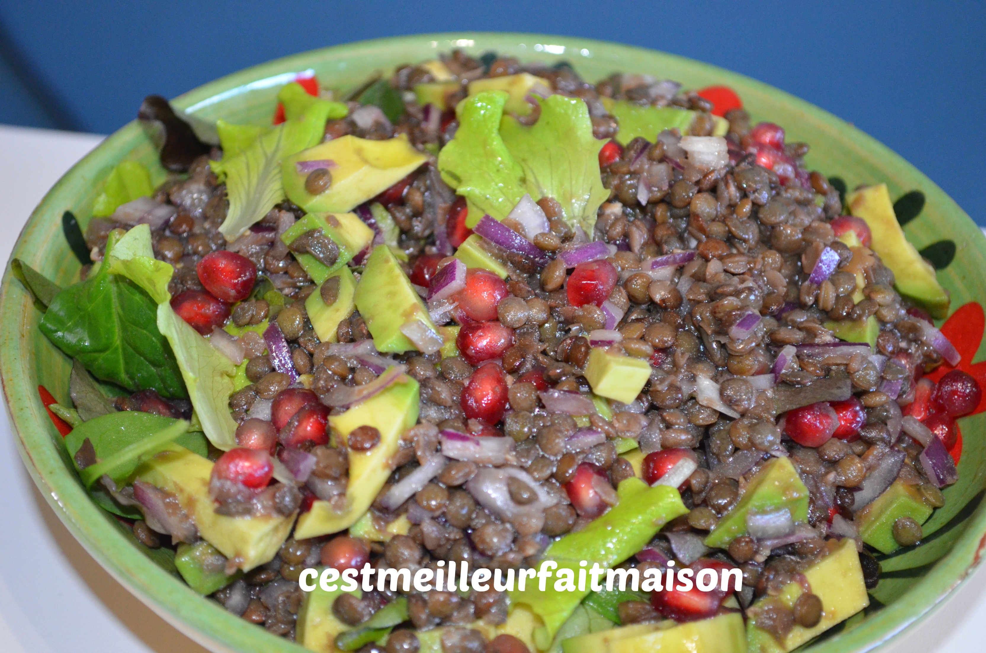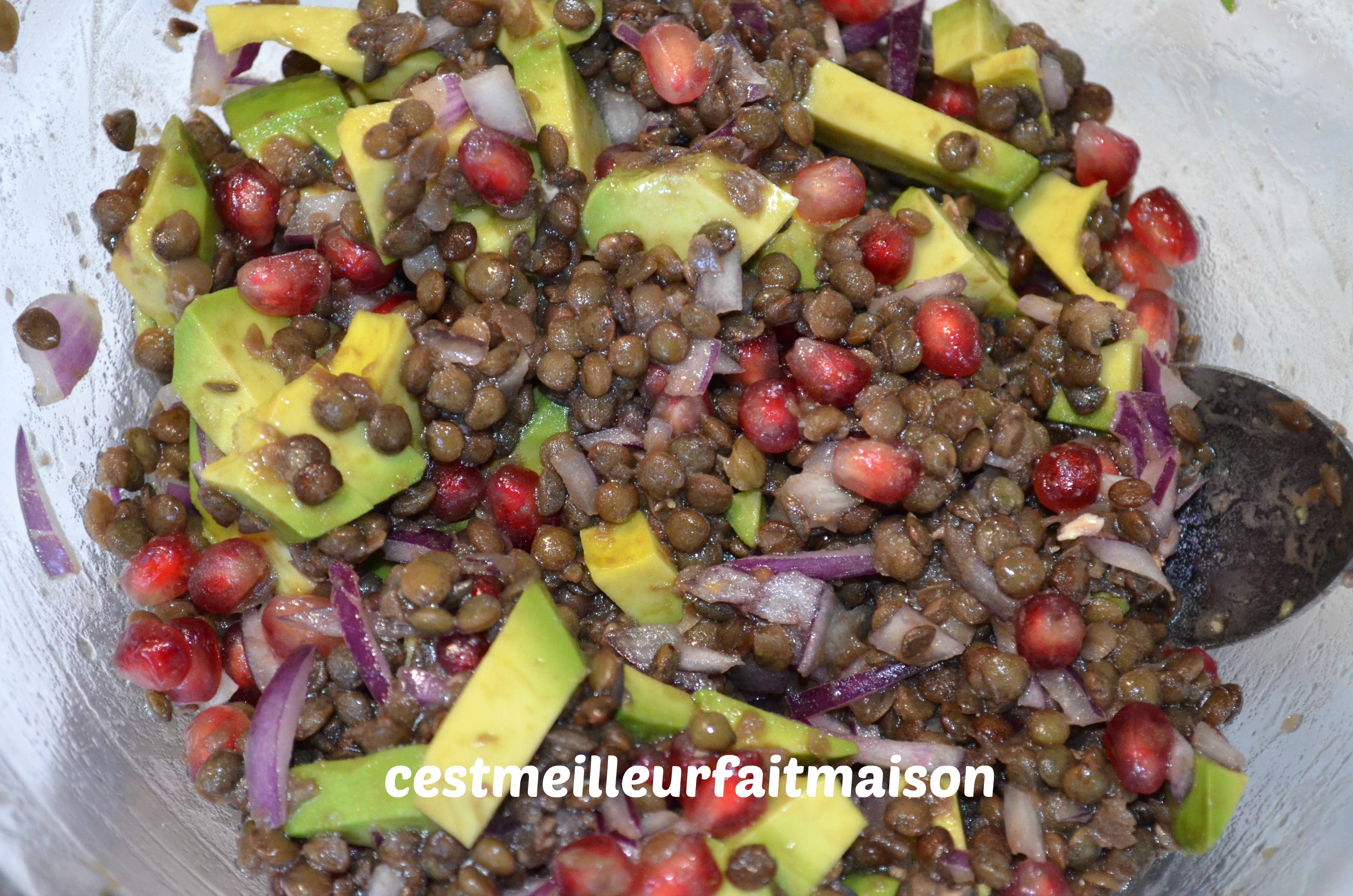 Encore des lentilles !! Oui mais c’est bon 🙂 . Cette fois, elles sont en salade et associées à de l’avocat et de la grenade. La recette provient du blog La cuisine d’Anna et Olivia.