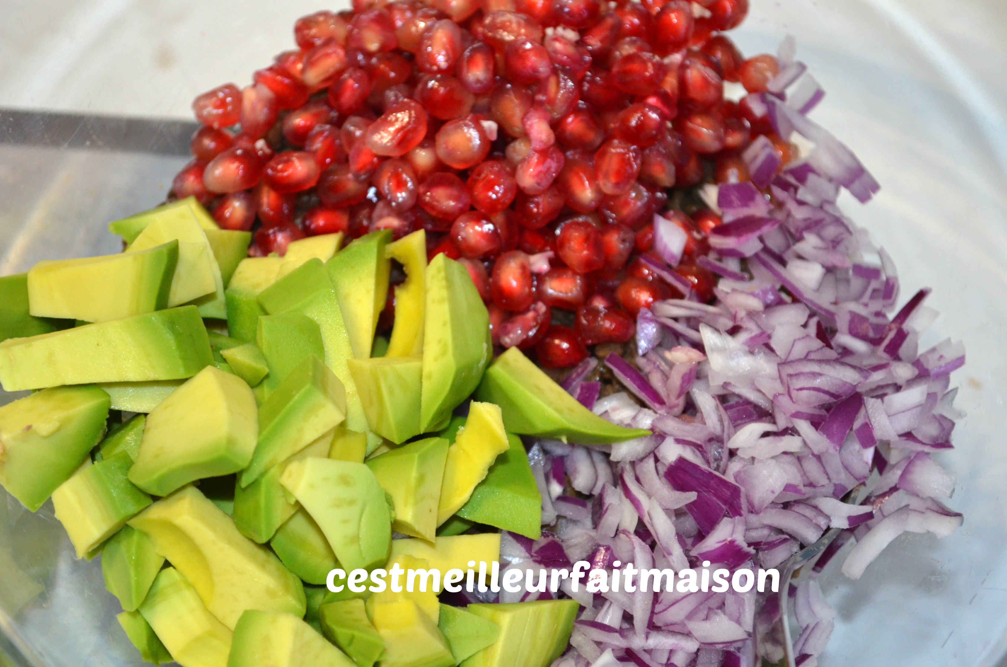 2- Ajouter l’avocat coupé en cube, l’oignon coupé et les graines de grenade.