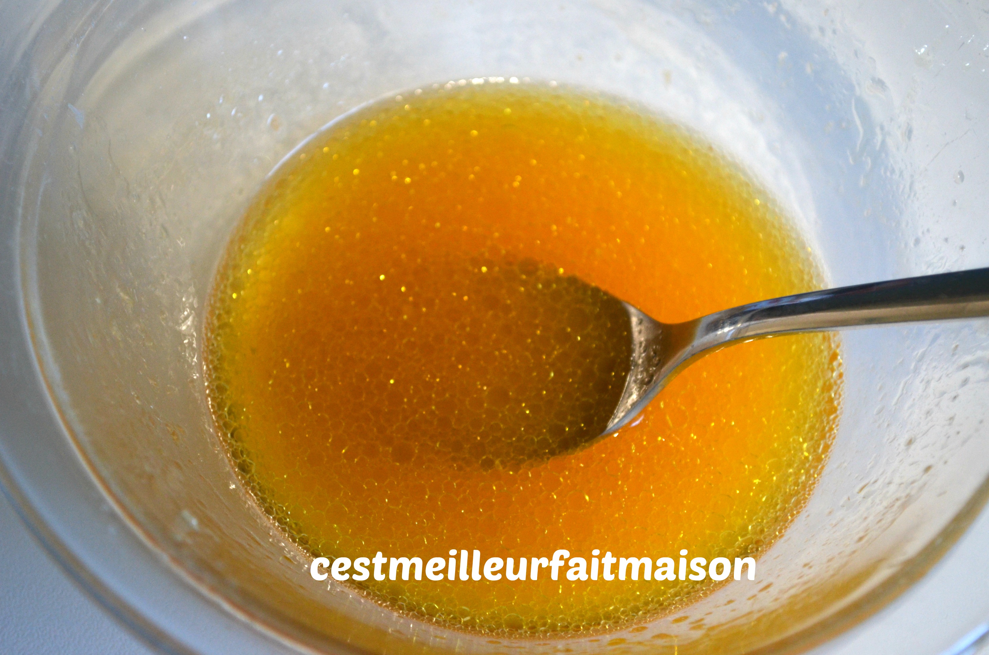 3- Mélanger le vinaigre avec du sel, du poivre et de l’ail en poudre. Ajouter le jus de clémentine. Bien mélanger et ajouter l’huile.
