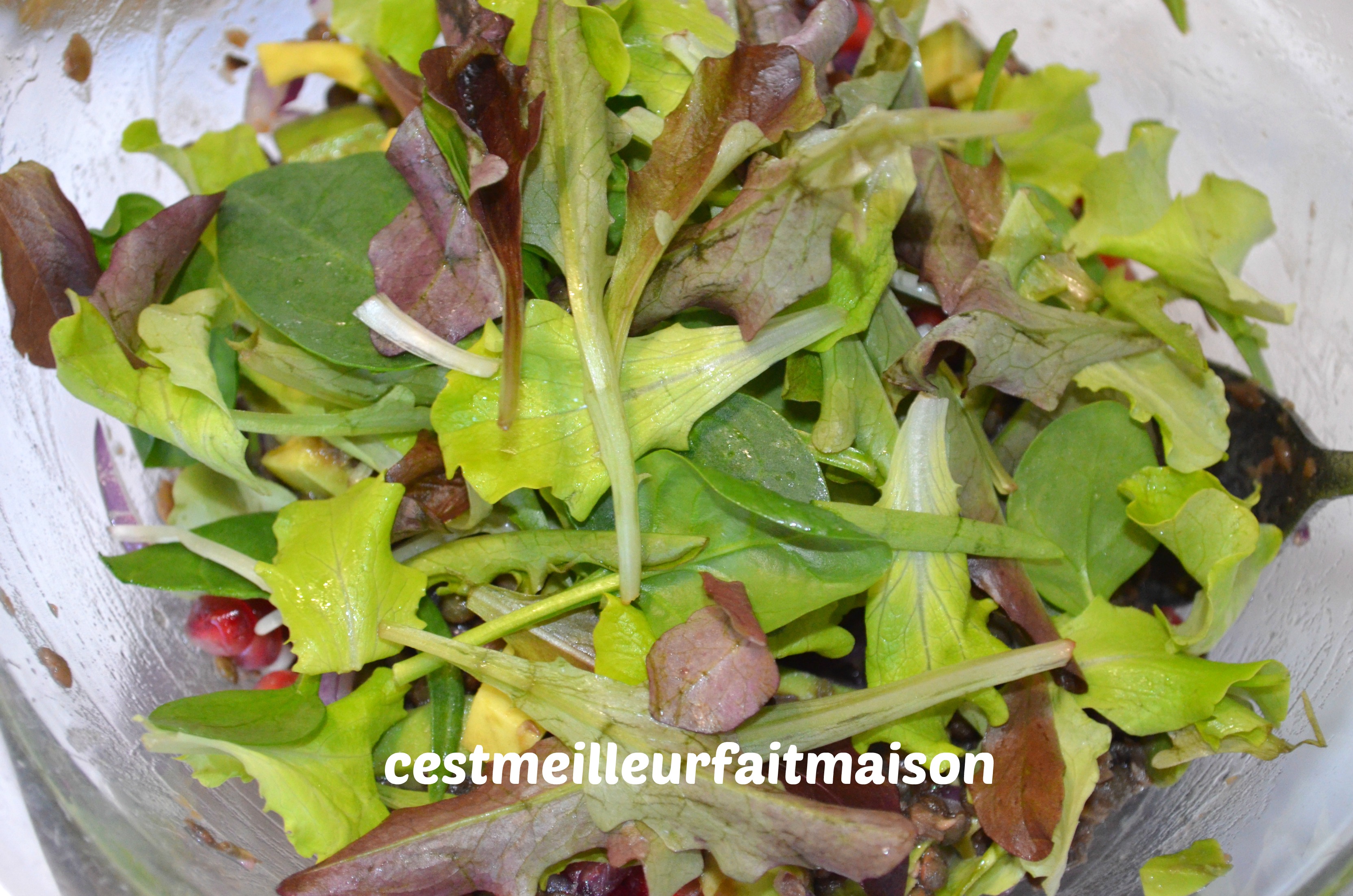 4- Verser dans le saladier et mélanger. Ajouter les pousses de salade et mélanger à nouveau.