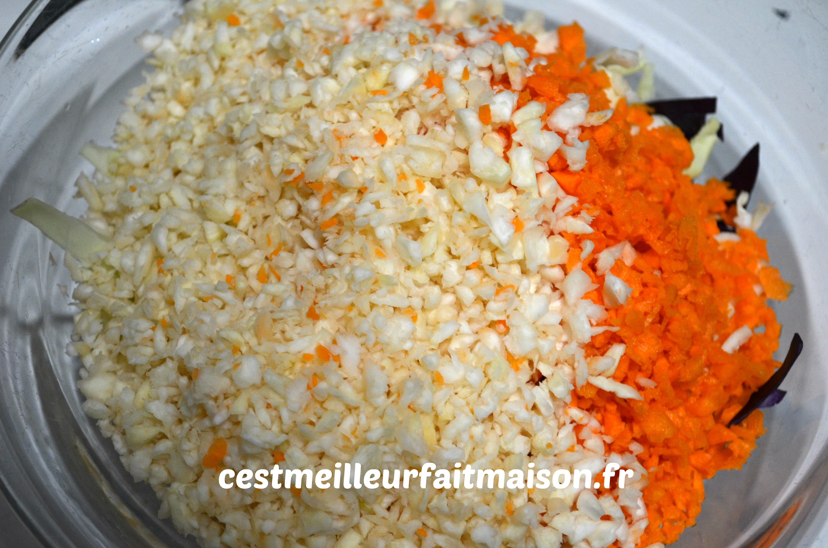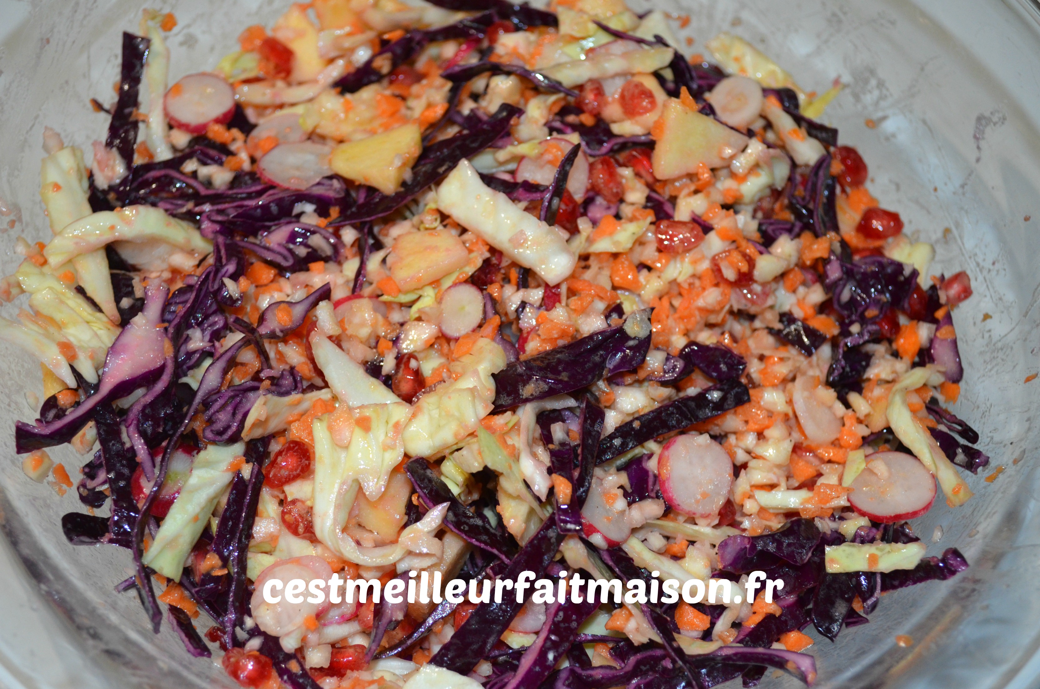 J’ai trouvé cette salade chez Piroulie. J’ai modifié la façon de couper les légumes car je n’ai ni mandoline ni éplucheur à julienne. J’ai donc fait au couteau et au Thermomix.