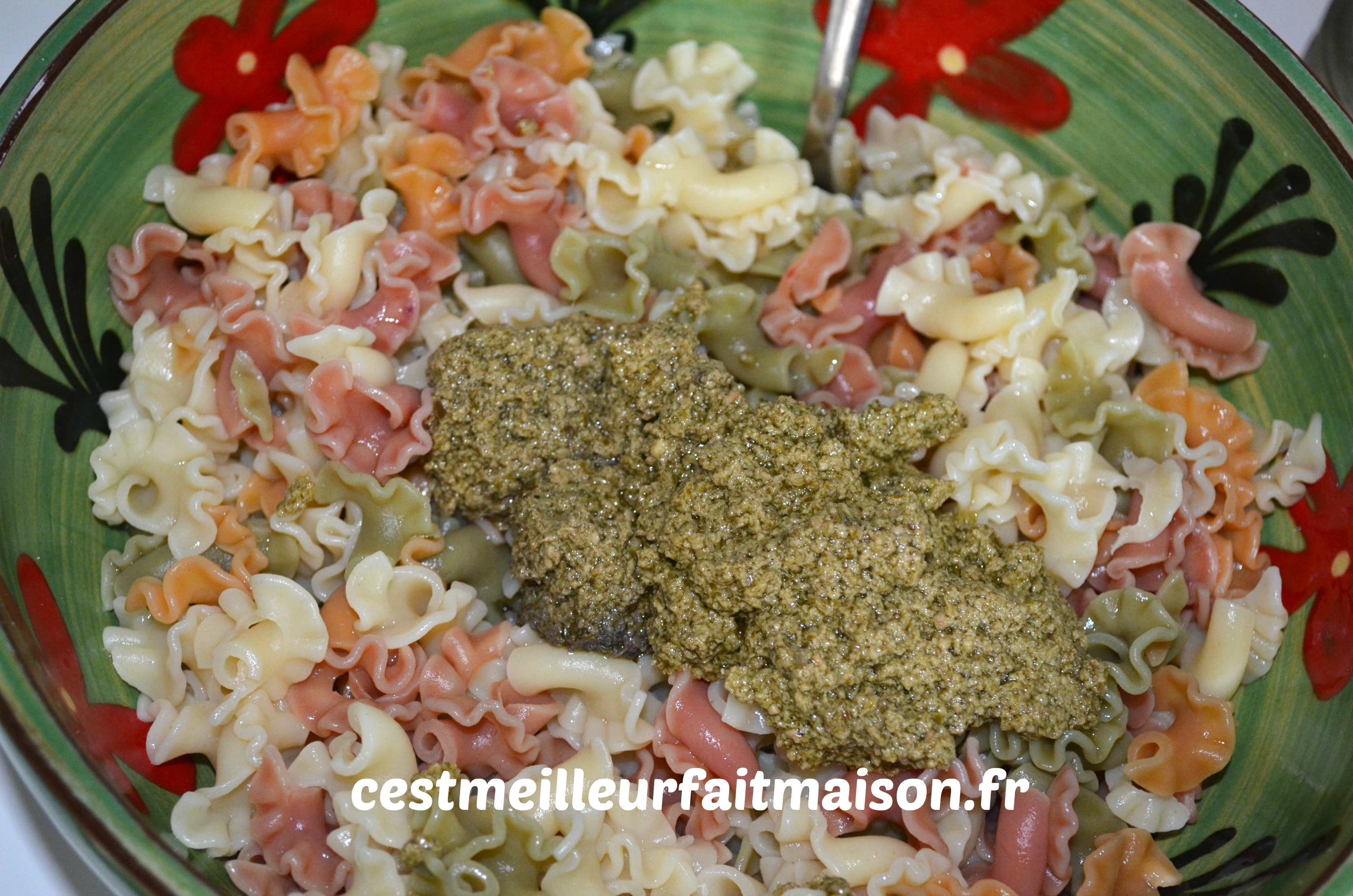 2- Mettre les pâtes dans un saladier avec le pesto et mélanger.