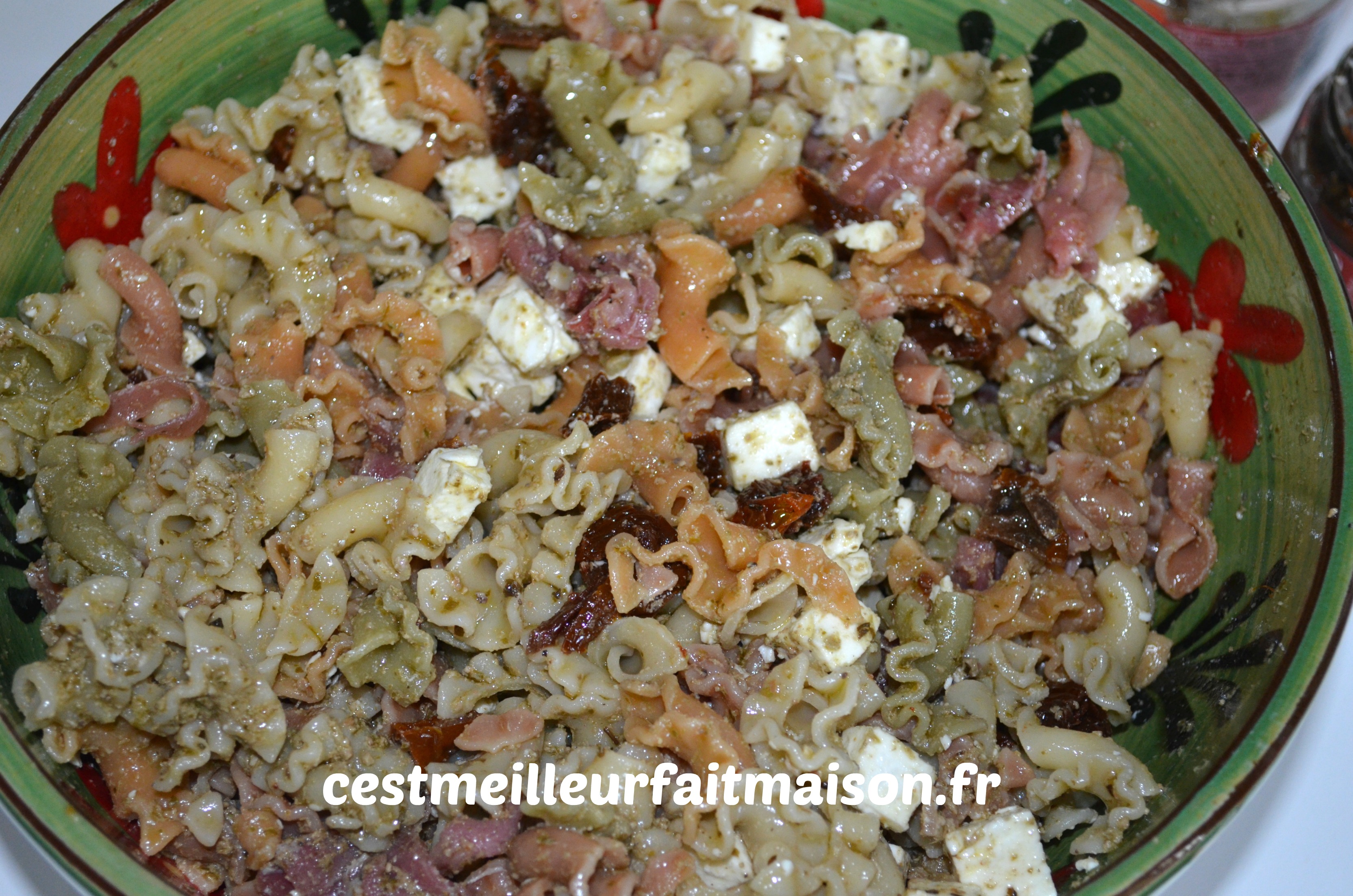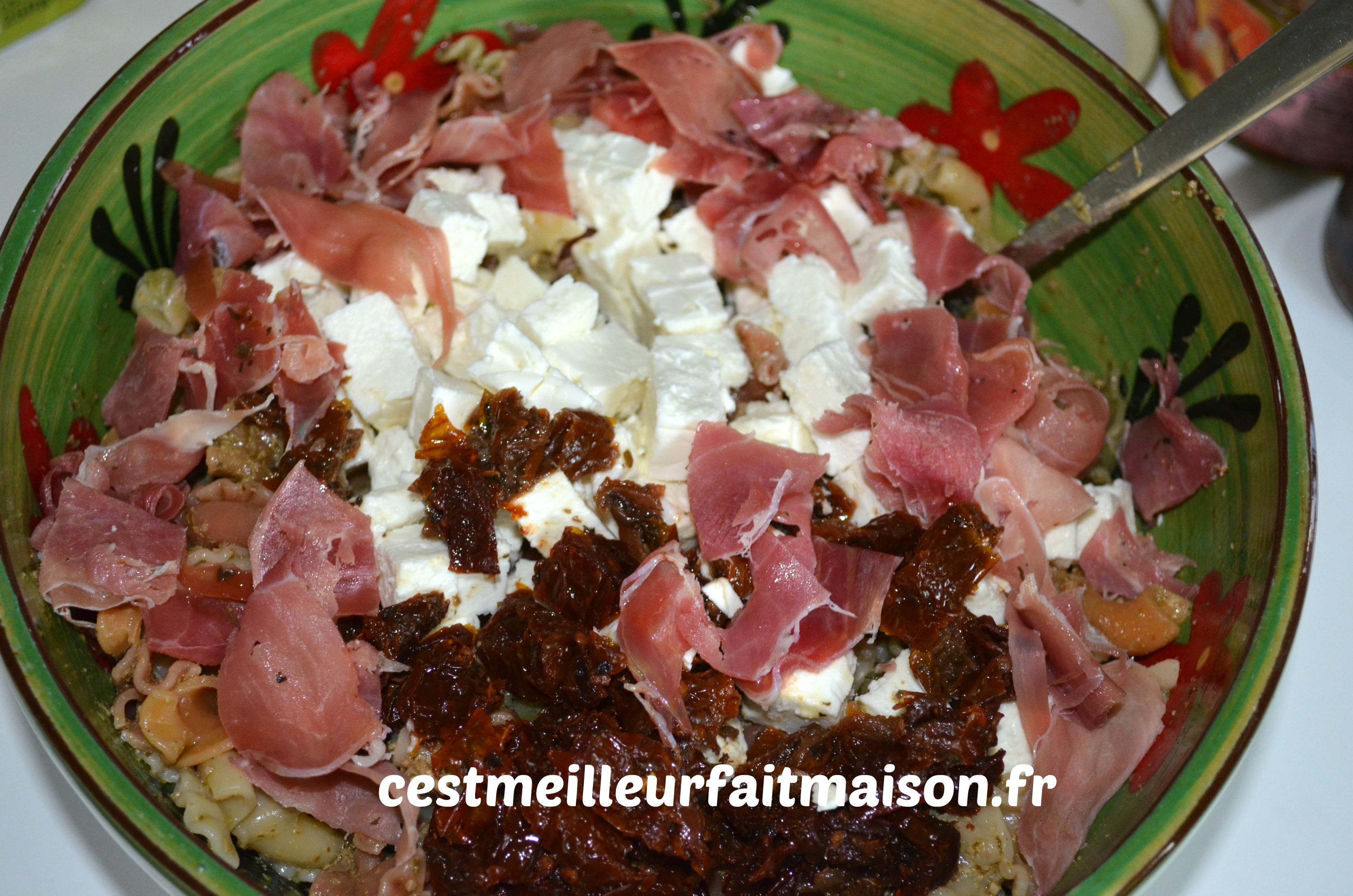 3- Ajouter la féta, les tomates séchées et le jambon, le tout coupés en petits morceaux. Verser l’huile d’olive et bien mélanger.