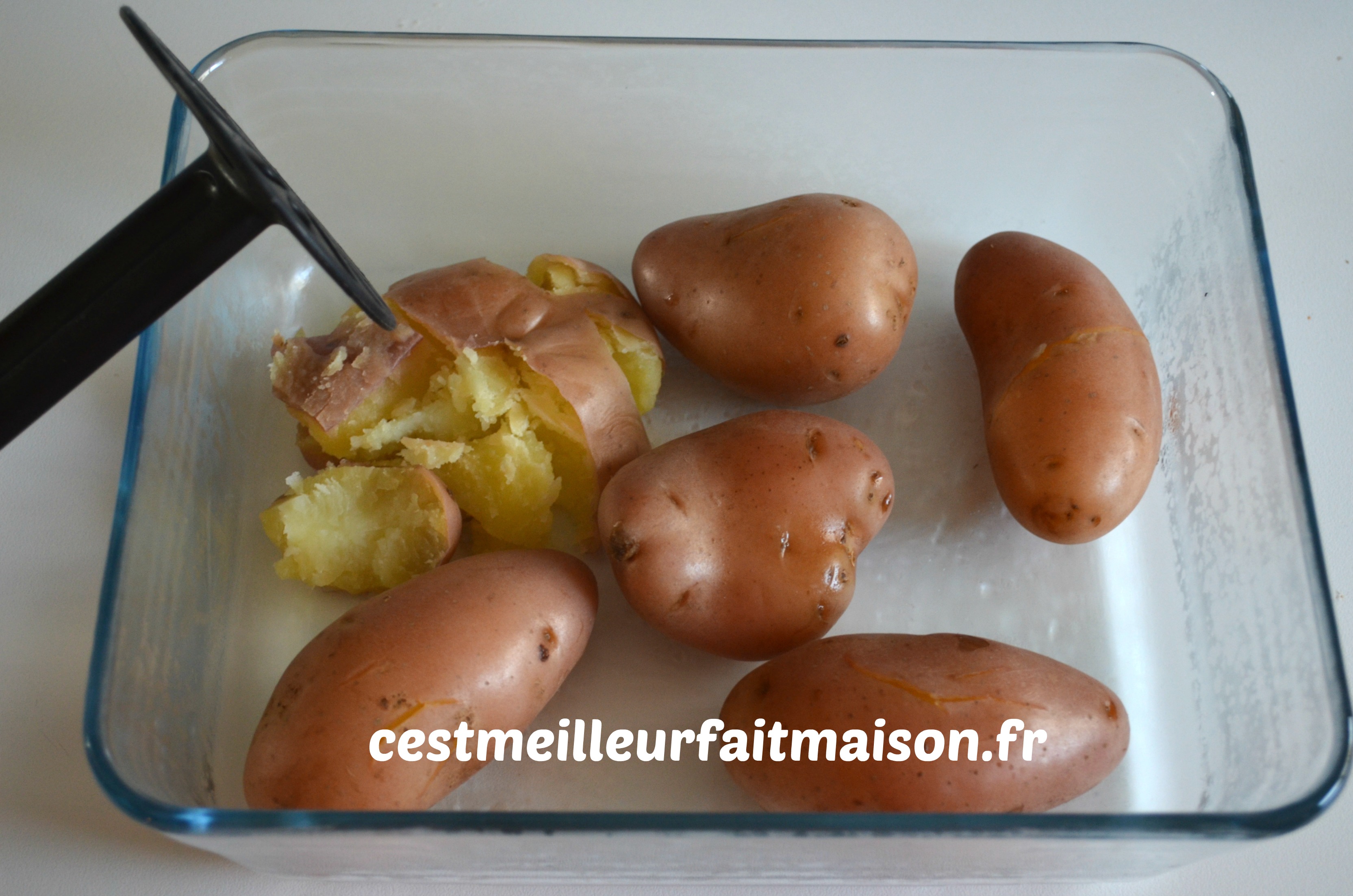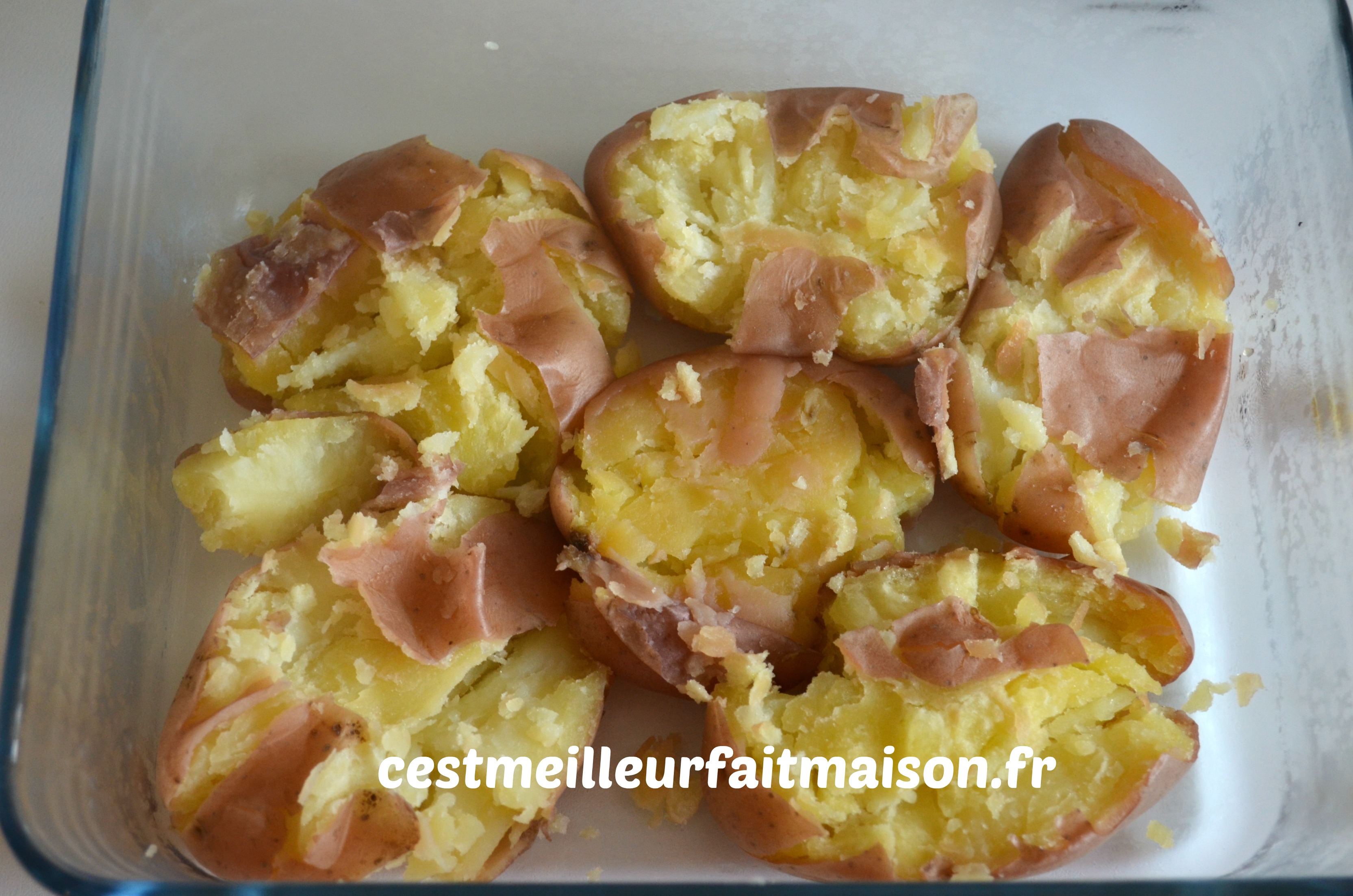 Huiler un plat à four et y déposer les pommes de terre. Les écraser avec un presse purée ou une fourchette.