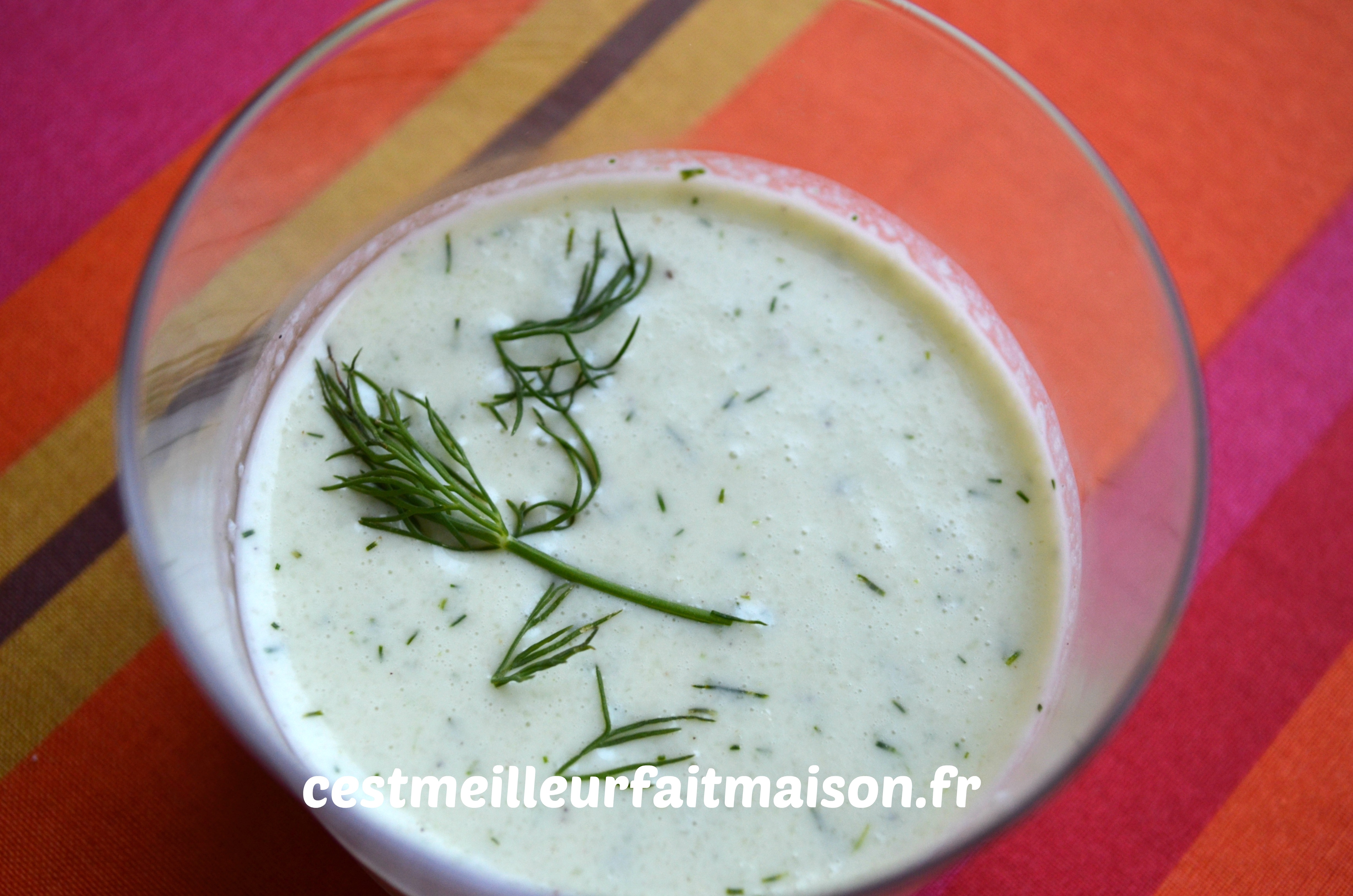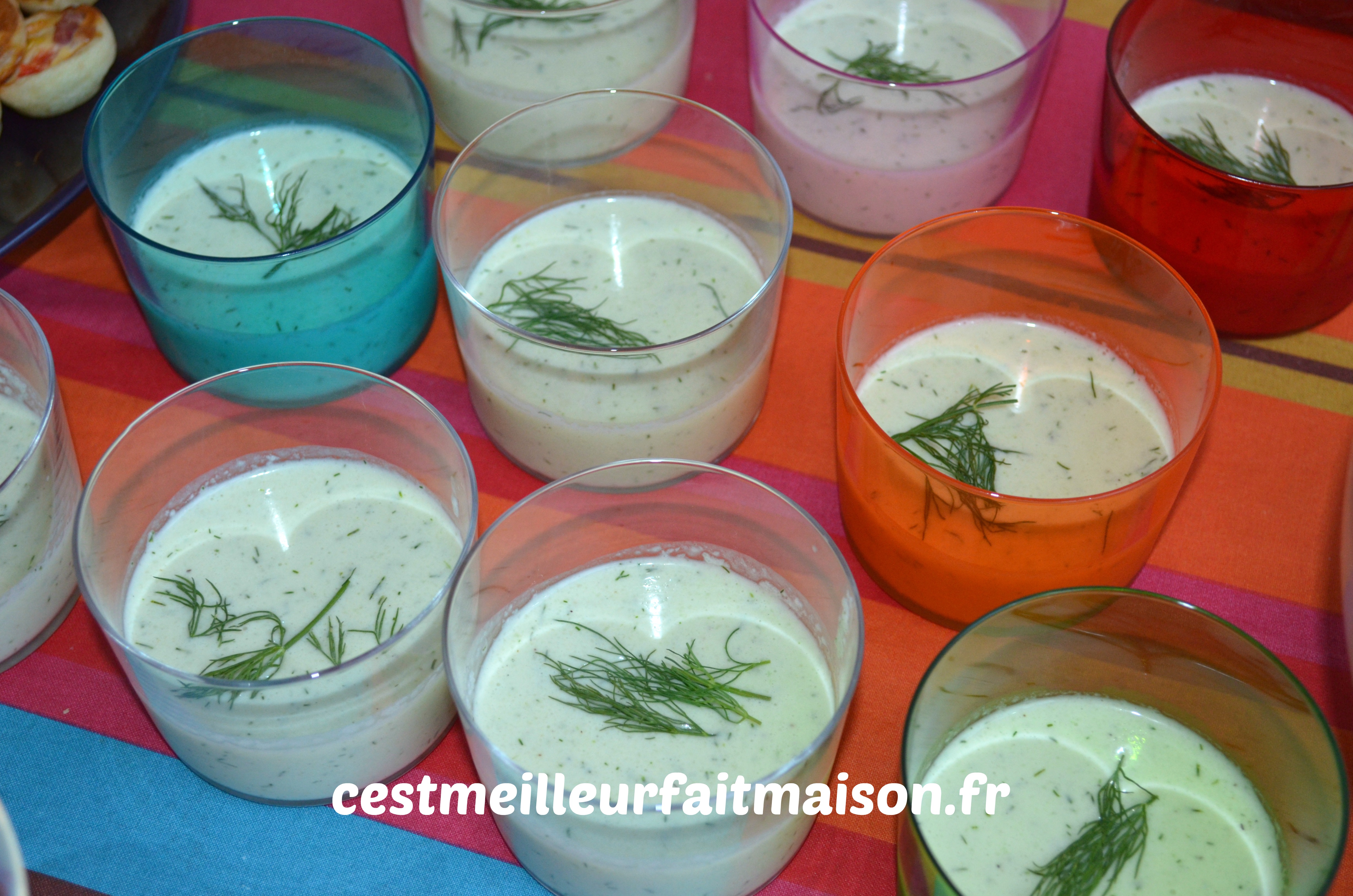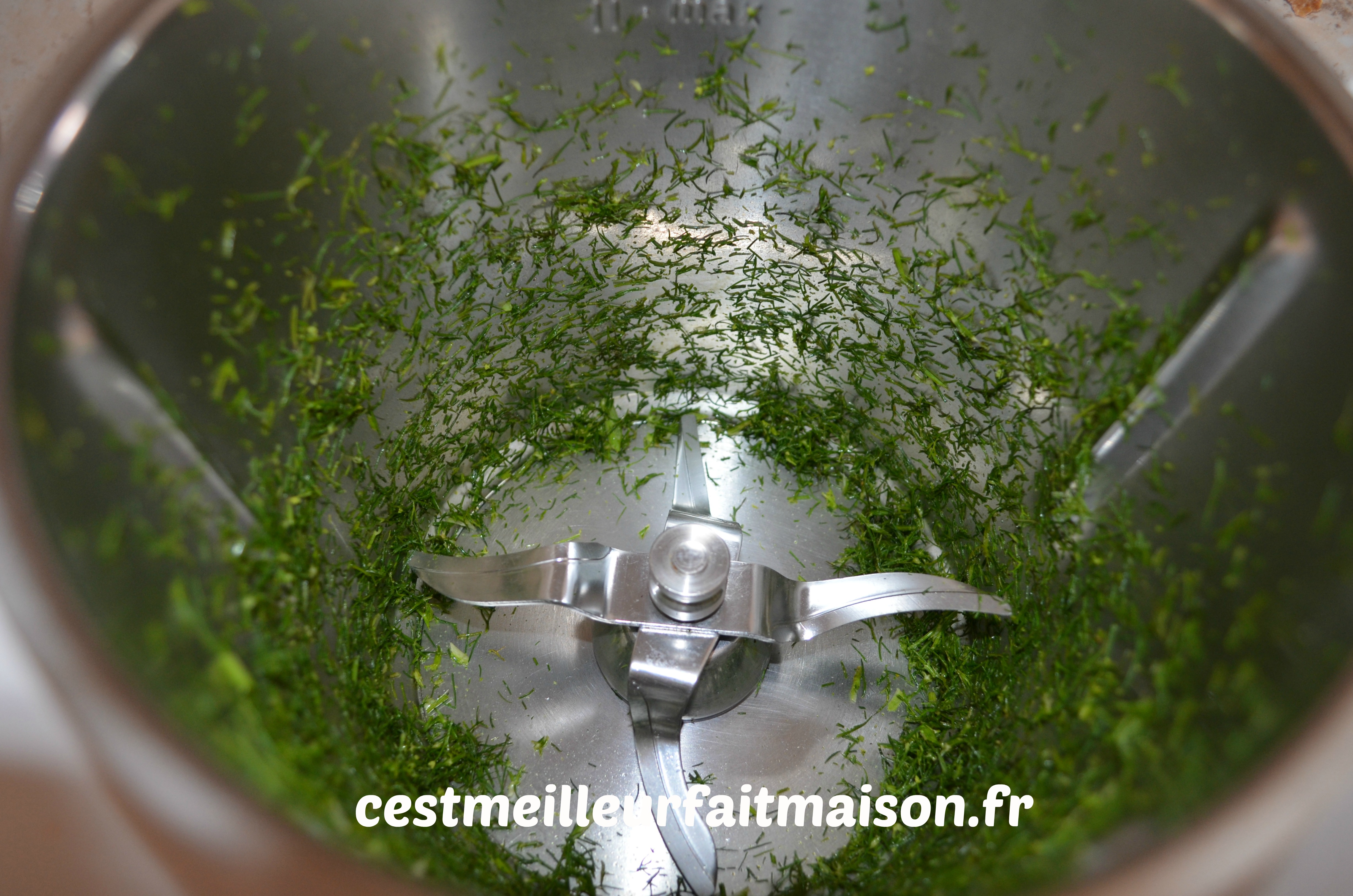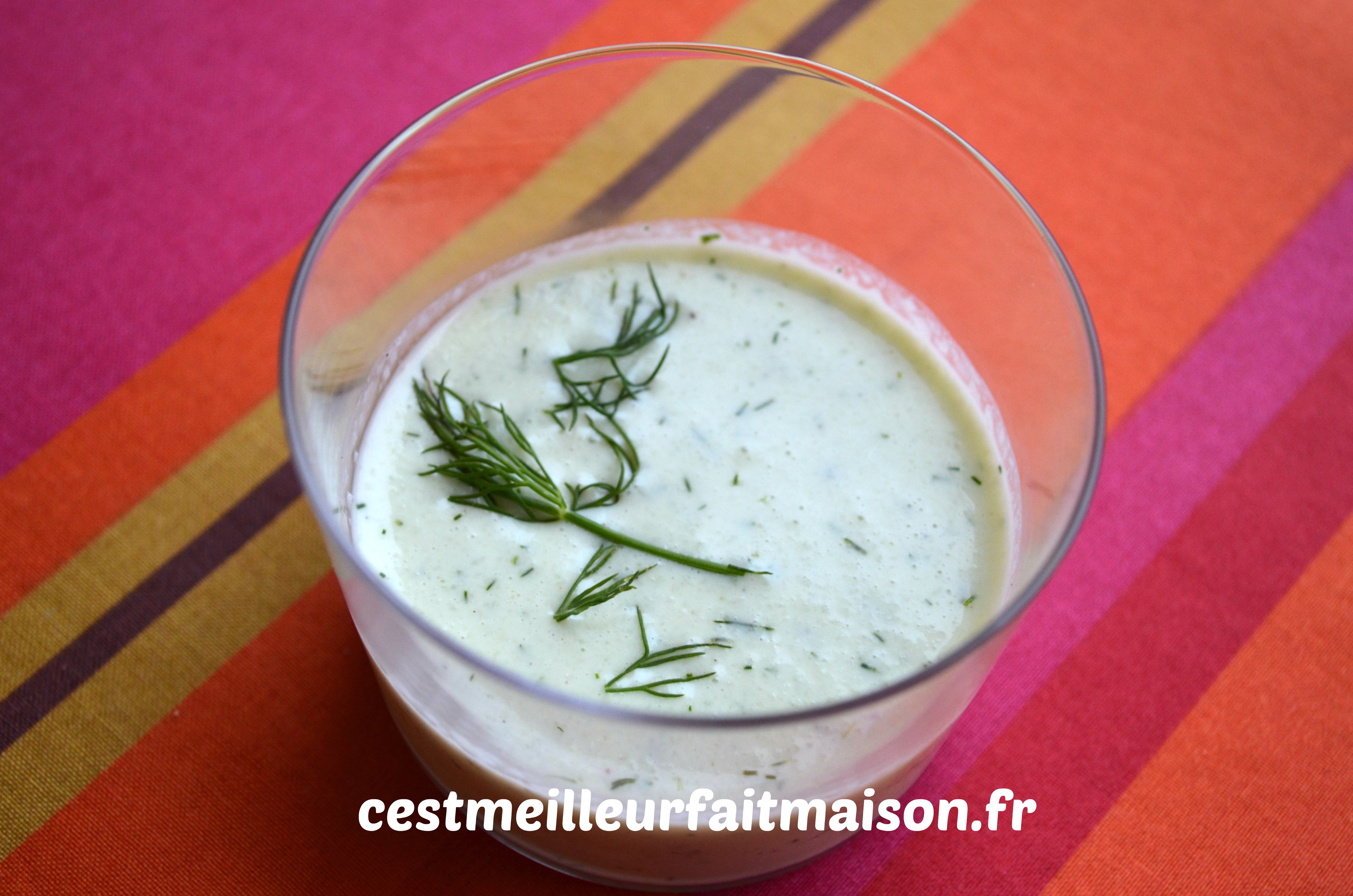 4- Conserver au frais et mélanger au fouet avant de servir dans des verrines décorées avec de l’aneth et éventuellement avec un trait d’huile d’olive.
