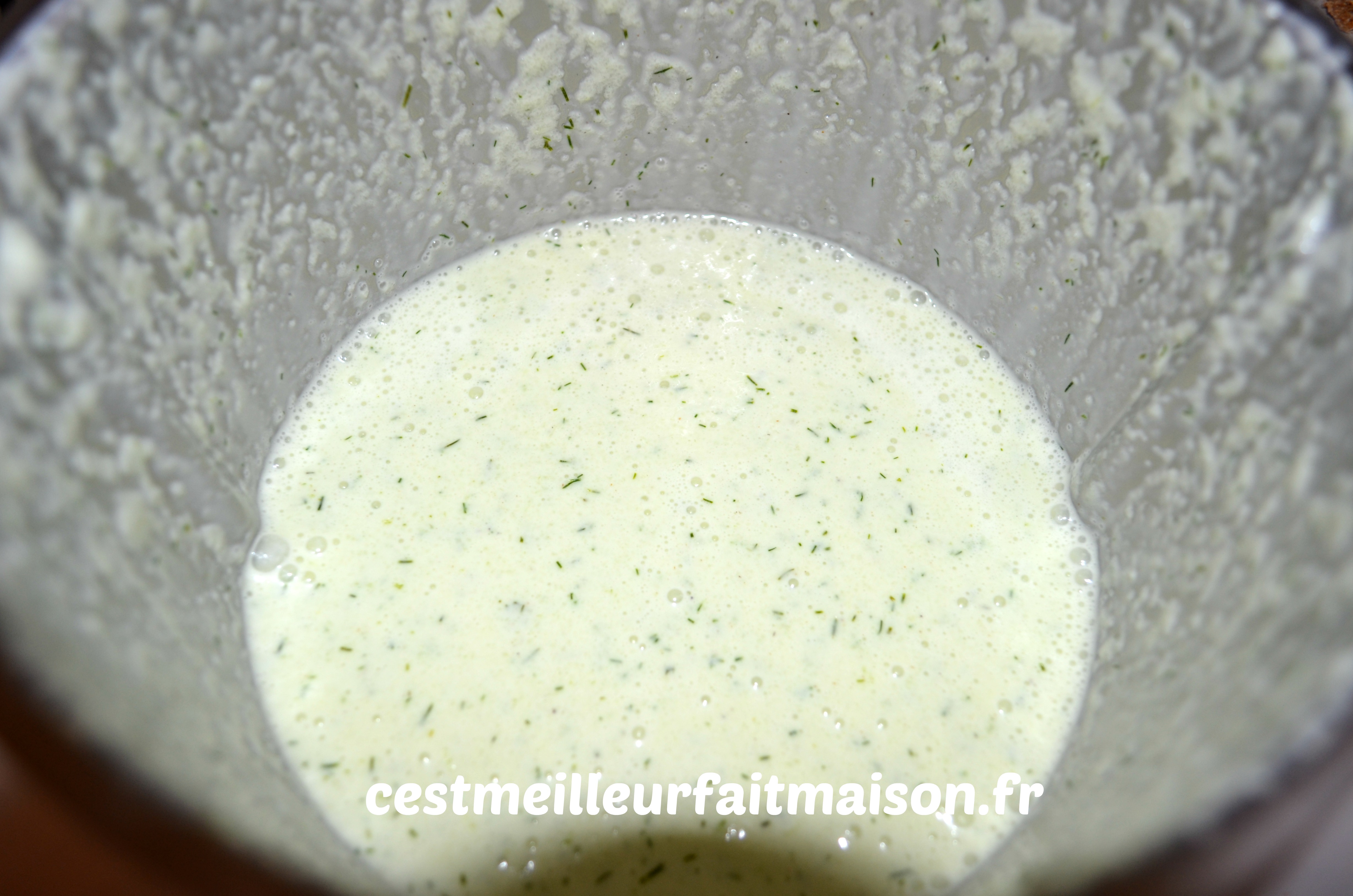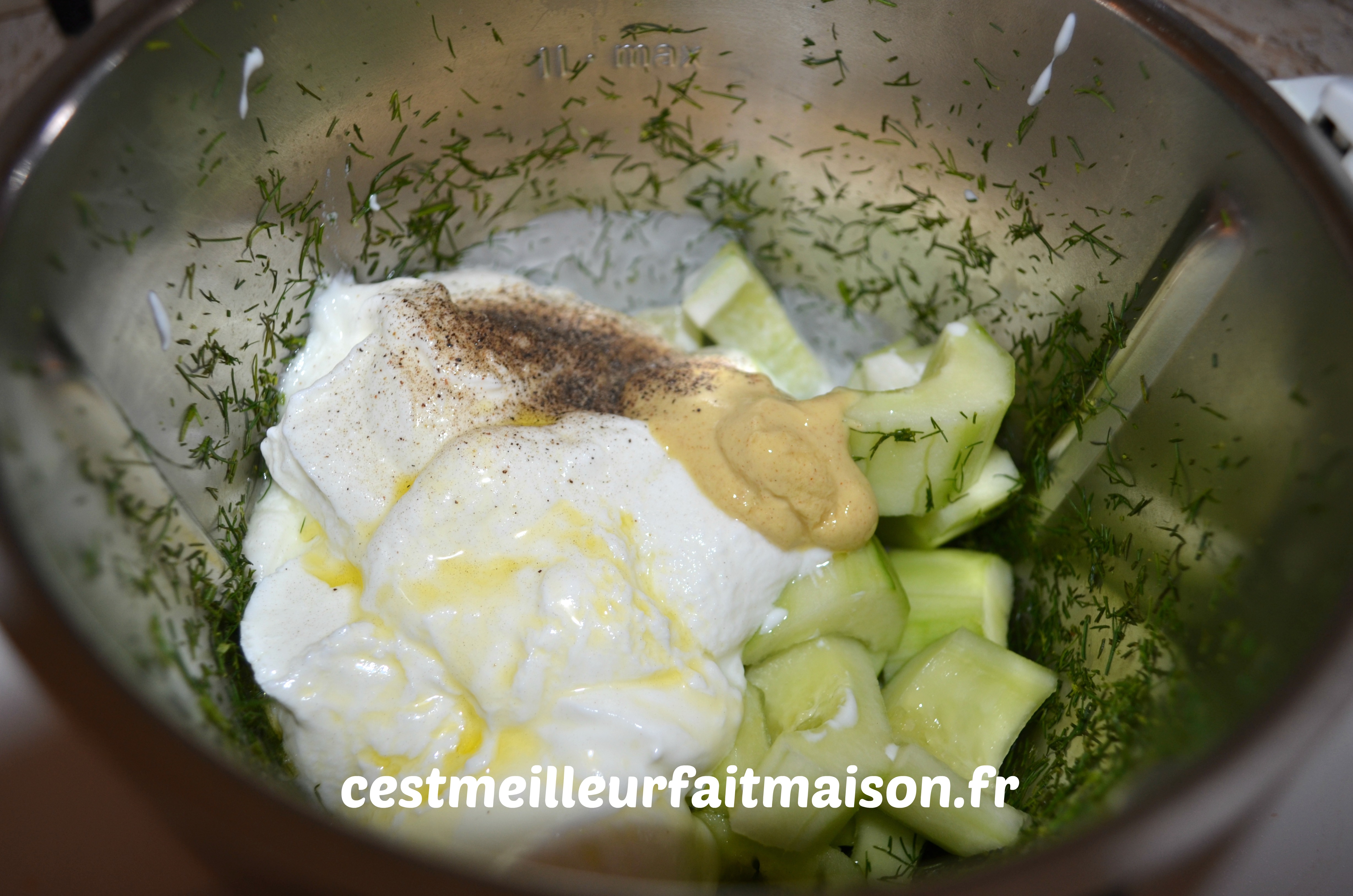 3- Ajouter ensuite les yaourts, la crème, la moutarde, l’huile d’olive, le sel et le poivre. Mixer afin d’obtenir une consistance assez fine.
