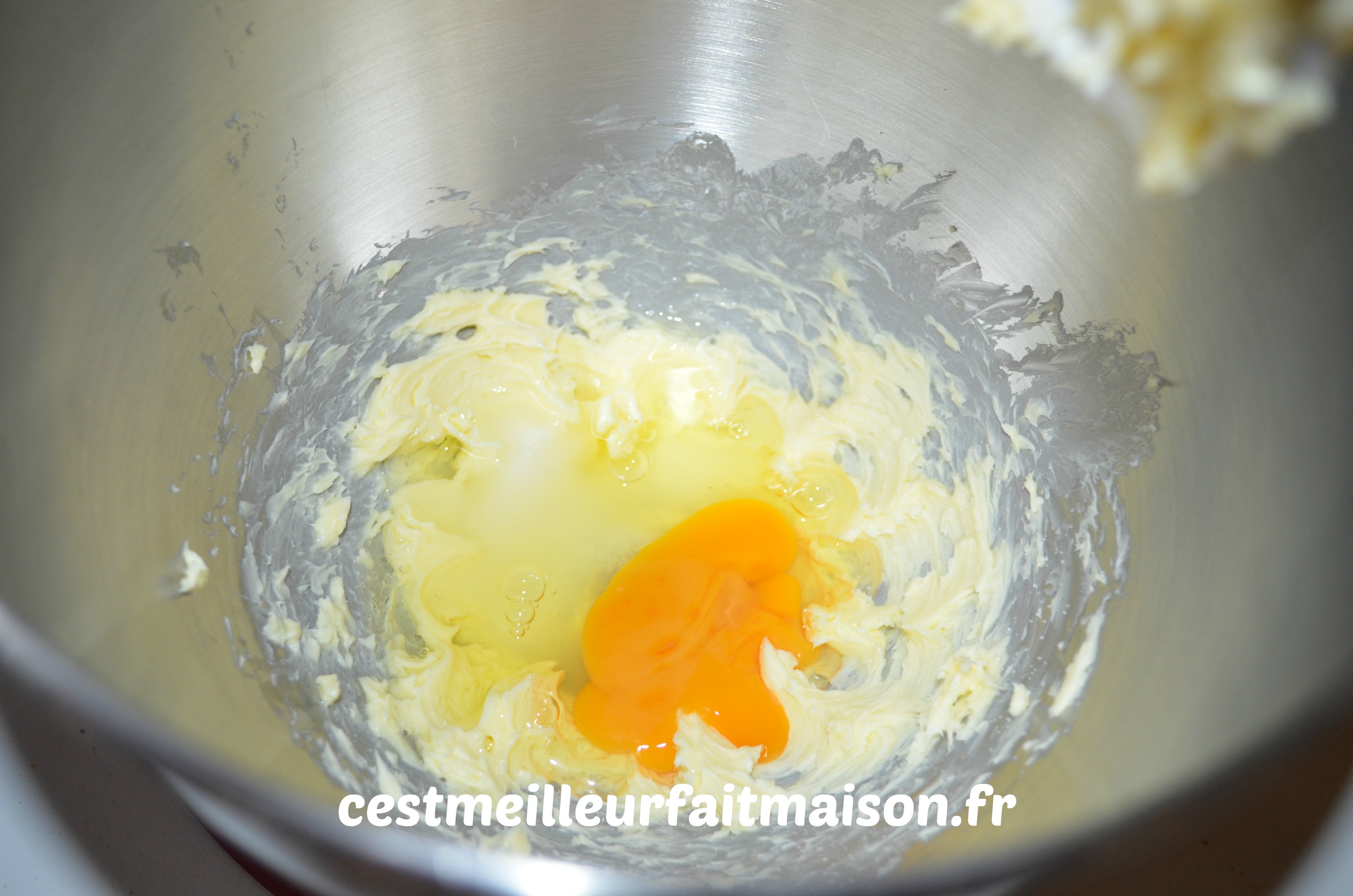 Ajouter le sucre, l’oeuf et mélanger.