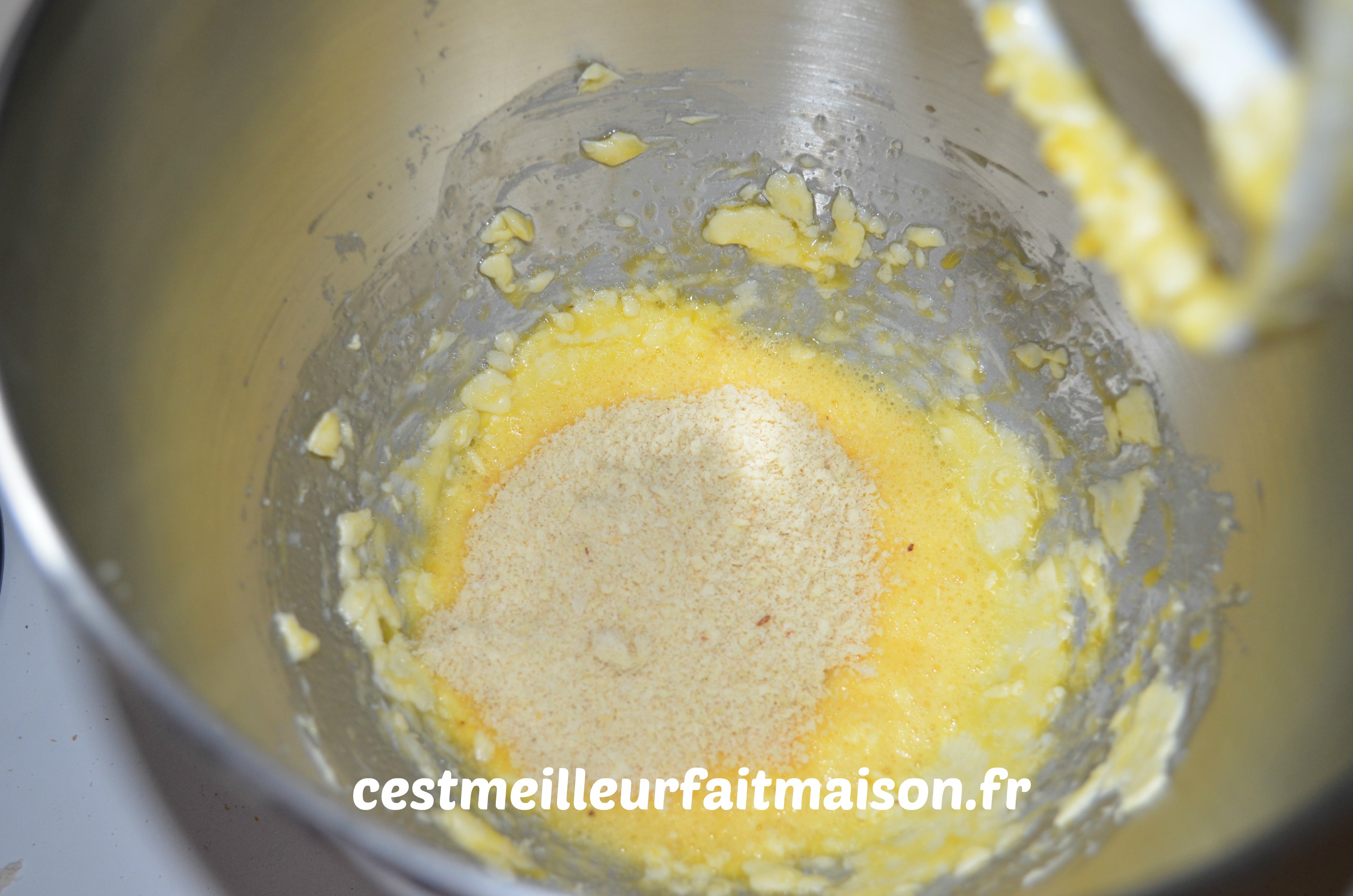 Incorporer le sucre glace et la poudre d’amandes préalablement tamisés.