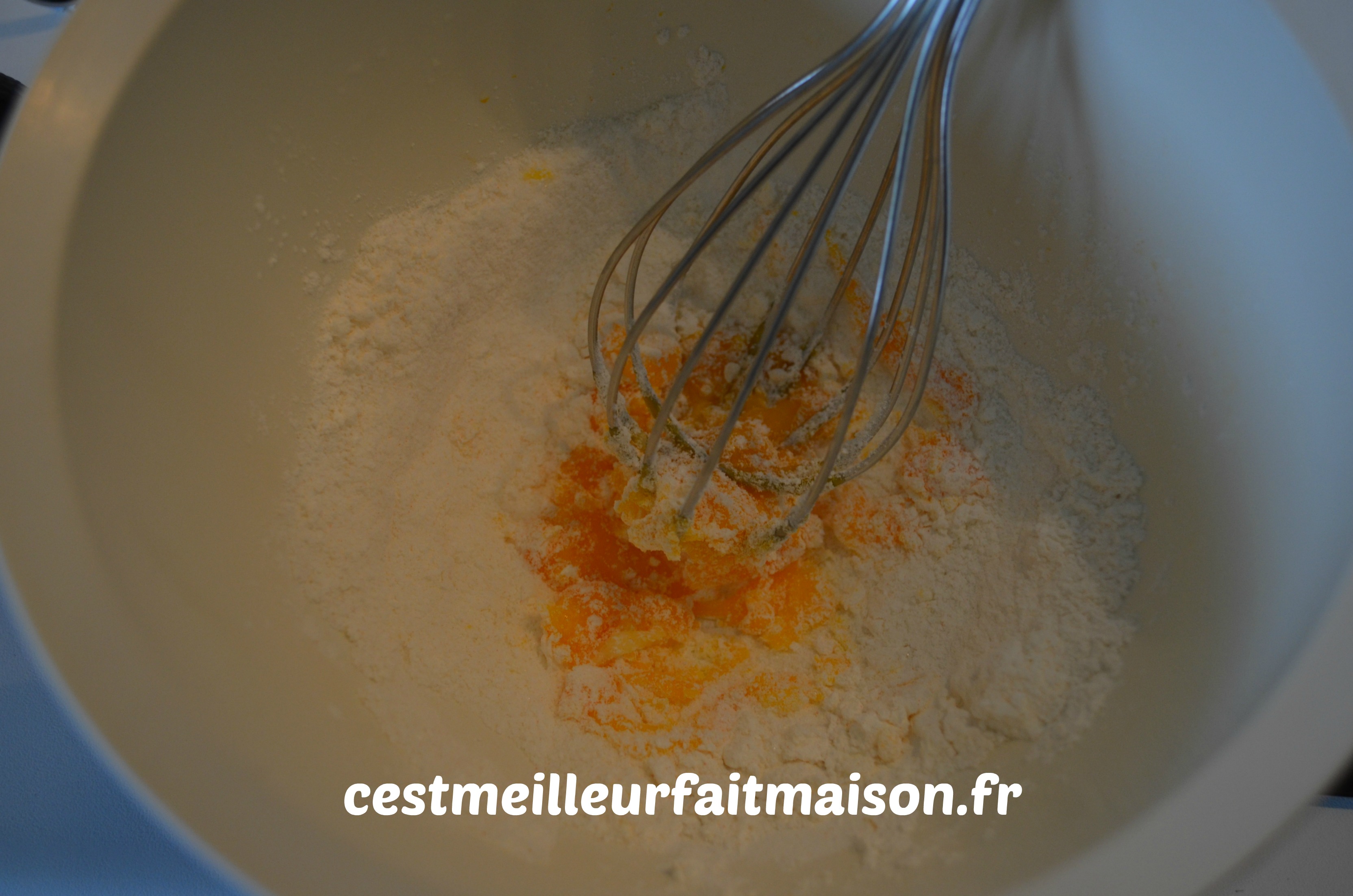 Mélanger la poudre à crème avec le sucre et l’oeuf.