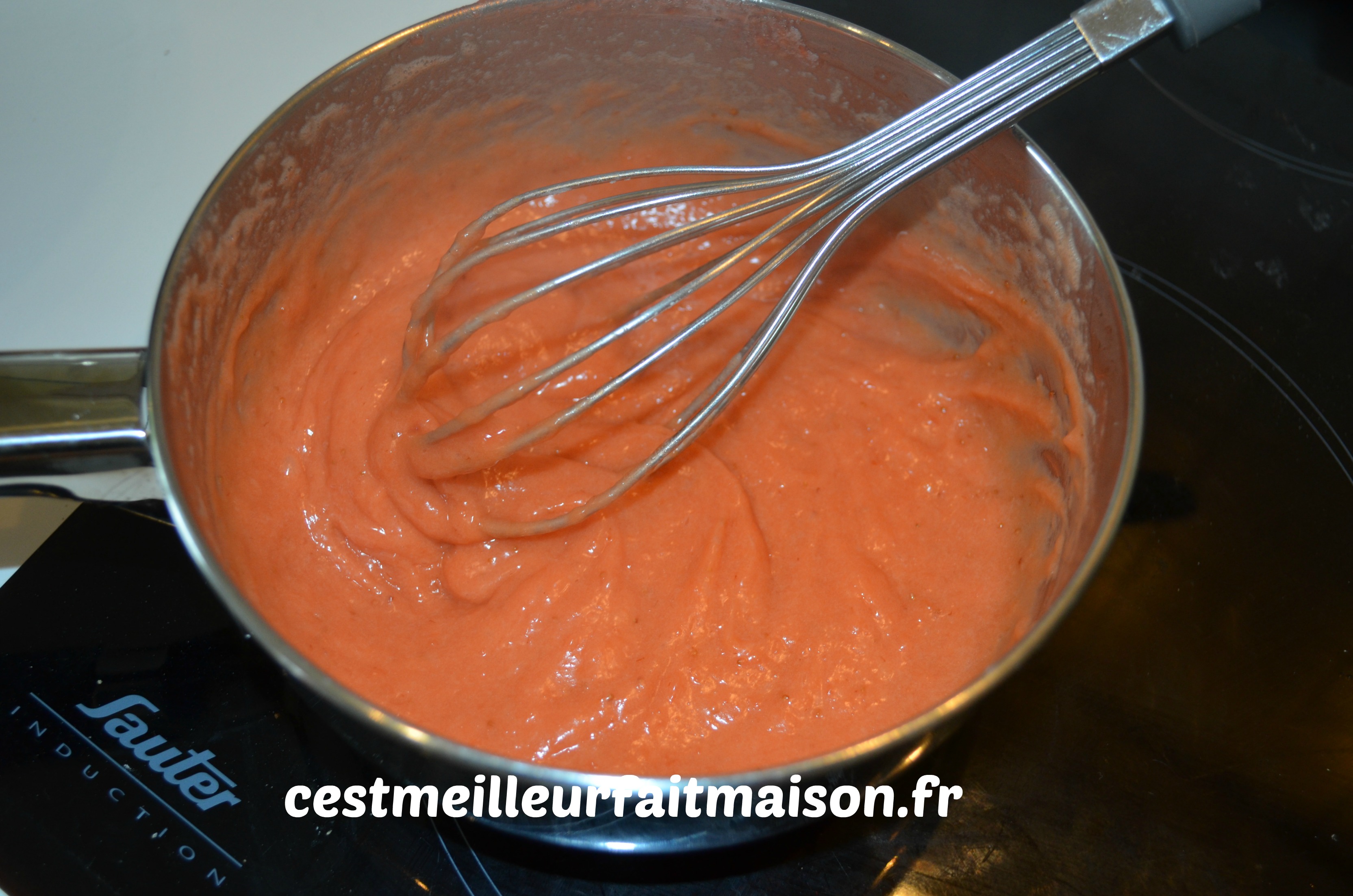 Faire bouillir la purée de fraises et la verser sur le mélange précédent. Mélanger et verser dans la casserole. Fouetter jusqu’à ce que la crème épaississe comme une crème pâtissière. Laisser refroidir dans un récipient en filmant au contact.
