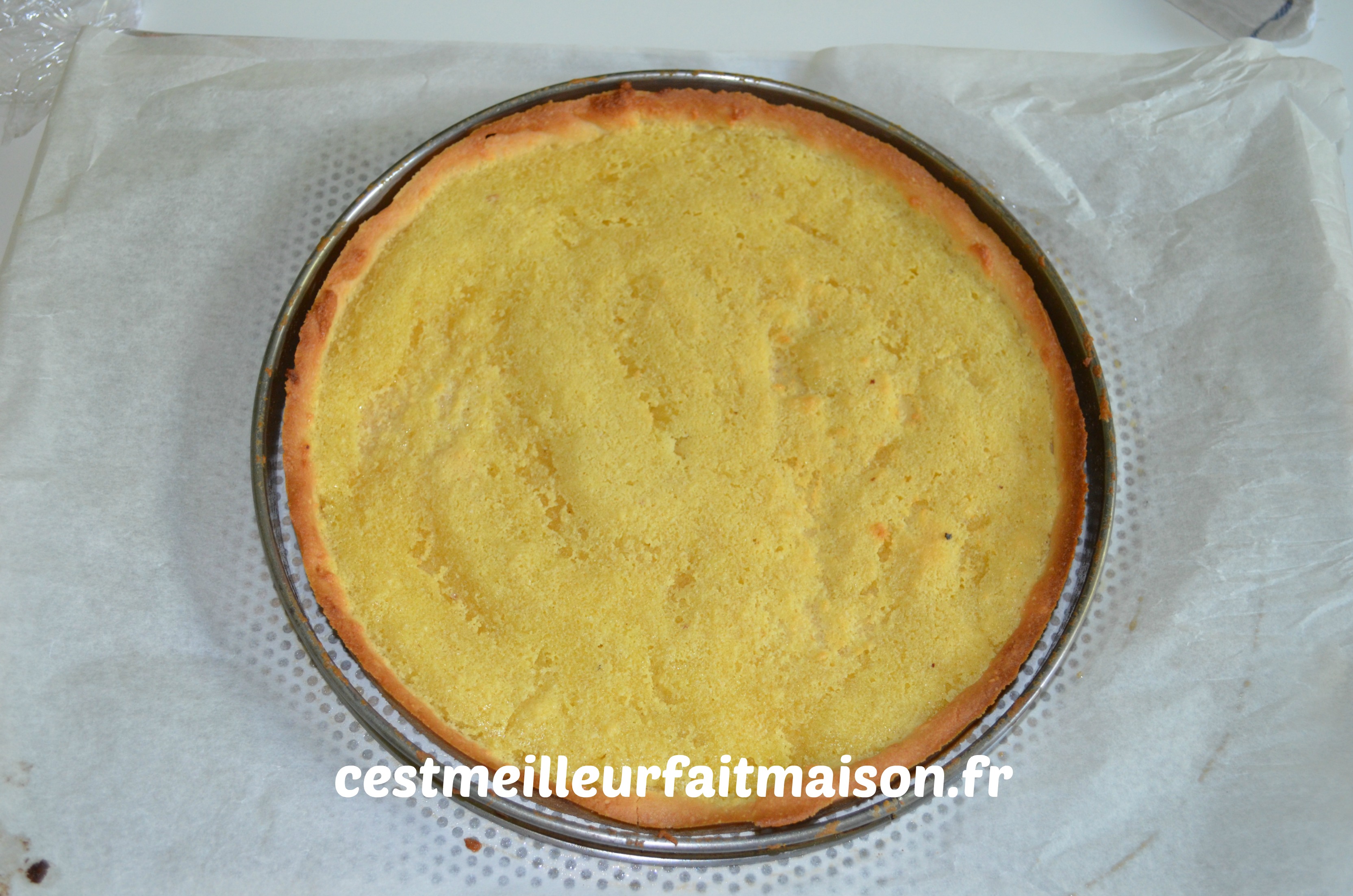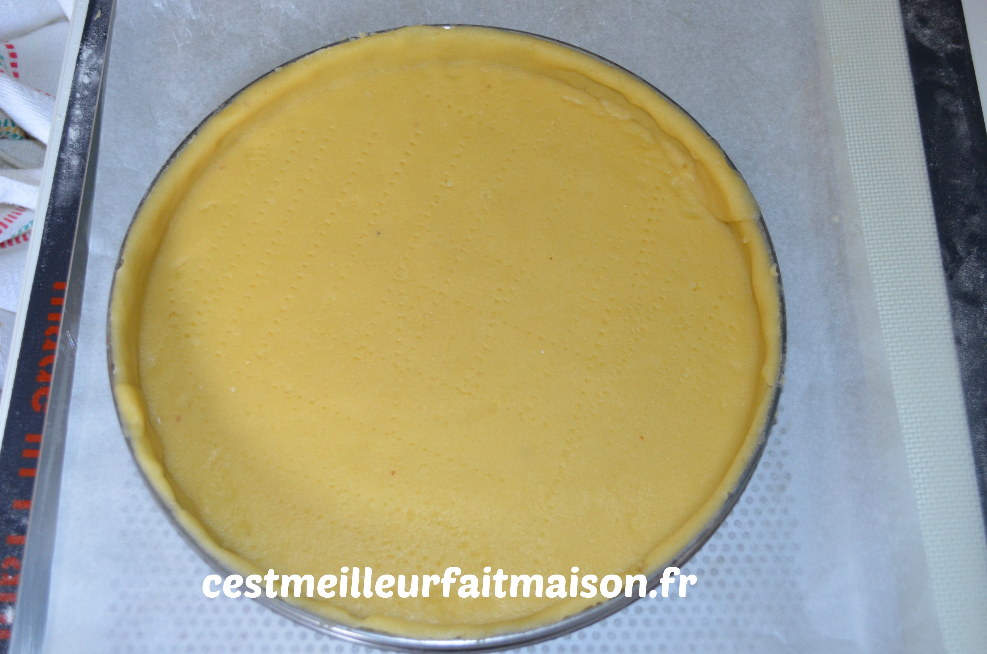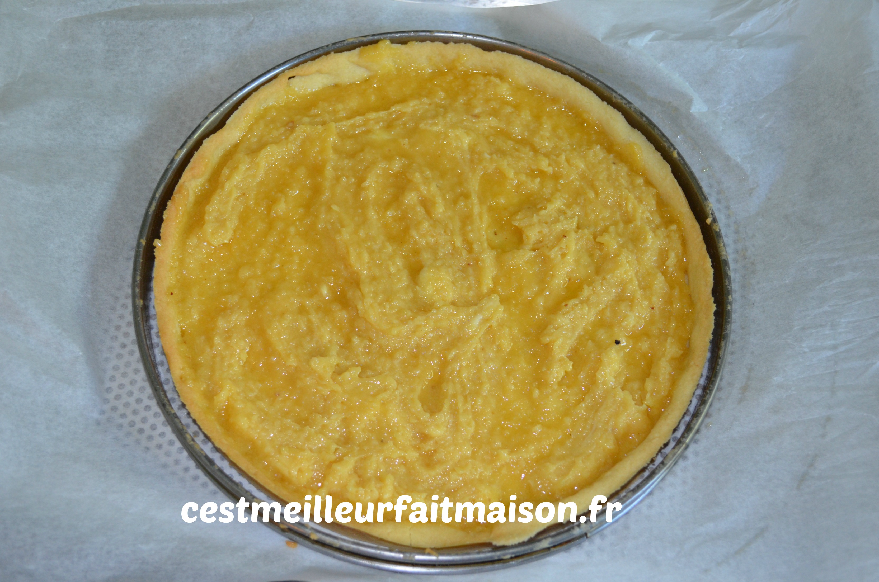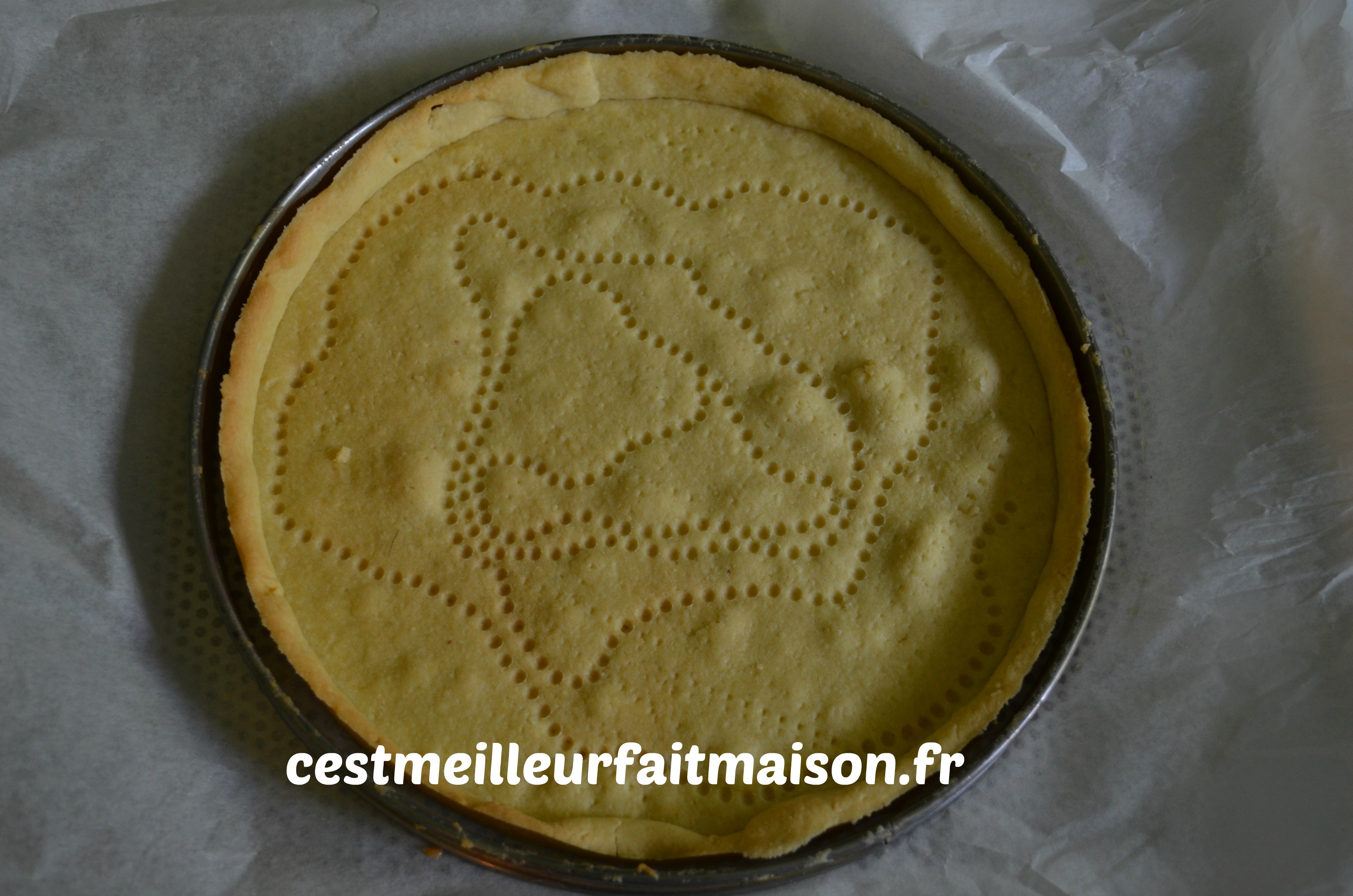Etaler 350 g de pâte sablée. Garder le reste pour une autre recette. Foncer un cercle à tarte de 22 cm. Précuire la pâte à blanc pendant 20 min.