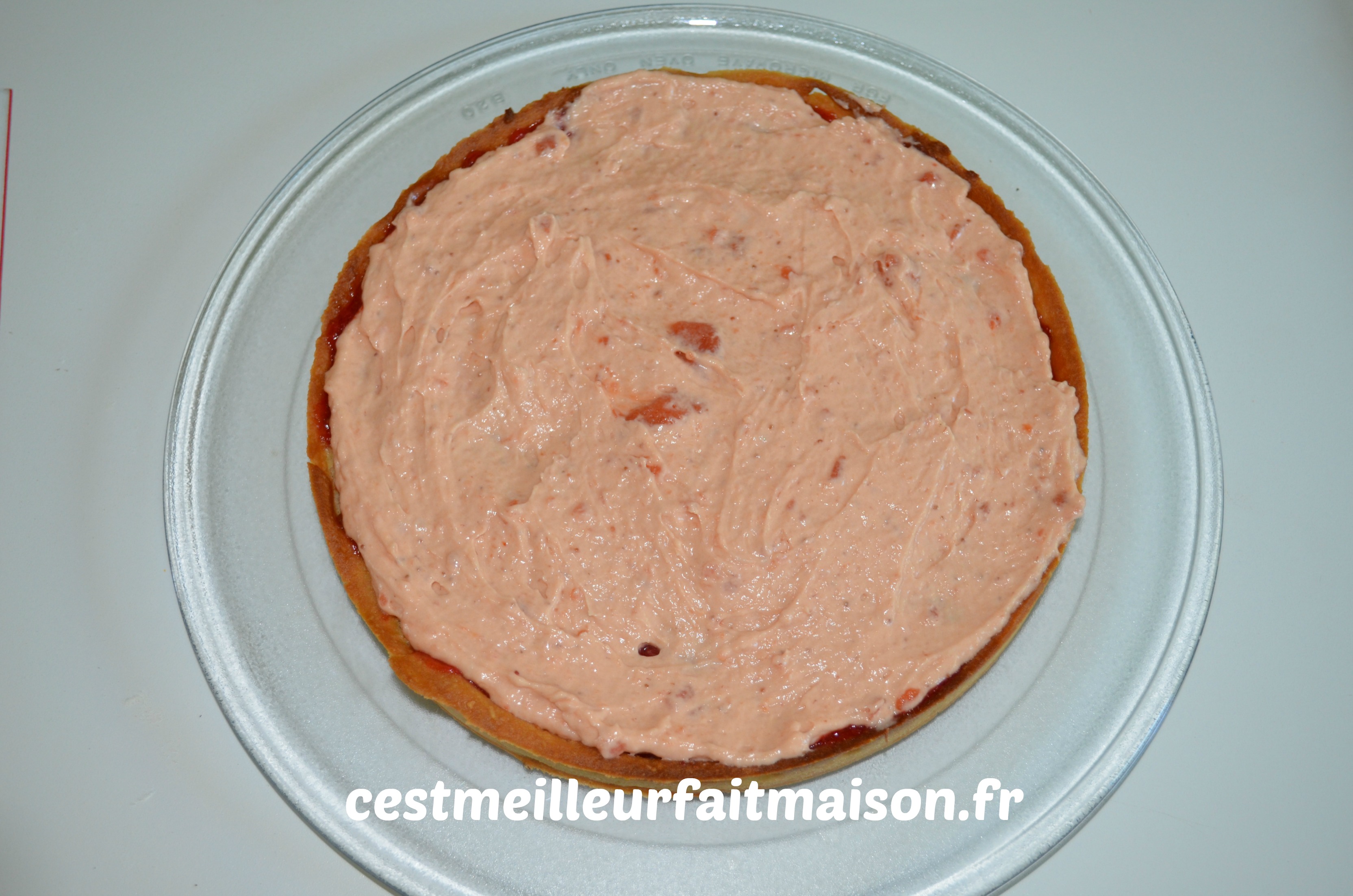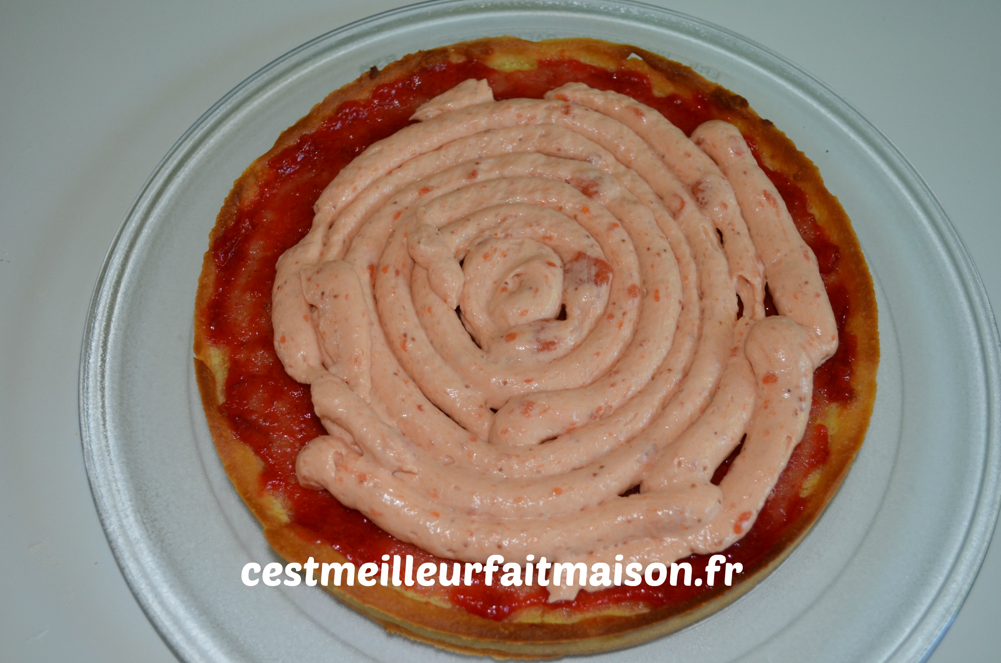 8- Mélanger la crème montée avec la crème à la purée de fraises. Mettre dans une poche à douille et ajouter la crème légère sur la tarte. Bien lisser.