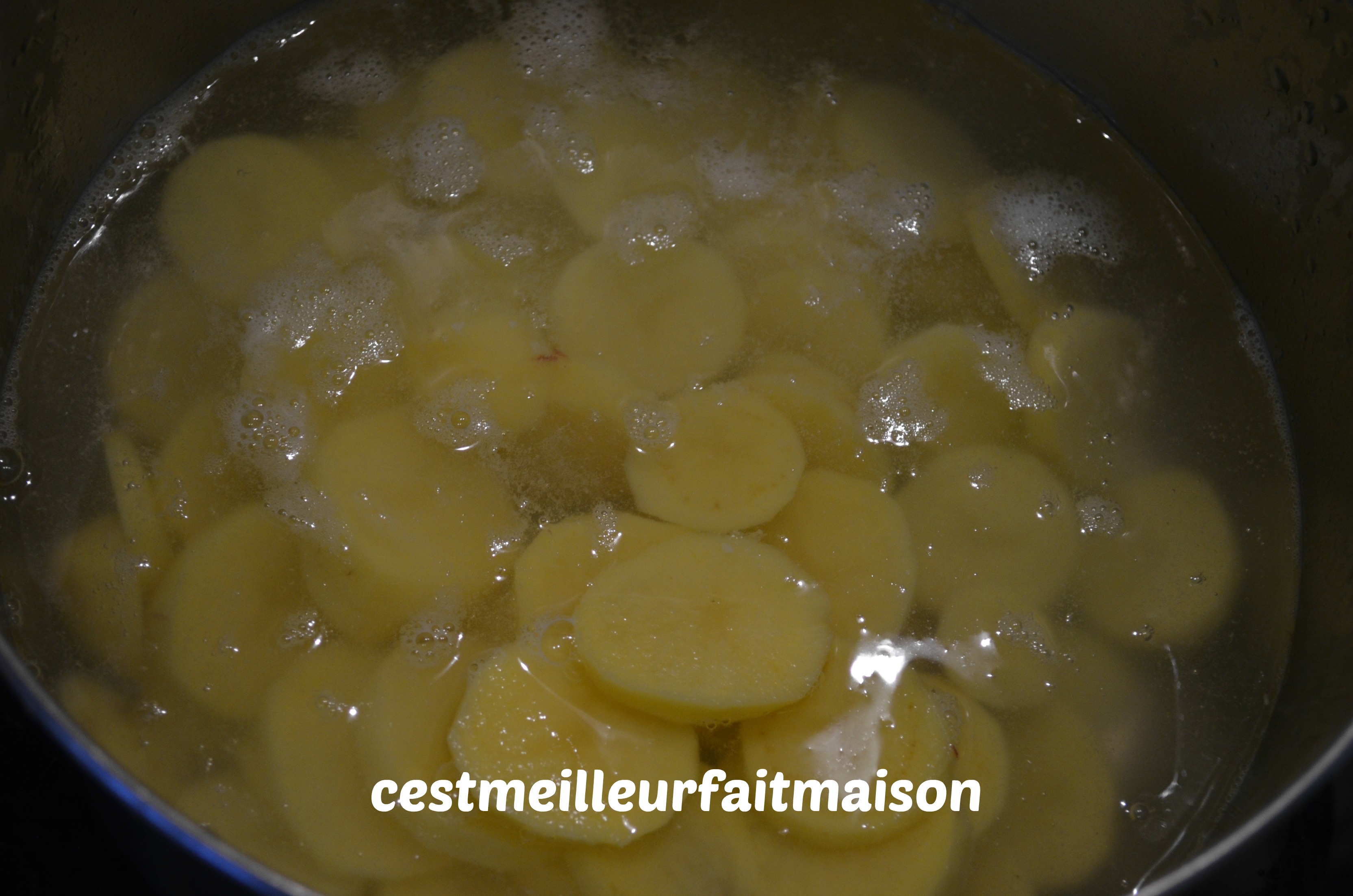 1- Éplucher et couper les pommes de terre en rondelles. Les cuire 10 min dans de l’eau bouillante salée. Égoutter et réserver pendant la préparation du reste de la recette.
