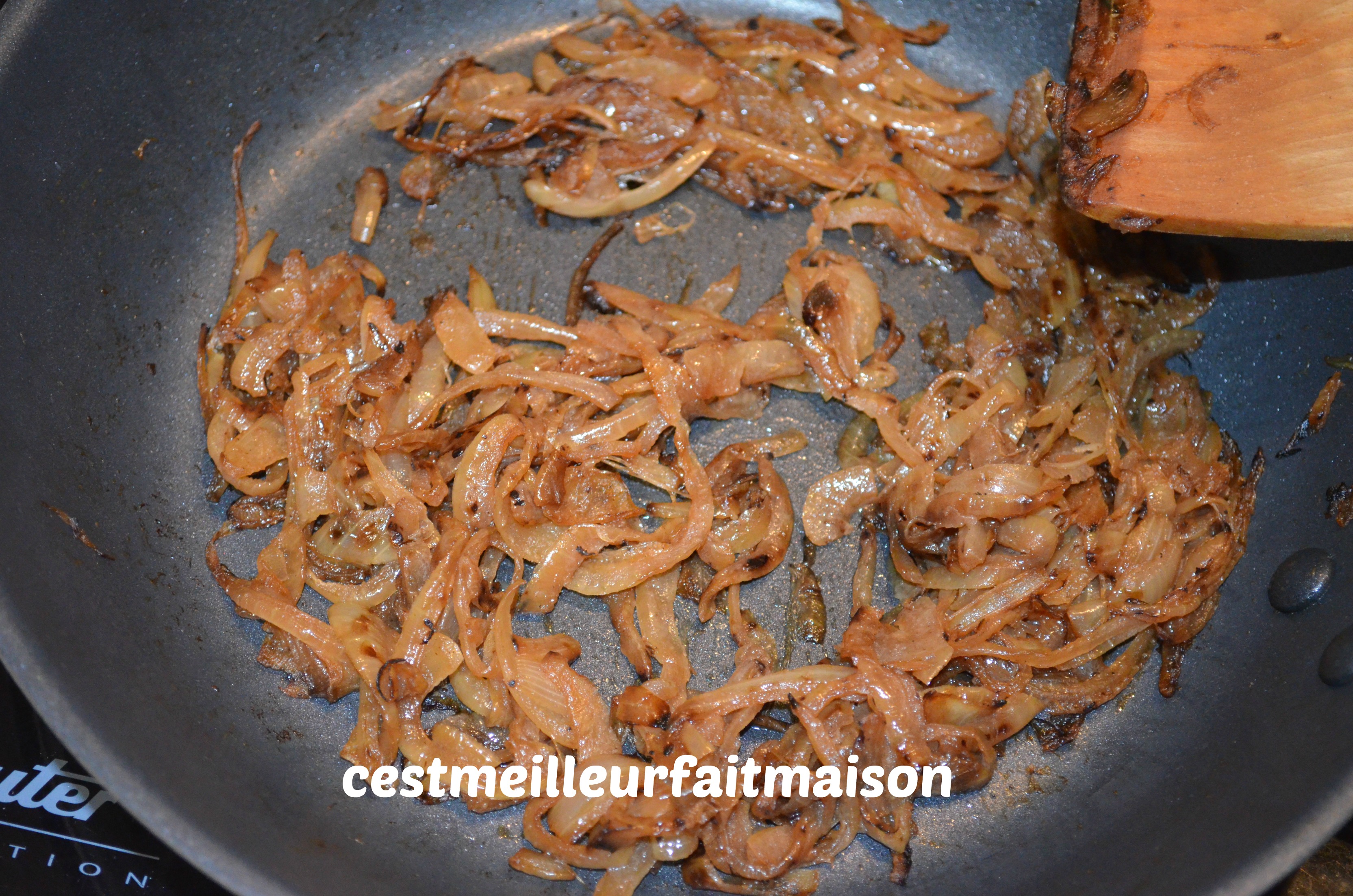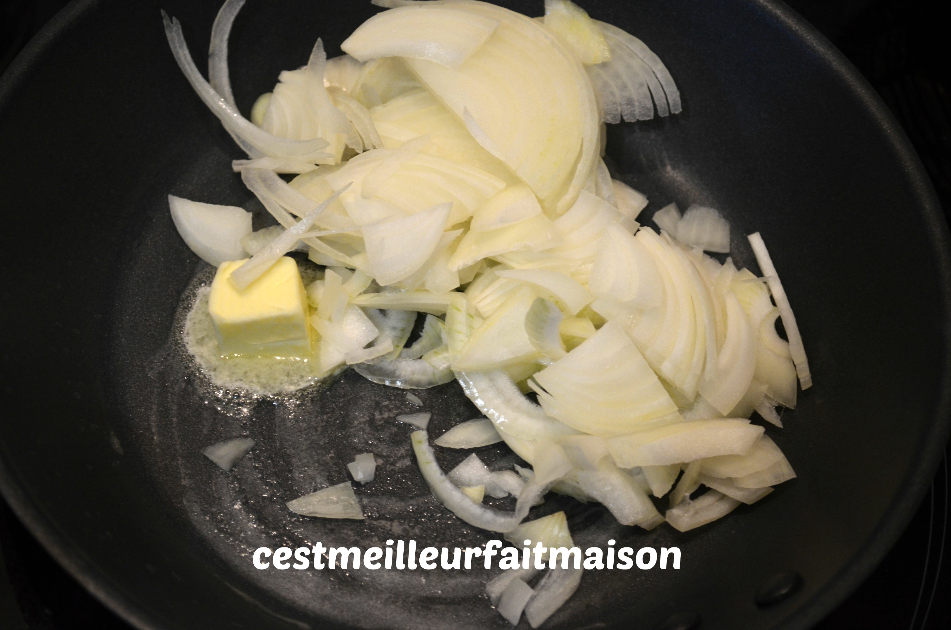 2-Emincer finement les oignons et les faire revenir dans le beurre. J’ai choisi de ne pas mettre trop de beurre donc j’ai ajouté un peu d’eau pour finir la cuisson. Lorsqu’ils ont une belle couleur caramélisée, les mettre de côté.