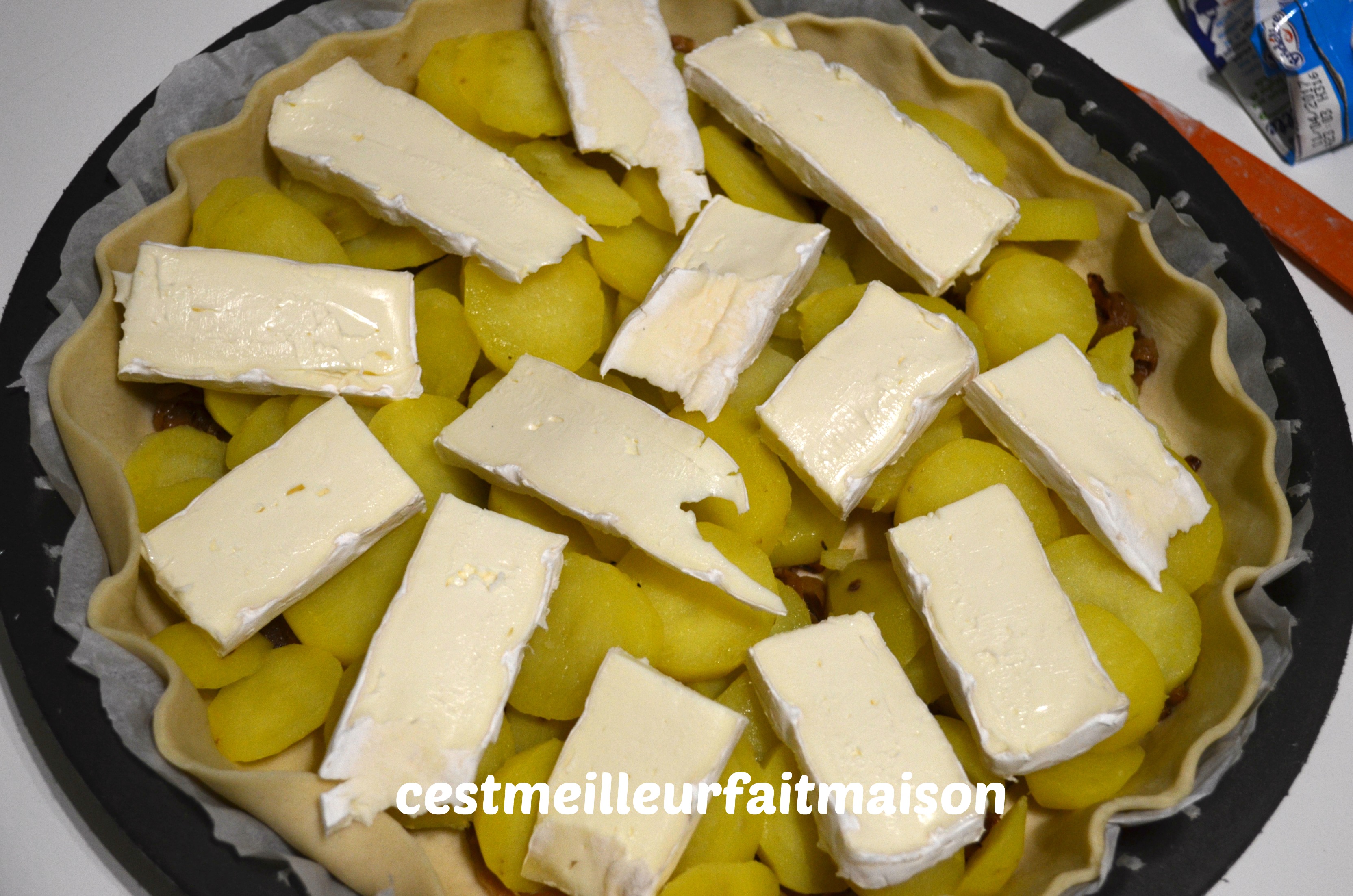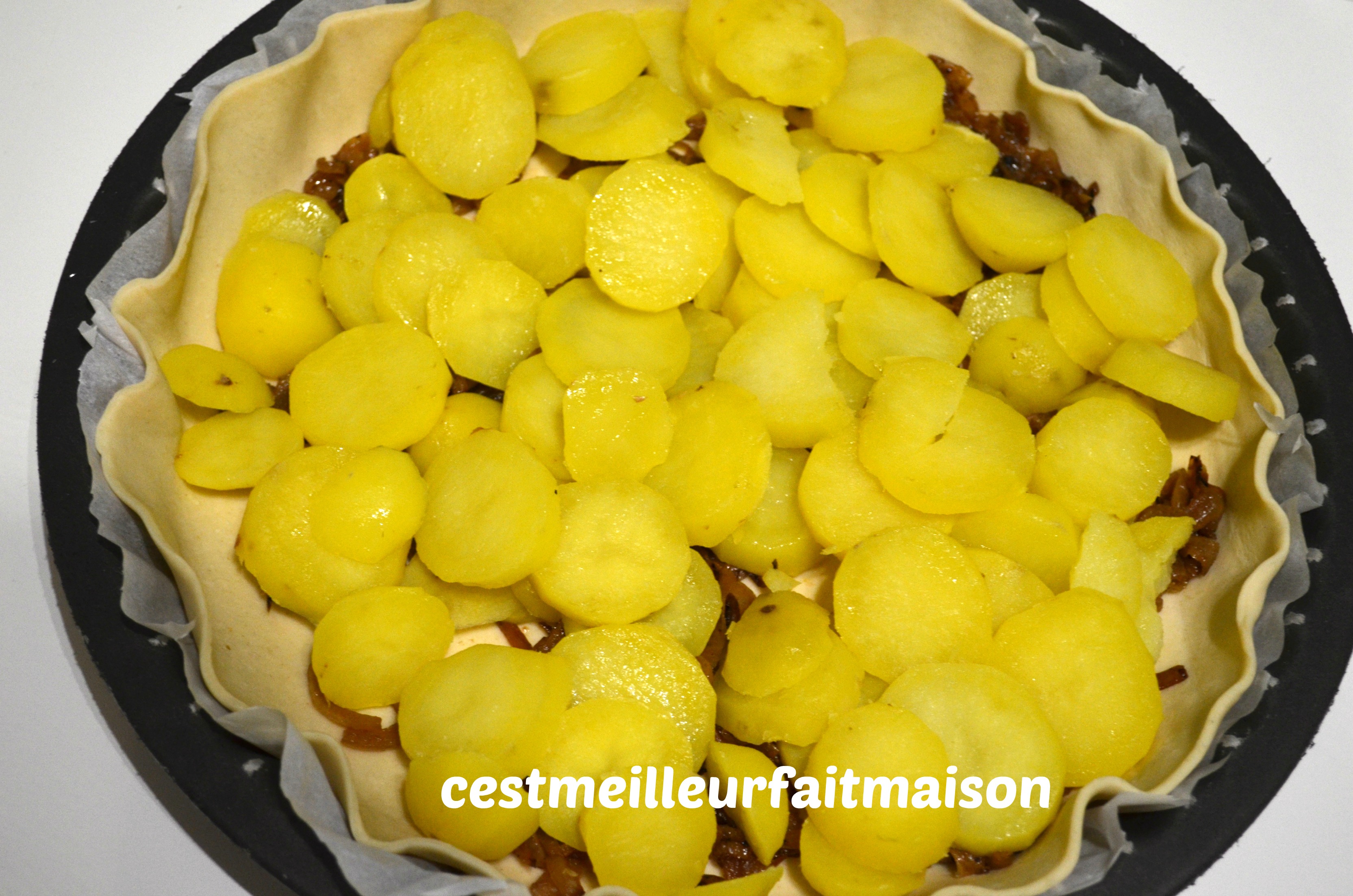 Dérouler la pâte et la mettre dans un moule. La piquer avec une fourchette. Commencer par mettre les oignons et recouvrir avec les rondelles de pommes de terre.