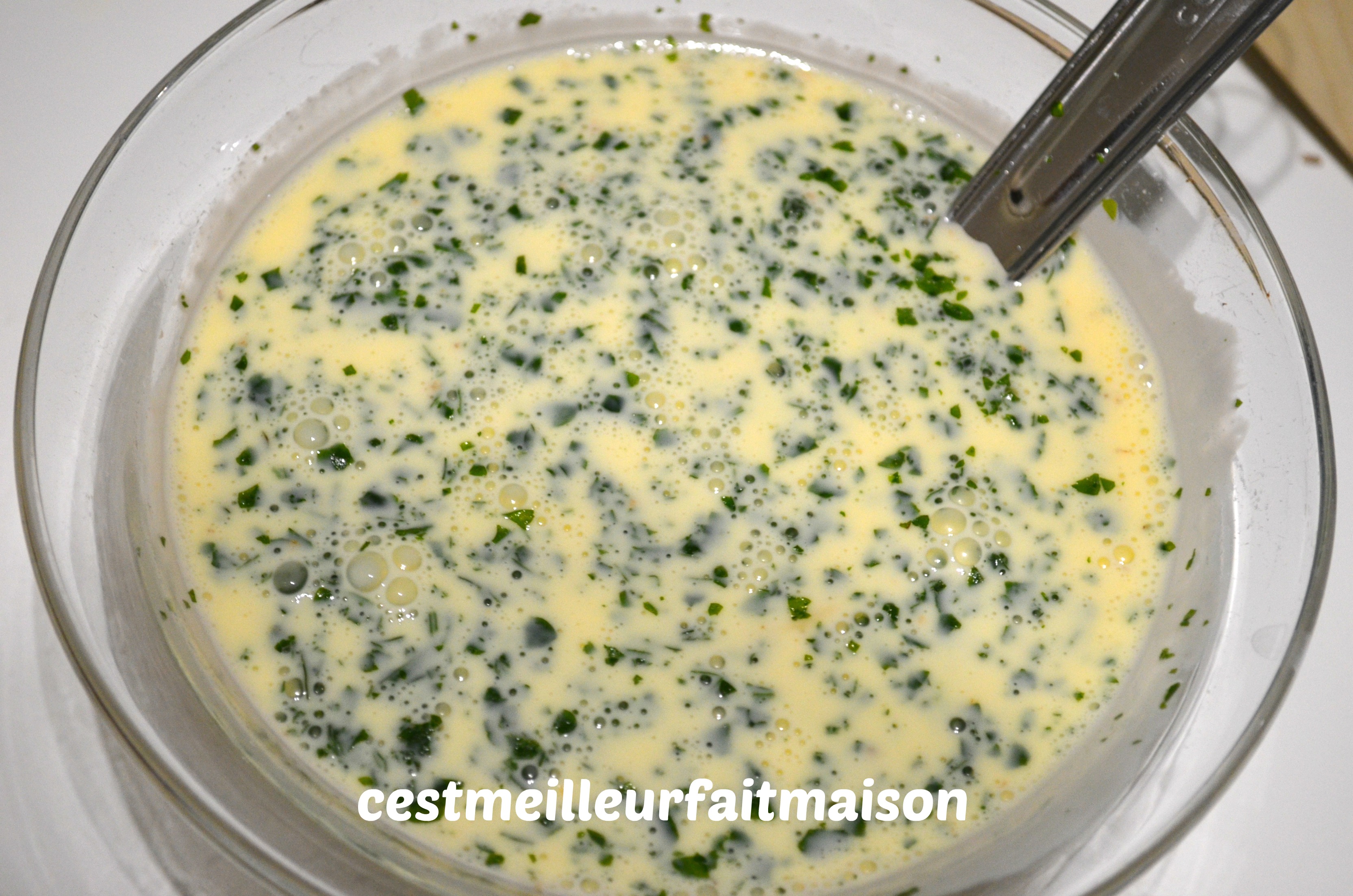 3- Dans un saladier, battre les œufs. Ajouter le lait, la crème, le sel, le poivre, la noix de muscade et le persil. Bien mélanger.