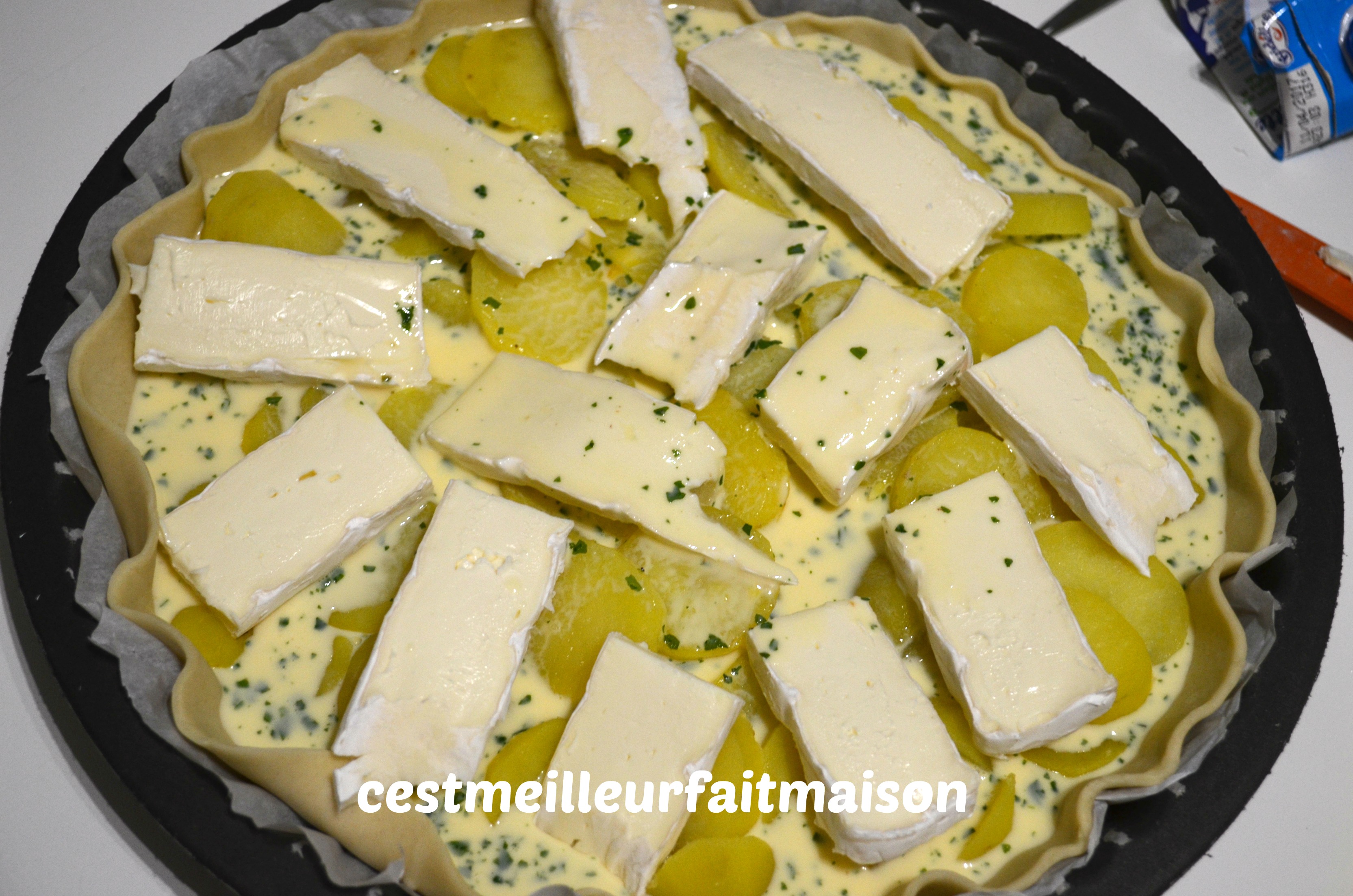 5- Découper le brie en tranche et les déposer sur les pommes de terre. Verser la préparation liquide par-dessus.