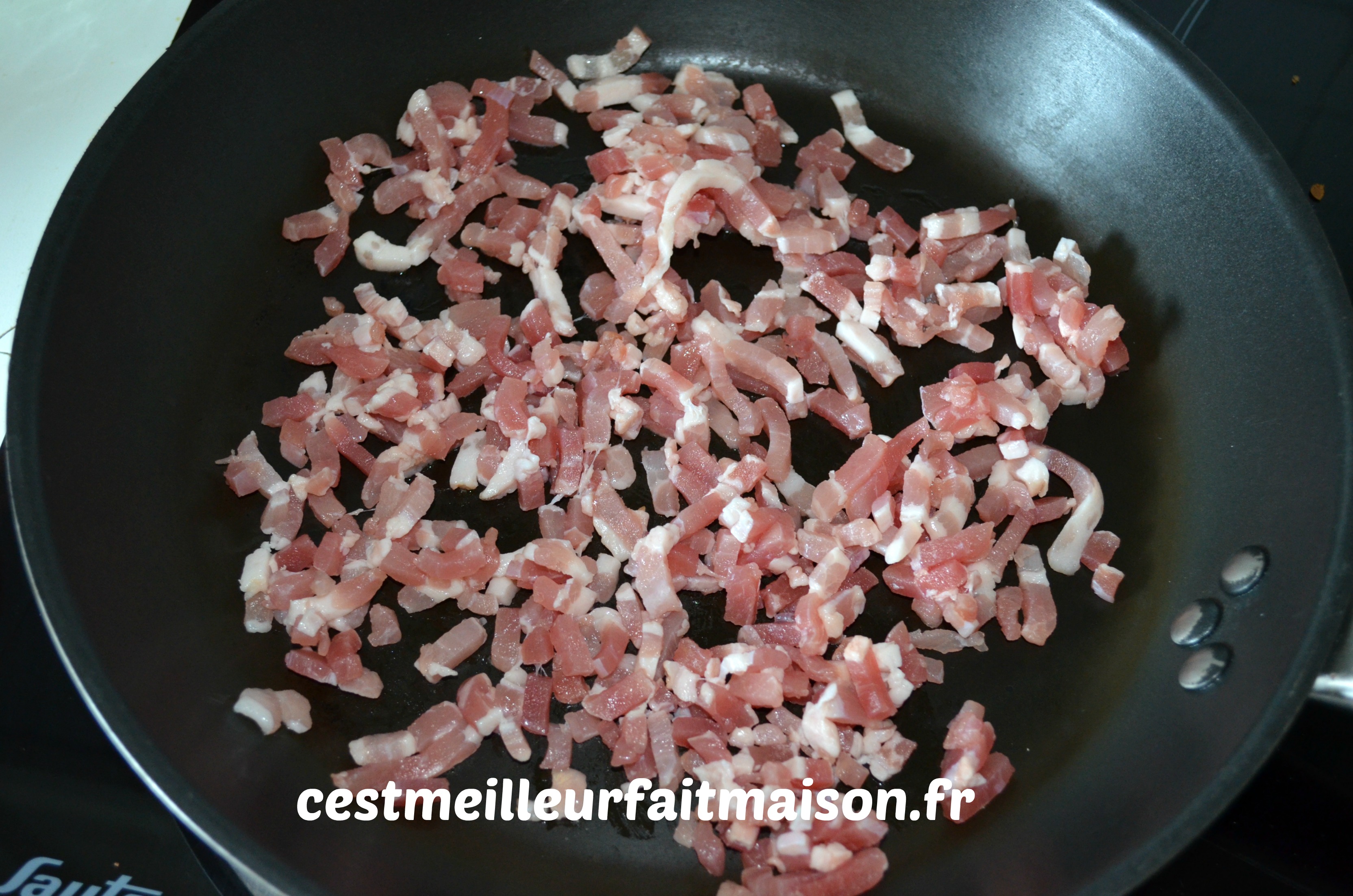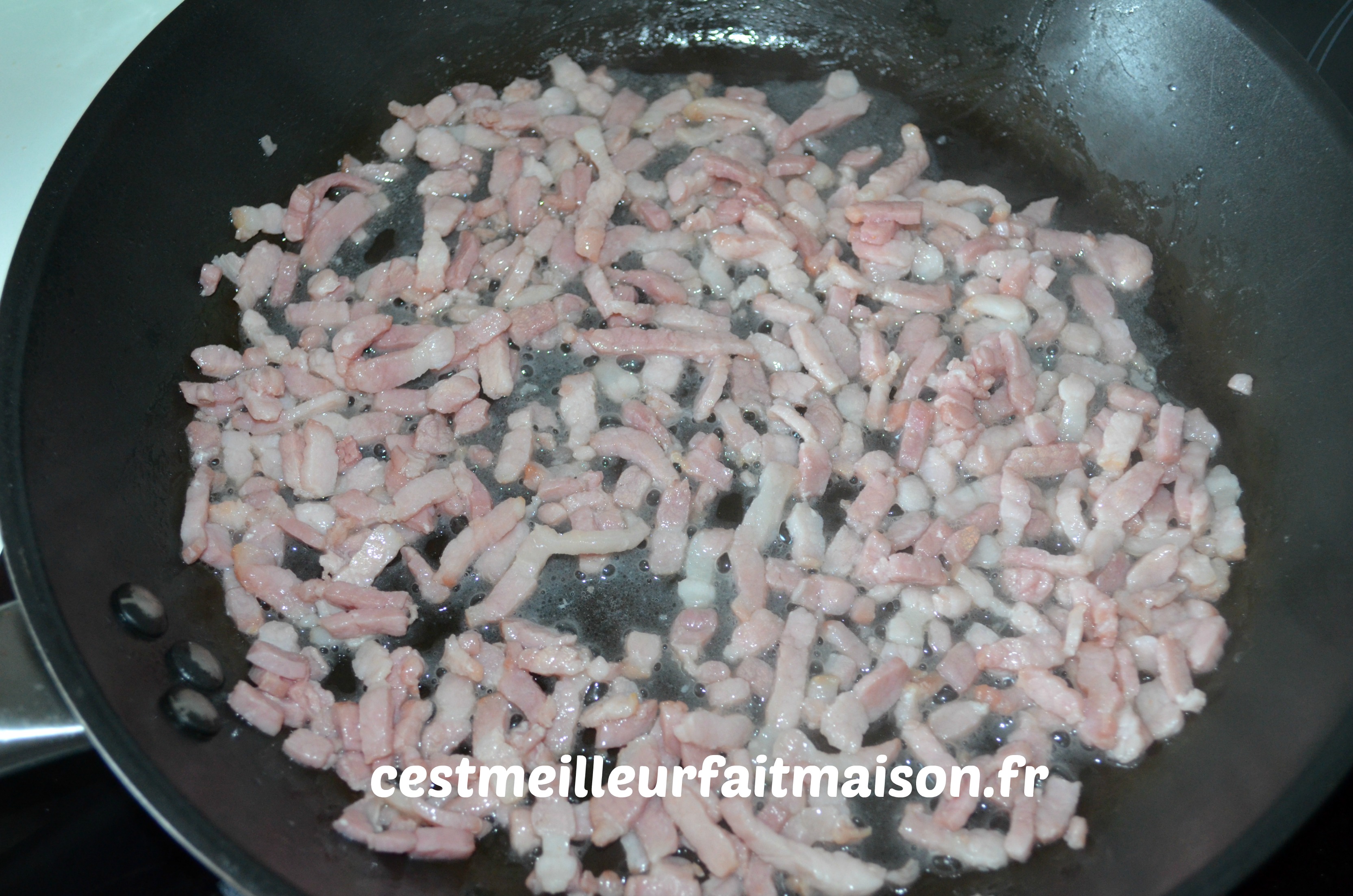 2- Dans une poêle, faire revenir les lardons, sans ajout de matière grasse. Les égoutter et les laisser tiédir.