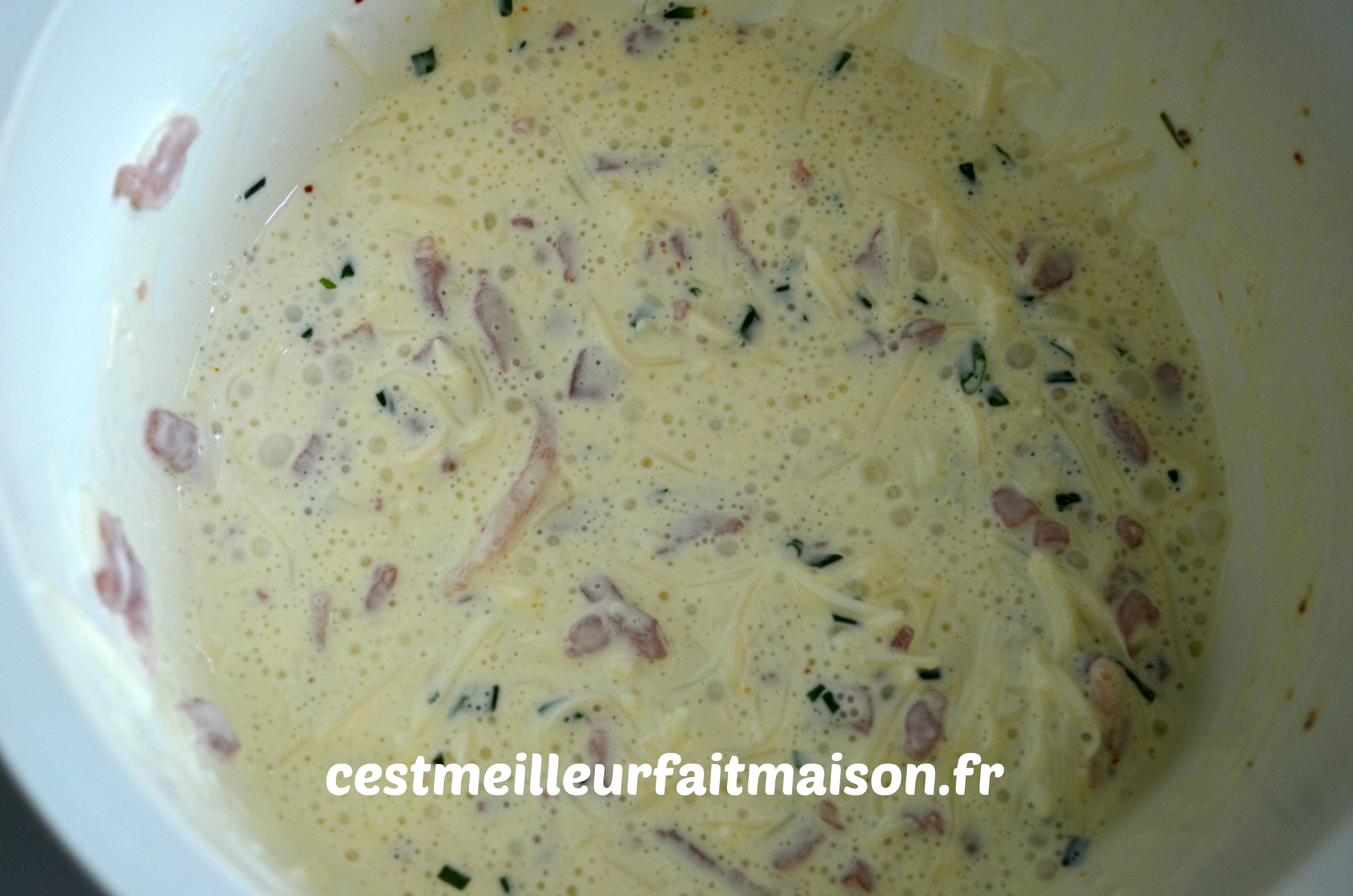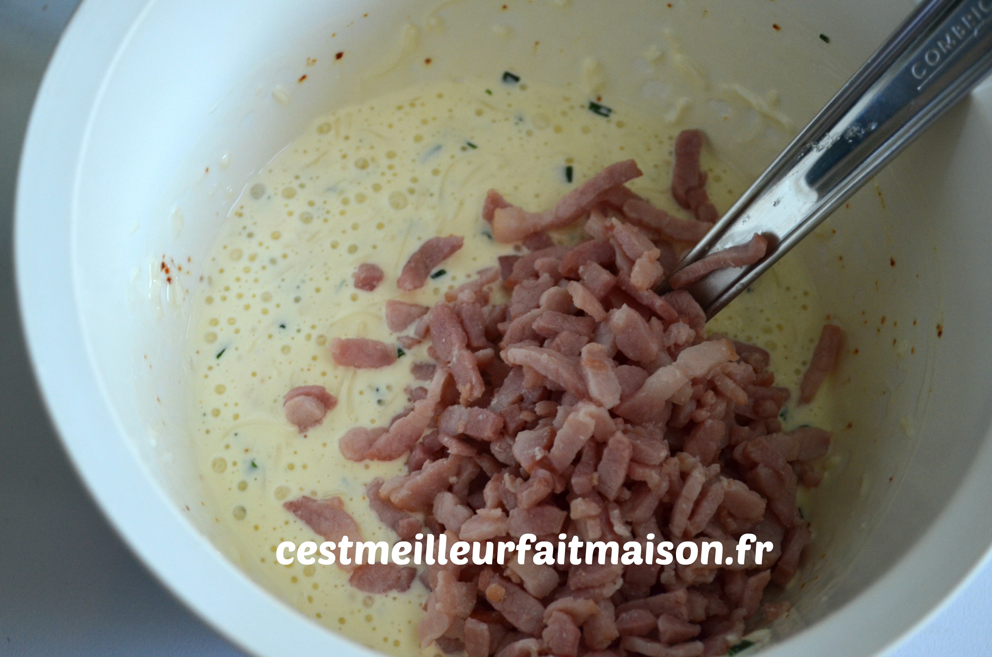 Et pour finir, ajouter les lardons égouttés. Bien mélanger.