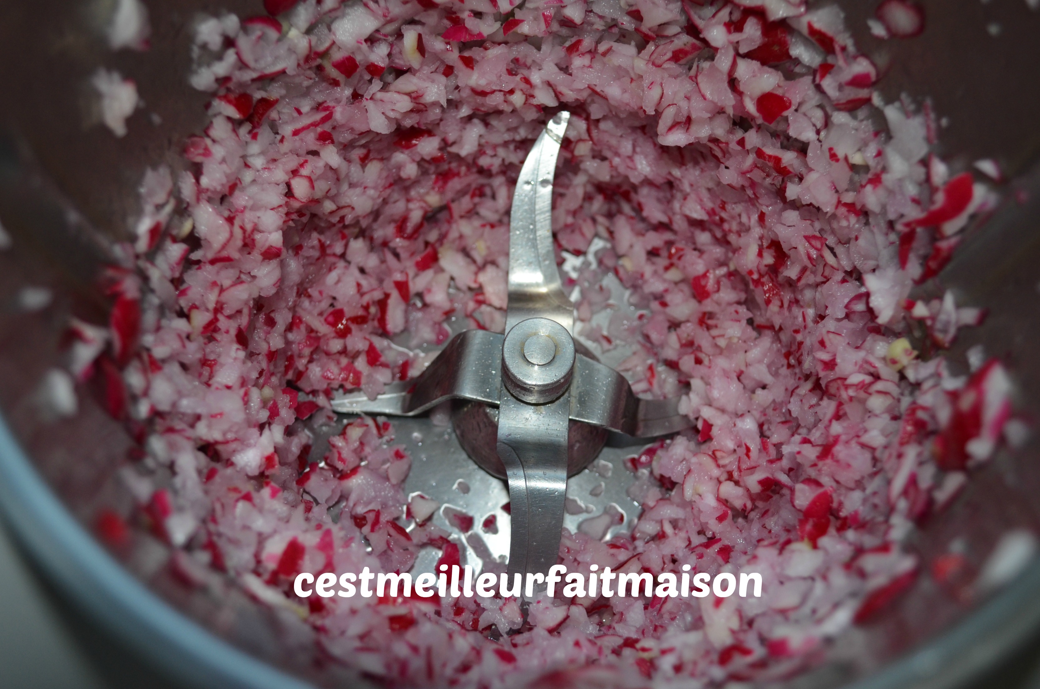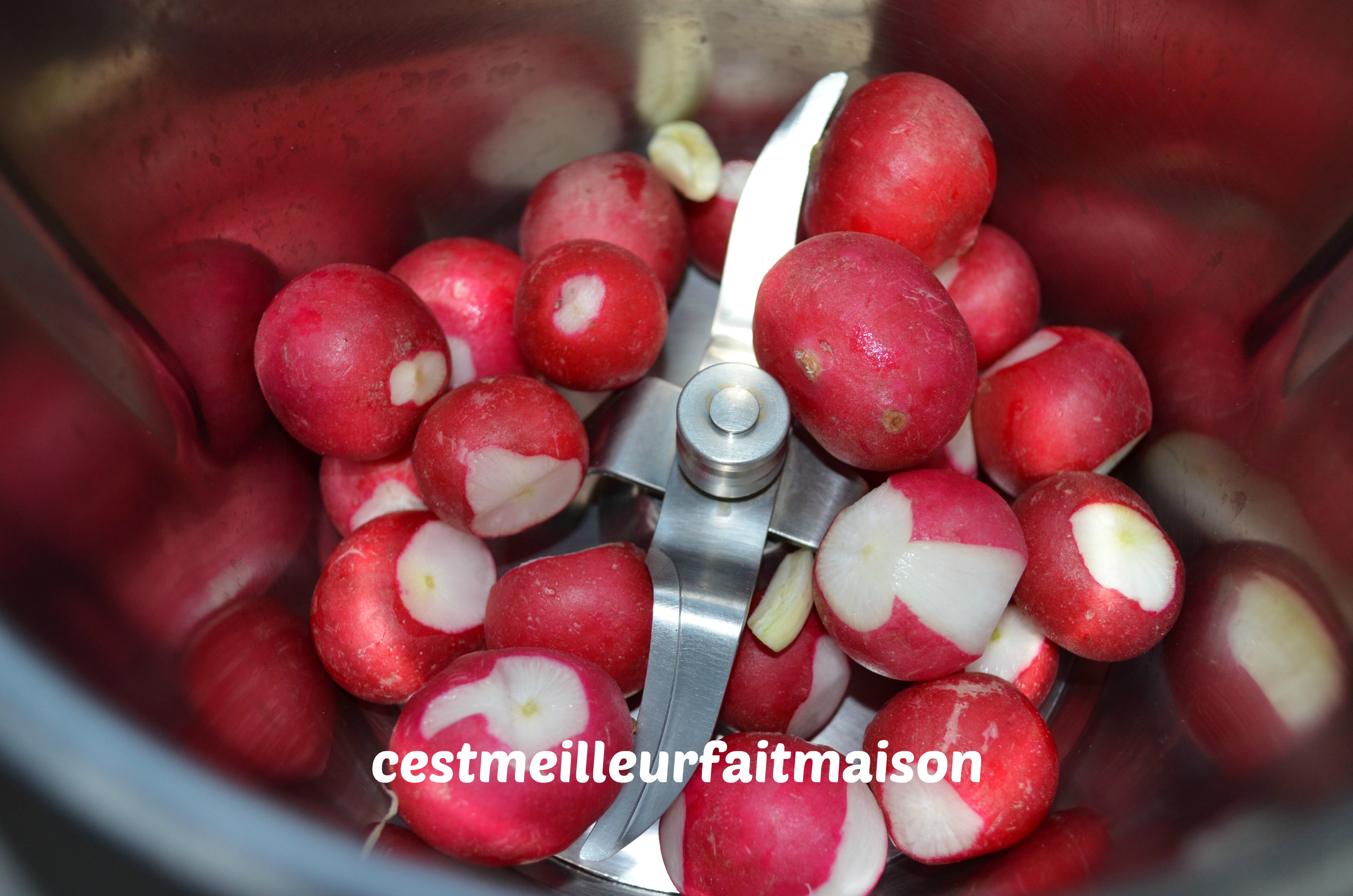 1- Mettre l’ail et les radis dans le bol du Thermomix et mixer 3 ou 4 sec/Vit 5.