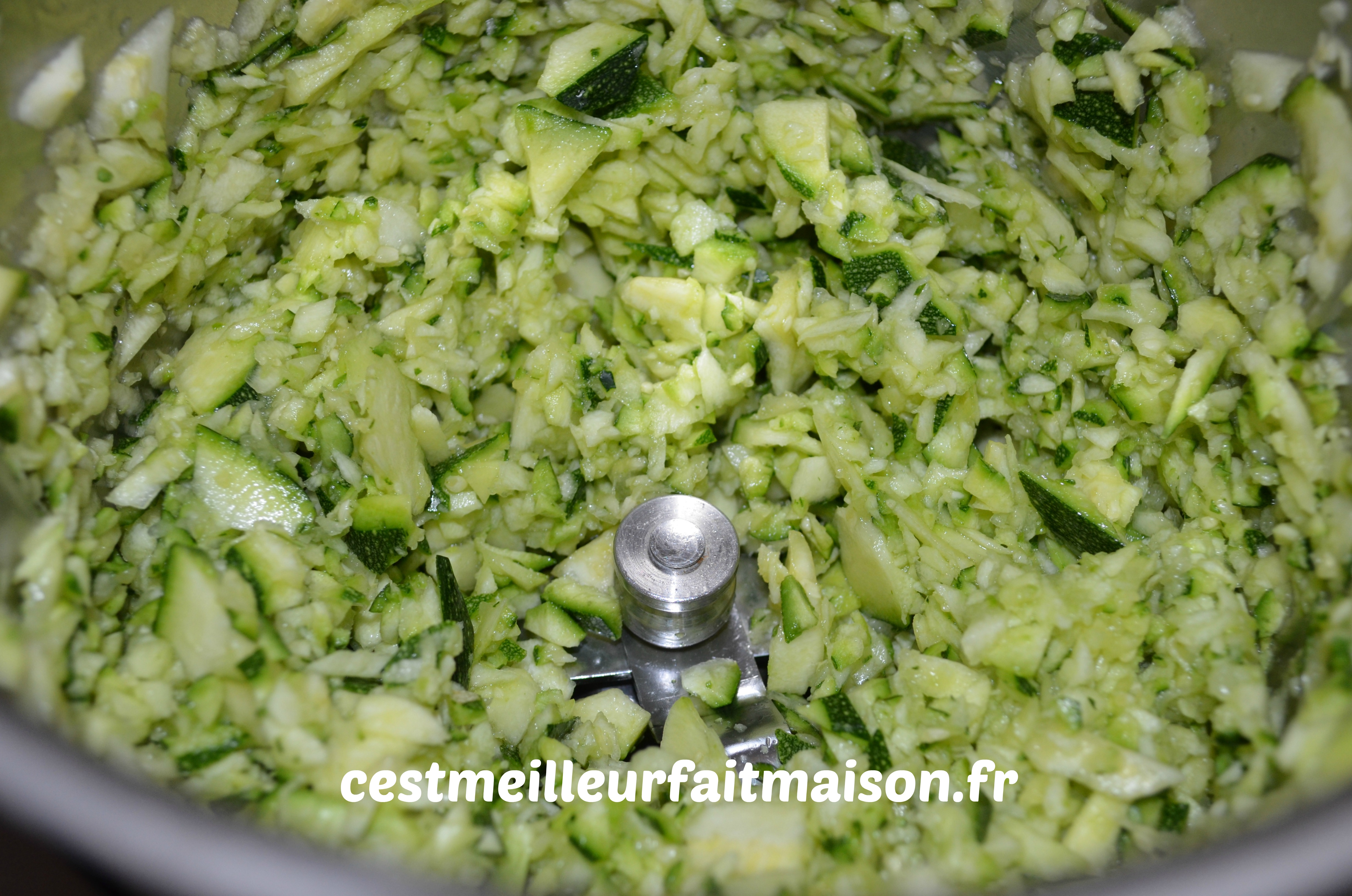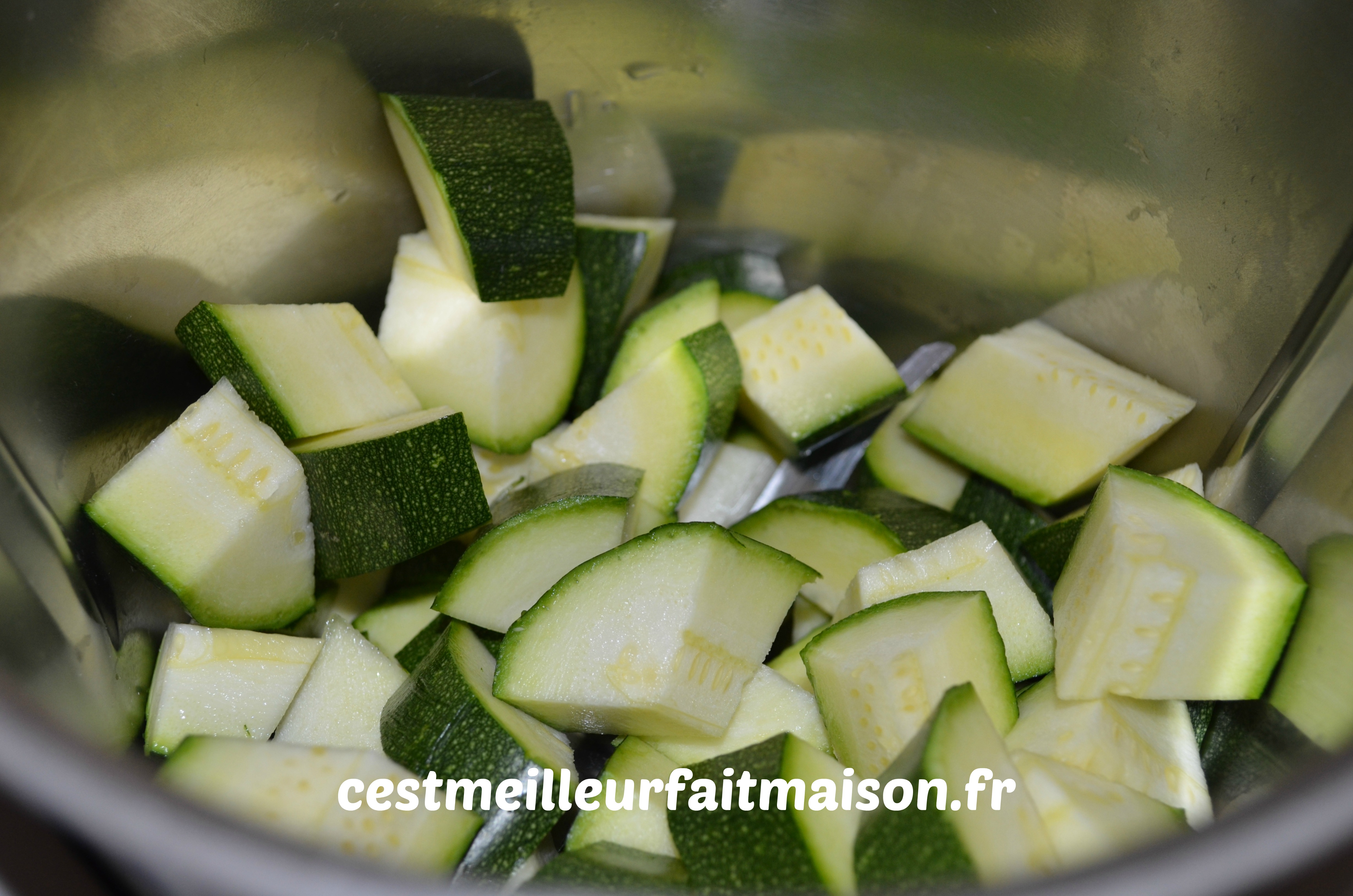 Couper le reste des courgettes en gros cubes et les mettre dans le bol du Thermomix. Mixer 5 sec/Vit 5. On peut aussi choisir de les râper  avec un autre robot. Réserver.