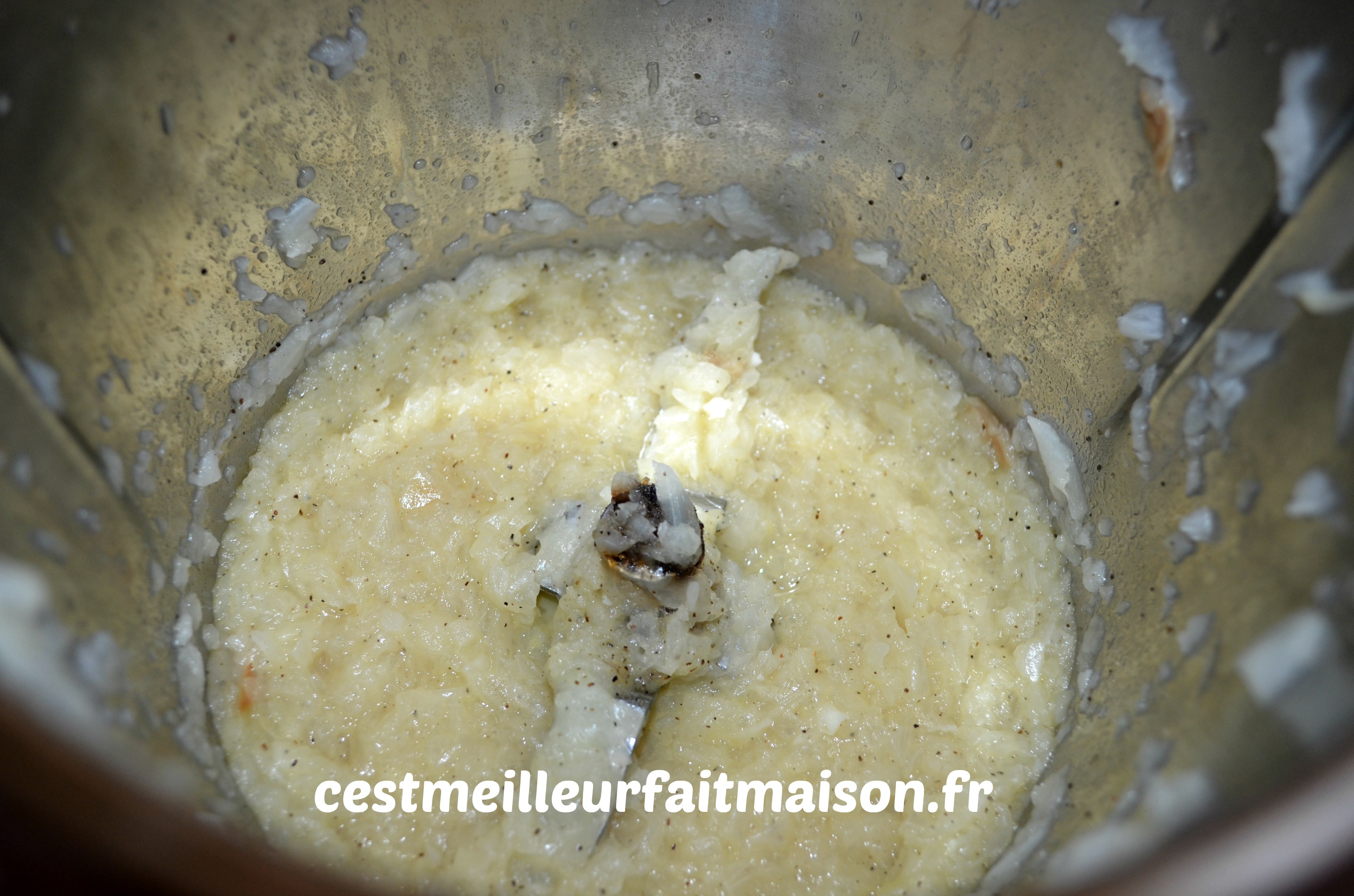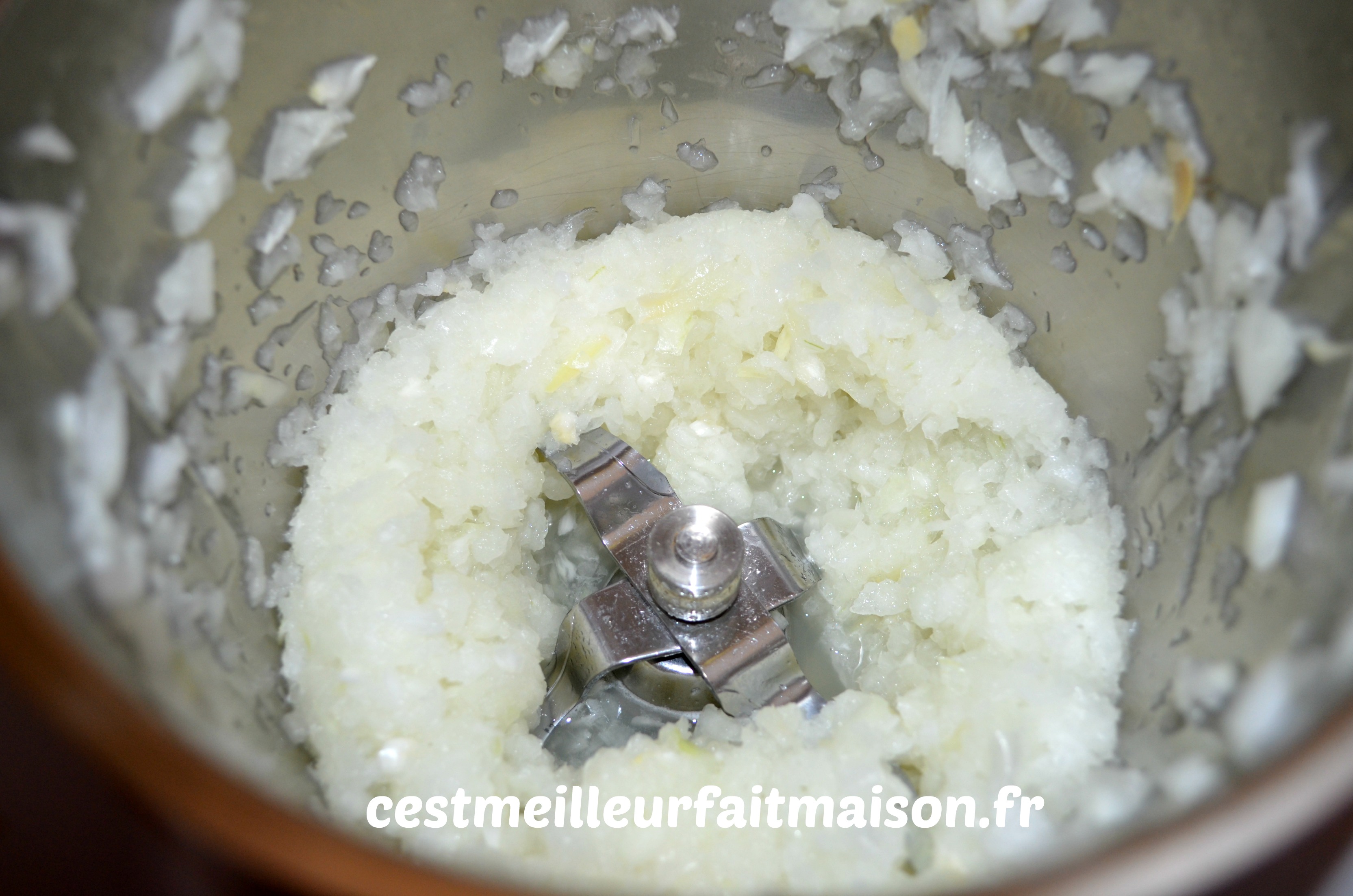 1- Éplucher les oignons, les couper en quatre et les mettre dans le bol du Thermomix. Mixer 5 sec/Vit 5.