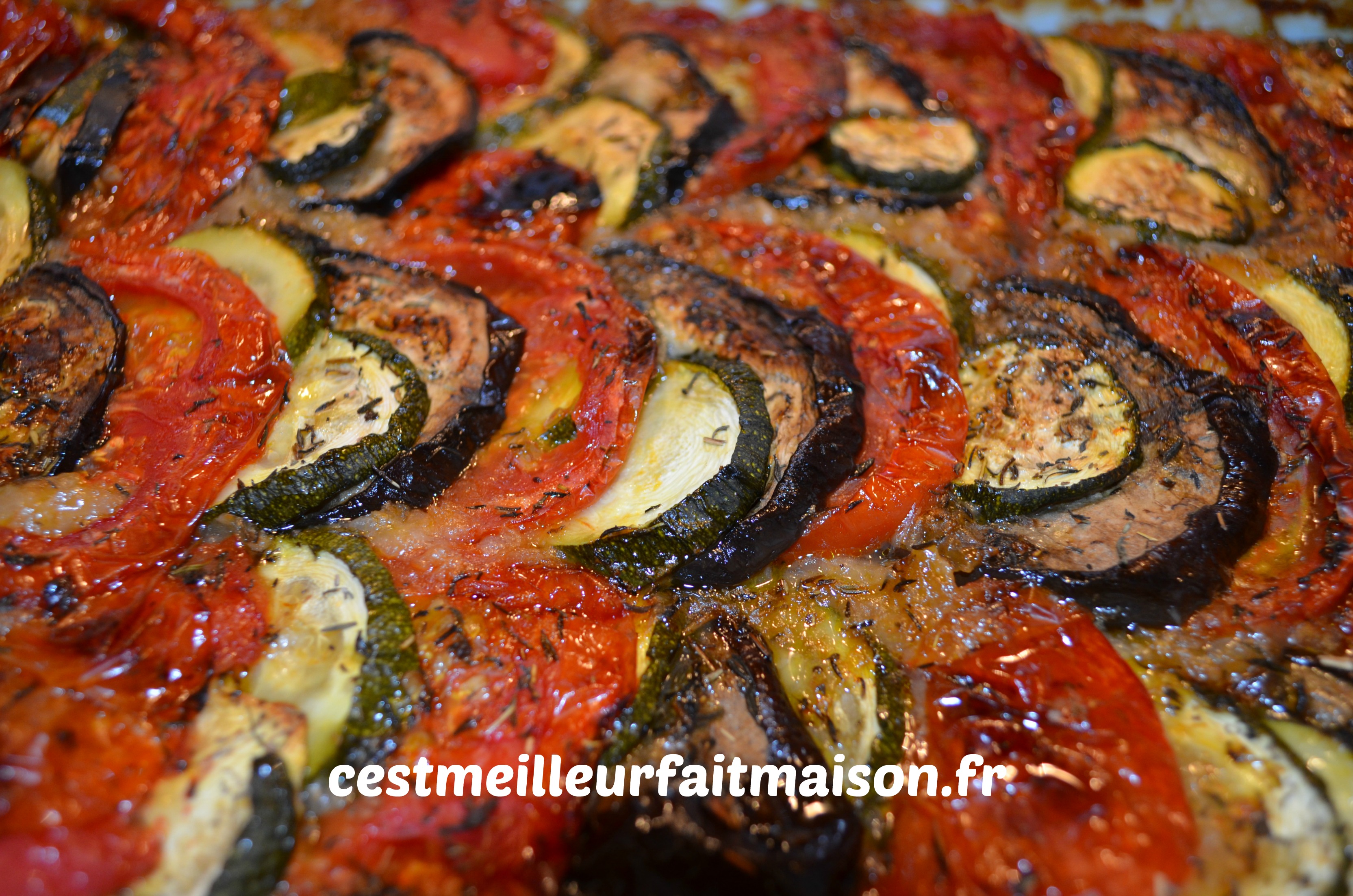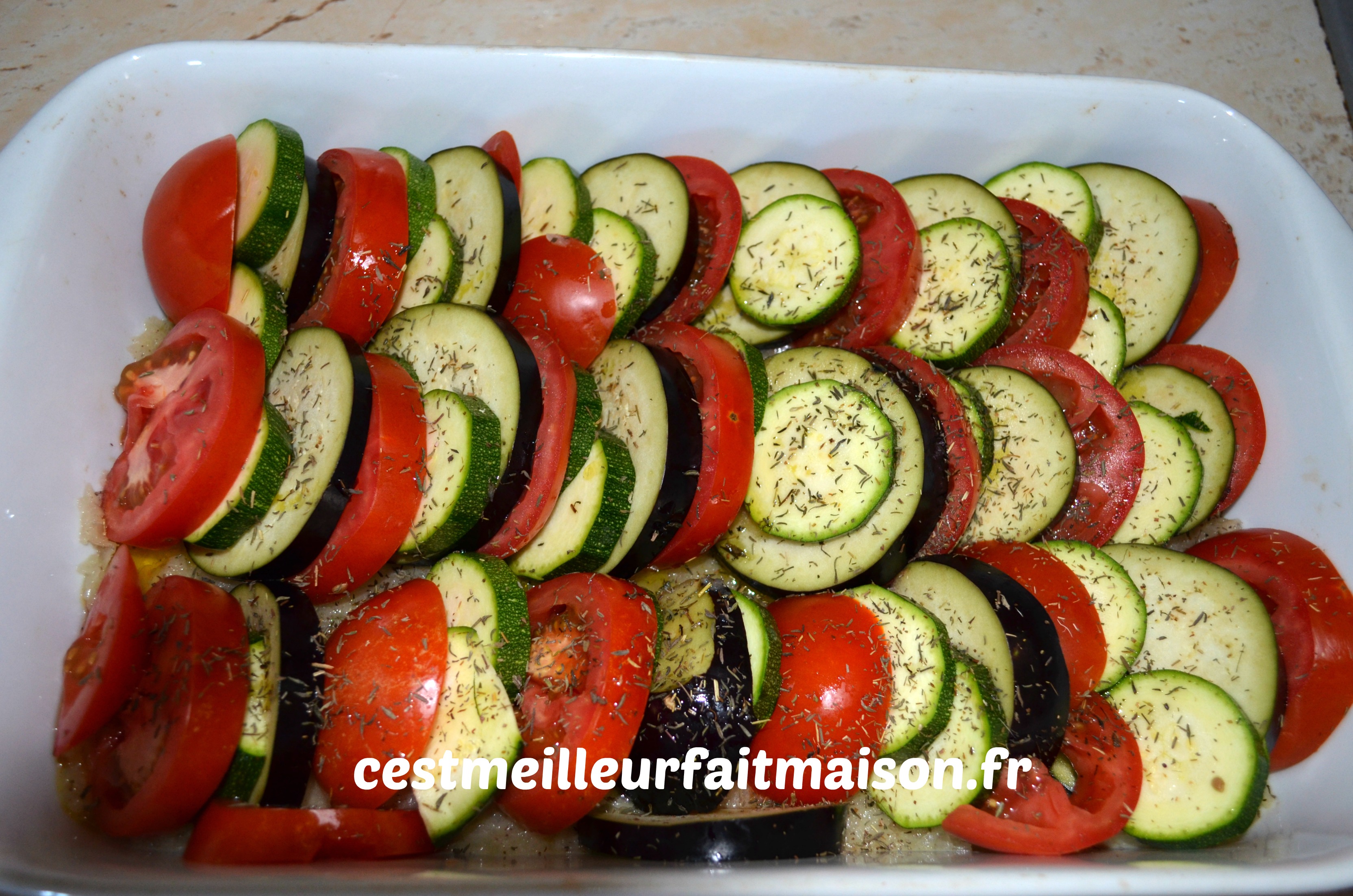 4- Disposer les légumes dans le plat en les alternant. Verser un filet d’huile d’olive, saler, poivrer et saupoudrer de thym.