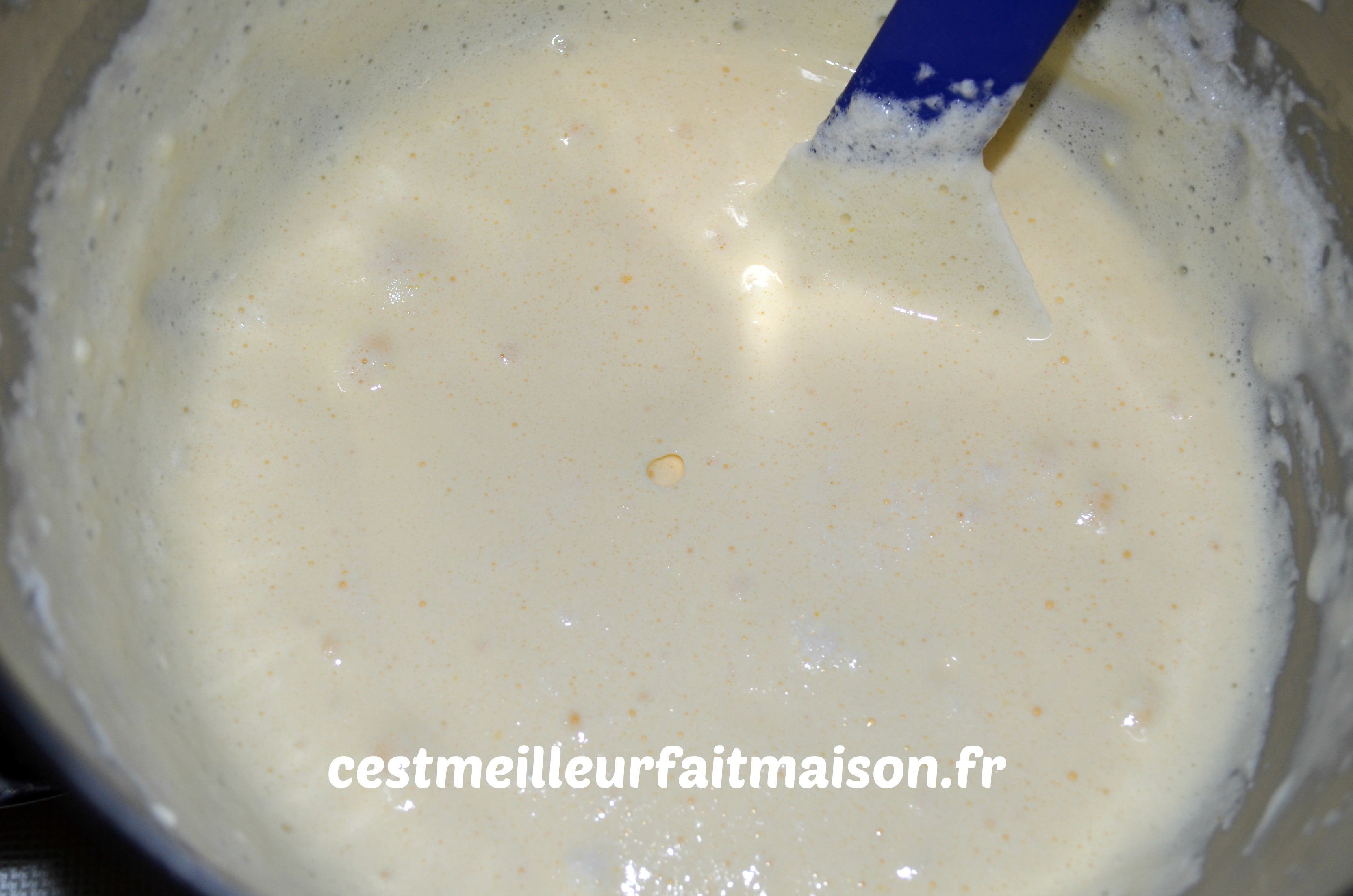 3- Battre les blancs d’œufs en neige ferme. Les ajouter à la préparation précédente en mélangeant délicatement à l’aide d’une maryse.