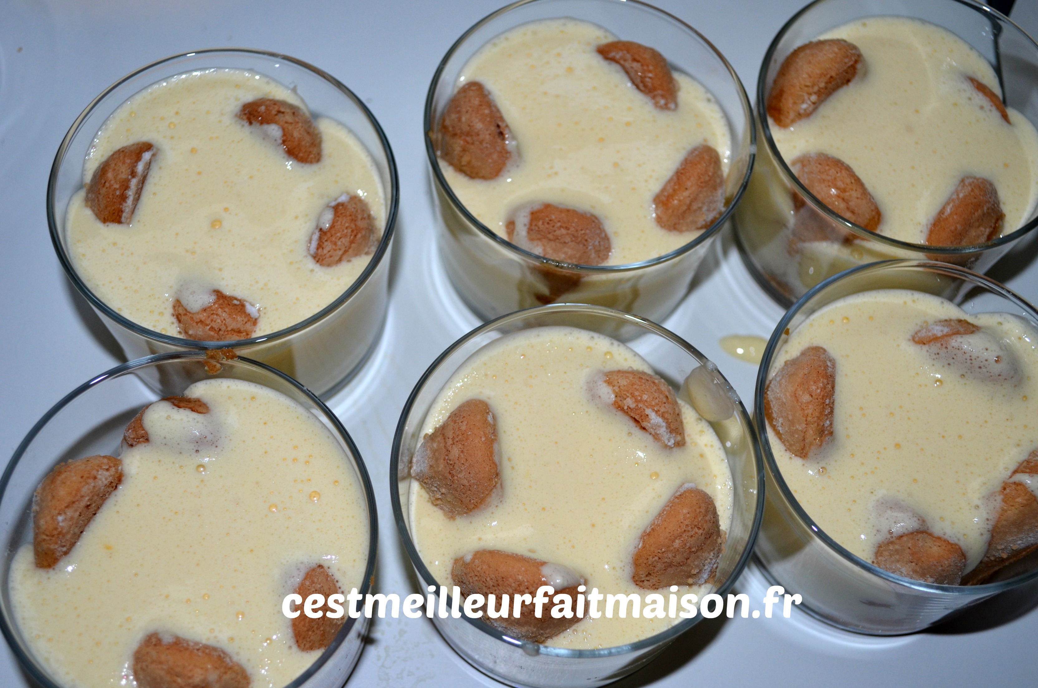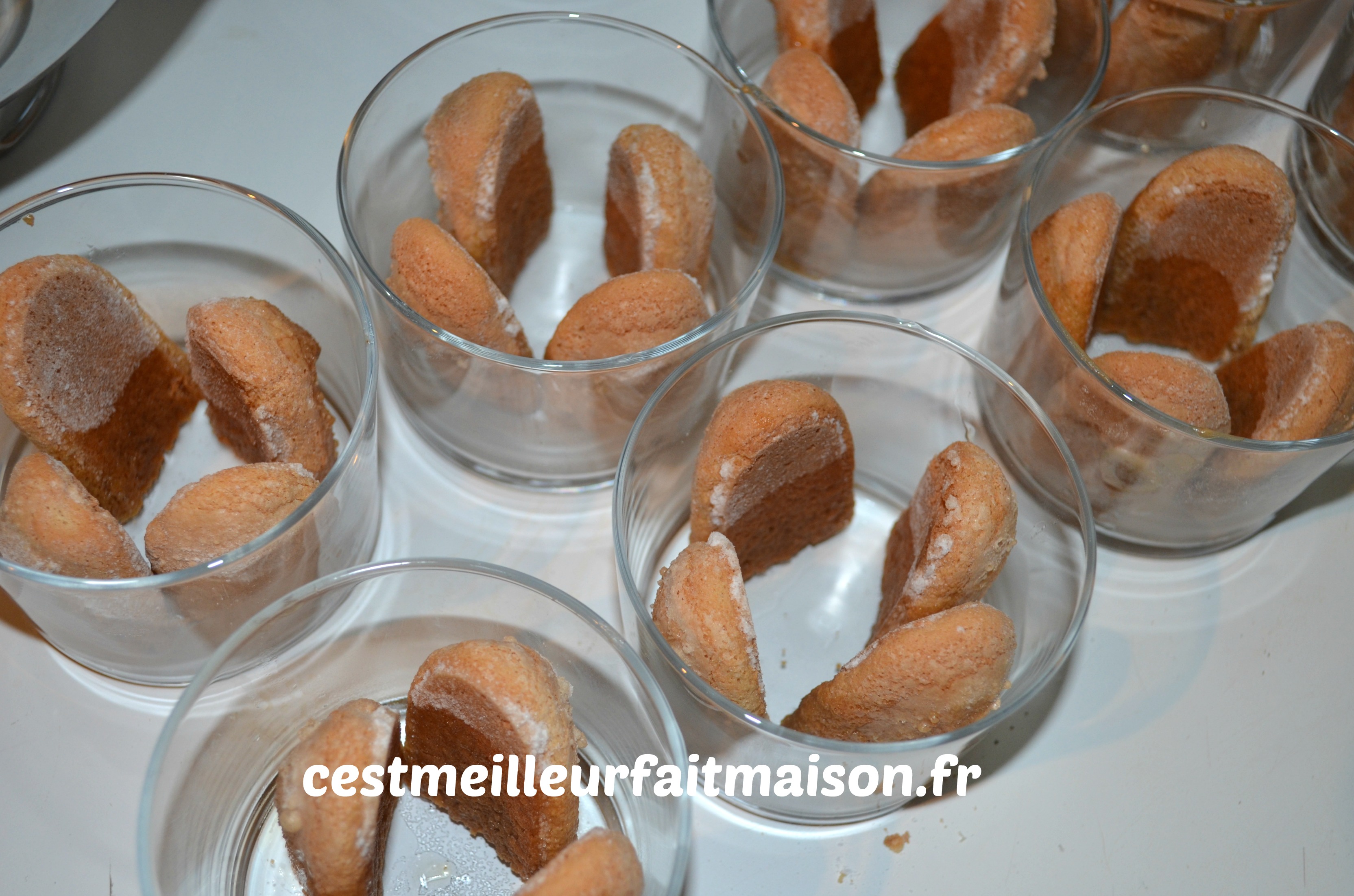 4- Tremper les biscuits à la cuillère dans le café et les poser dans les contenants choisis. Verser la crème et réfrigérer.