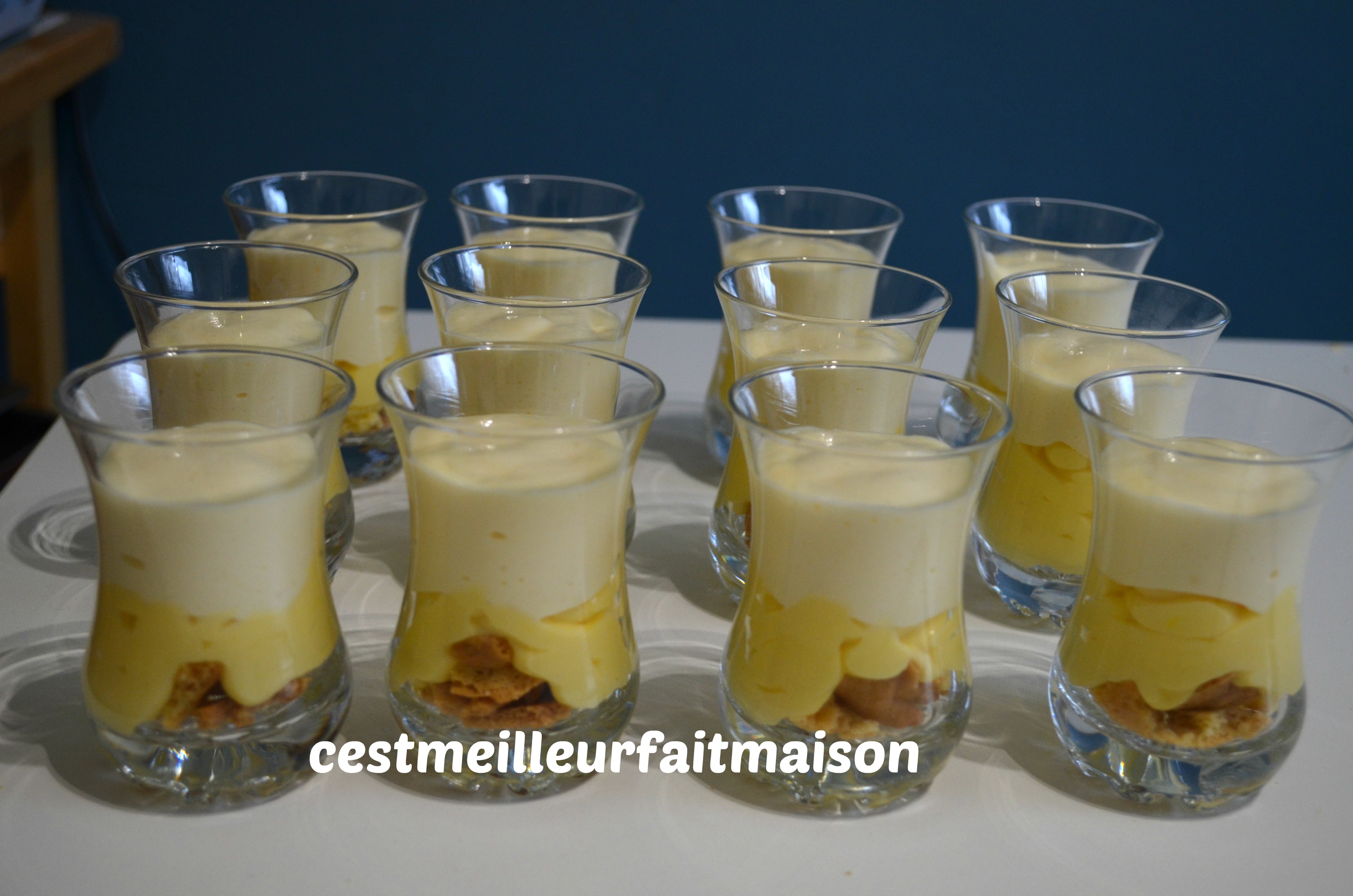 Pour cette fois, j’ai servi ce dessert dans des petites verrines car j’avais aussi préparé des mousses au chocolat d’Albert. Si vous ne faites qu’un dessert, c’est plus sympa dans des verrines plus grandes.
