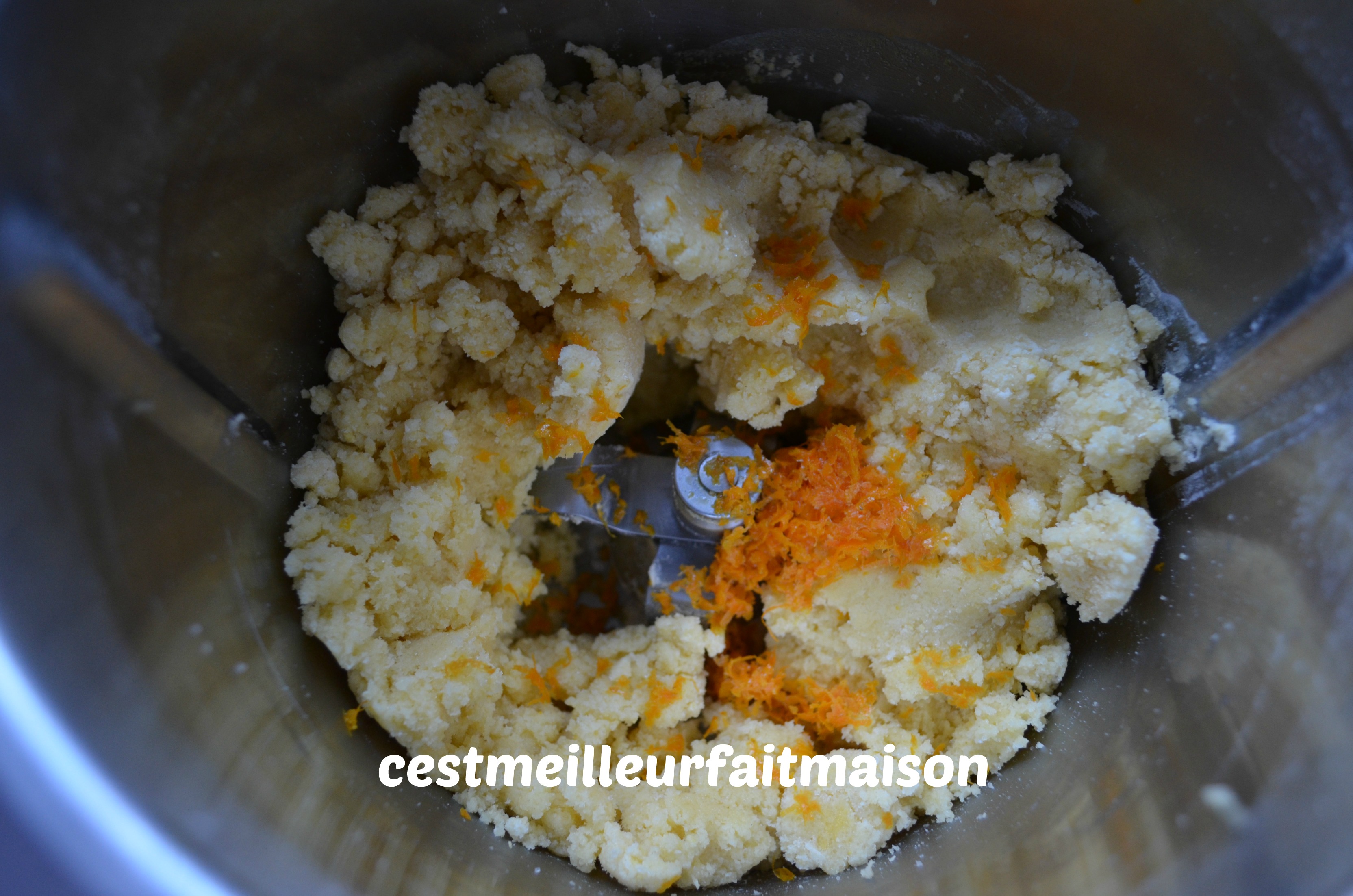 1- Dans le bol du Thermomix, mettre tous les ingrédients de la pâte sablée sans les zestes de l’orange. Mélanger 10 sec/Vit 5.